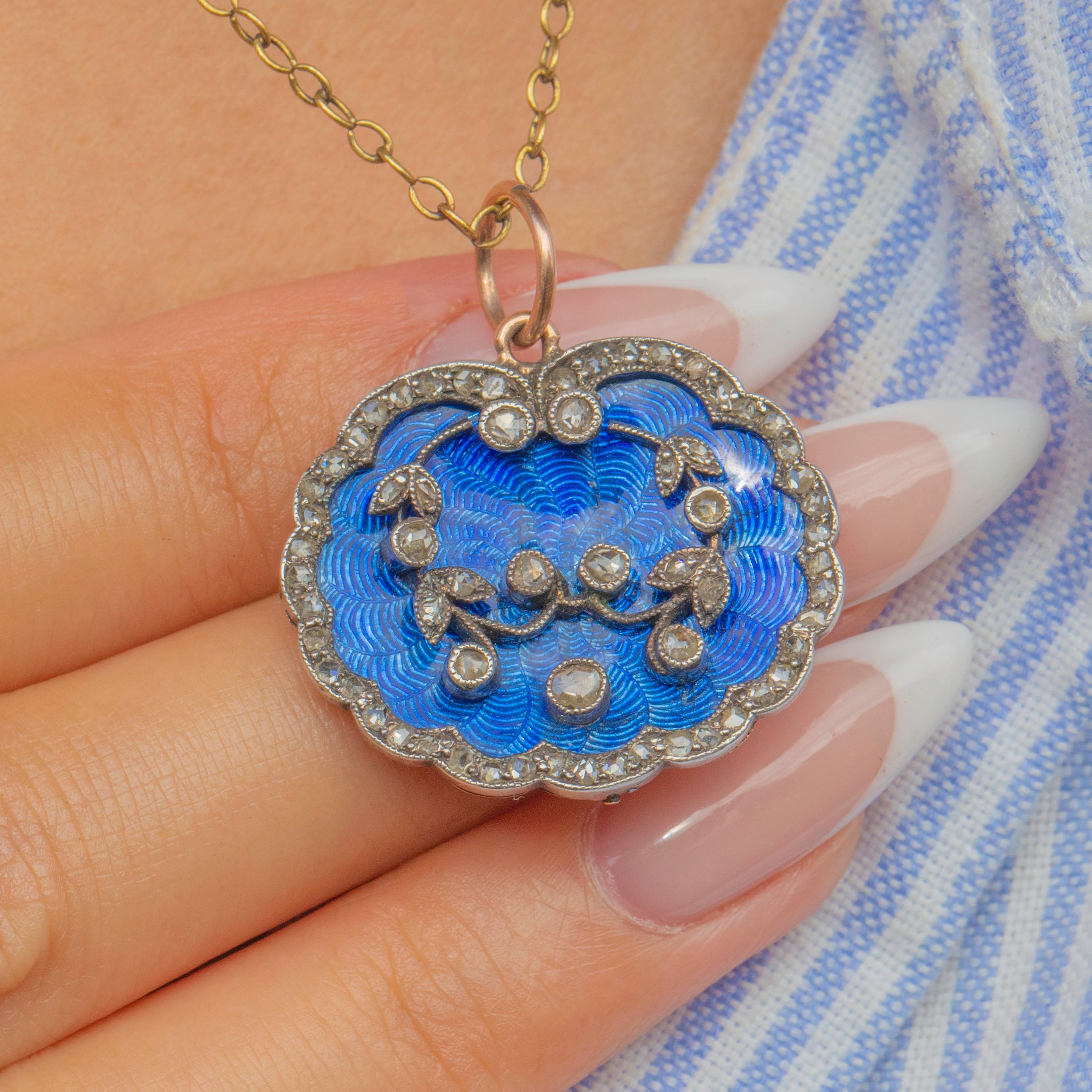Belle Époque 15ct Gold & Silver Blue Guilloché Enamel & Rose-Cut Diamond Pendant, c.1890