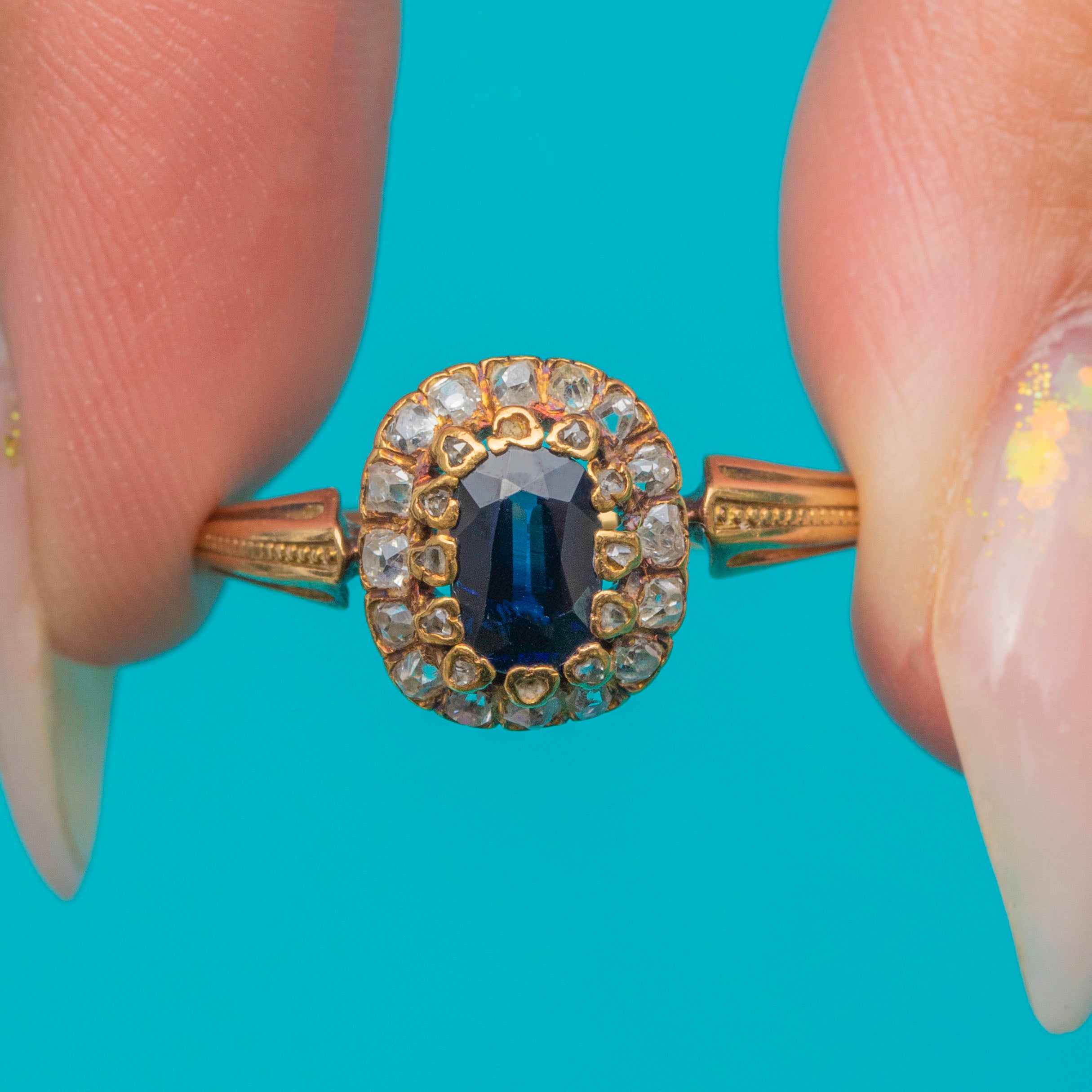 A charming French Belle Époque cluster ring in 18ct Gold, set with a rich deep blue oval Sapphire surrounded by a halo of glittering old-cut Diamonds. The stones are beautifully proportioned, with the Diamonds adding a soft sparkle that enhances the intensity of the Sapphire’s colour.
