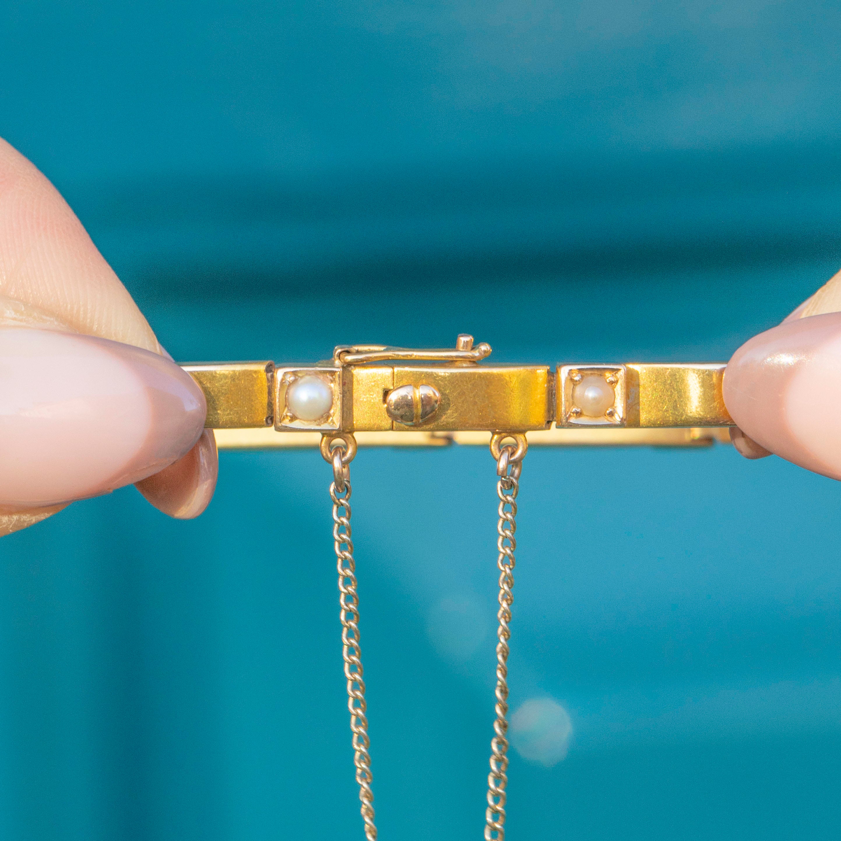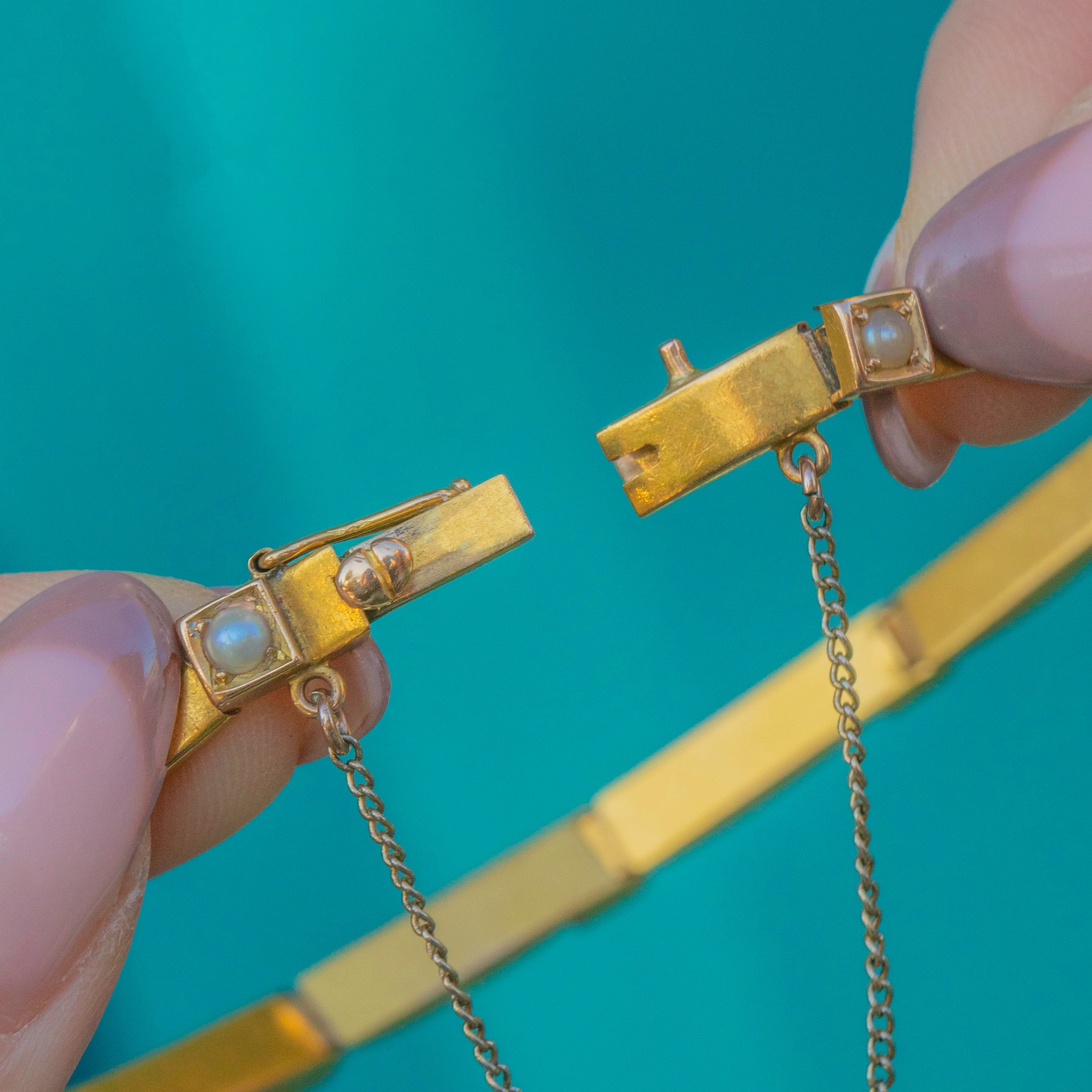 EXCELLENT. This chic antique 18ct Gold Pearl bracelet is in excellent antique condition. The 18ct Gold links exhibit a beautifully saturated tone with no significant tarnish, and each Pearl is intact, retaining a natural lustre and smooth surface, although there is some variation to the colour of the Pearls, they are all present and well set into their Gold settings. She’s a truly exquisite statement piece that we’ll never forget !