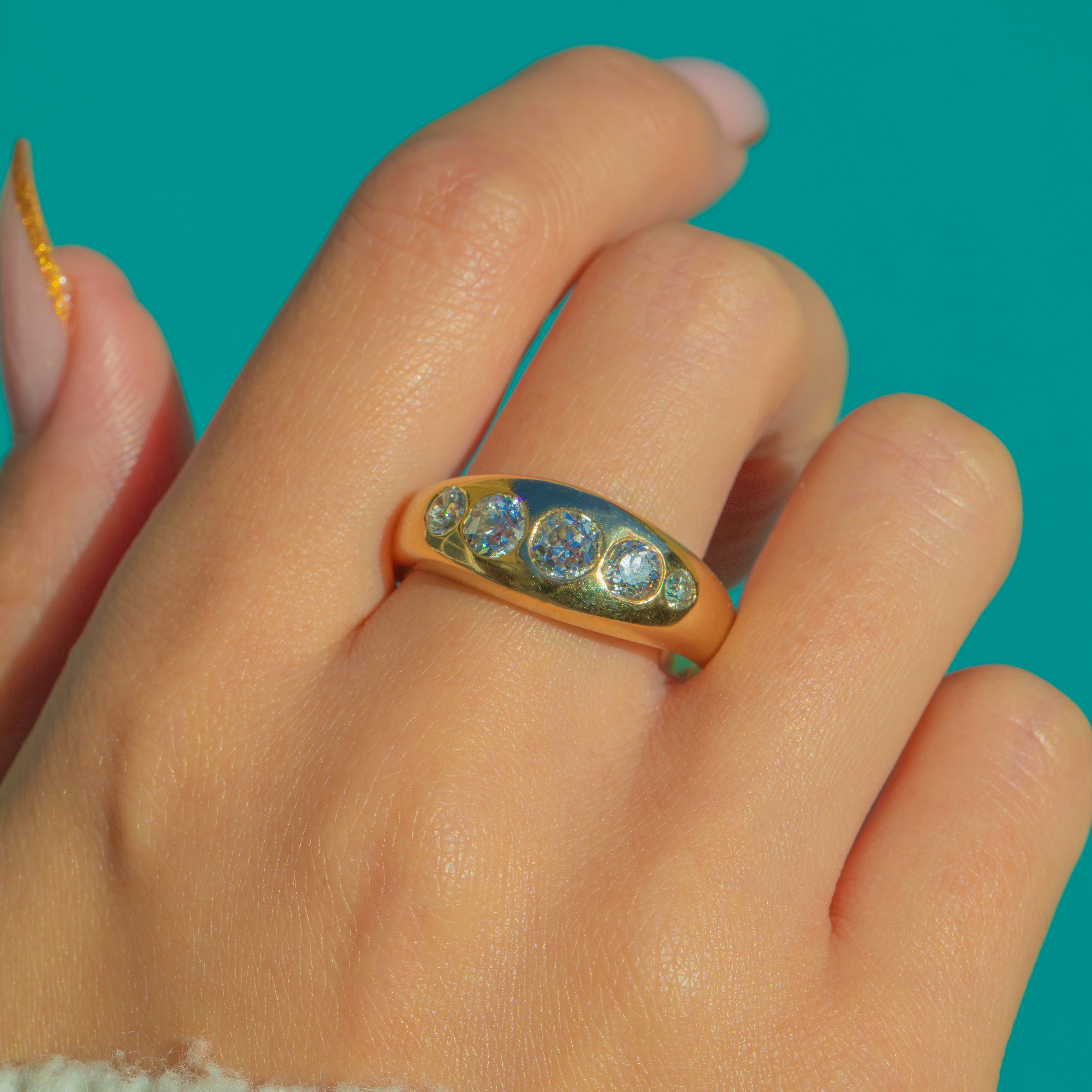 This bold and beautifully executed vintage ring showcases a glorious spread of old cut Diamonds, flush-set into a thick, gleaming band of 14ct Gold. Brimming with antique charm, each Diamond displays the crisp facets, high crowns and lively brilliance that make old cuts so enduringly beloved.