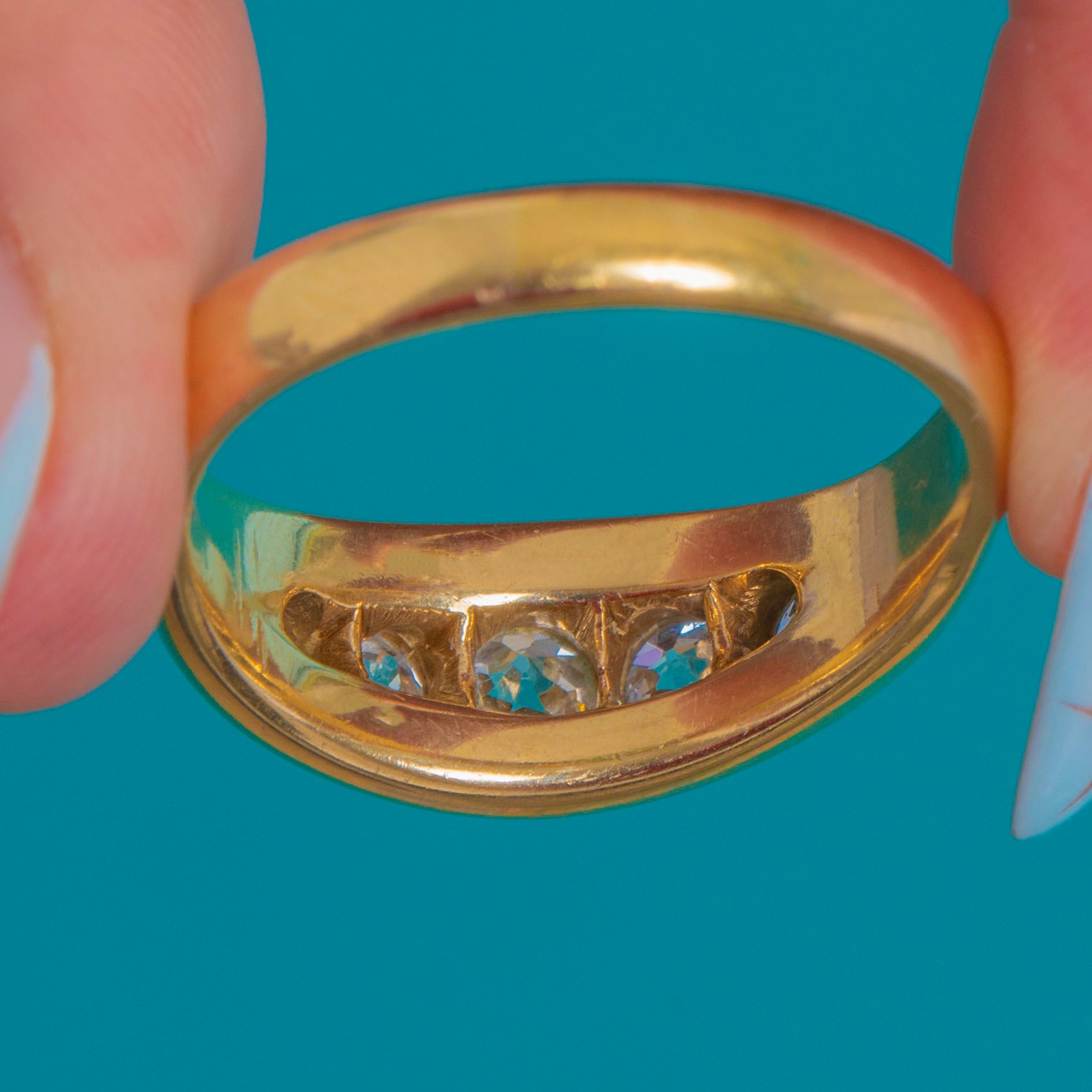 VERY GOOD-EXCELLENT: The Diamonds are bright, clear and well-cut with no chips or damage. The flush settings are secure and enhance their vintage sparkle beautifully. The Gold is smooth with only light wear. The ring has been resized up several sizes in the past, giving the band a slightly elliptical shape; this is purely cosmetic, not visible when worn, comfortable on the finger, and safe to resize again.