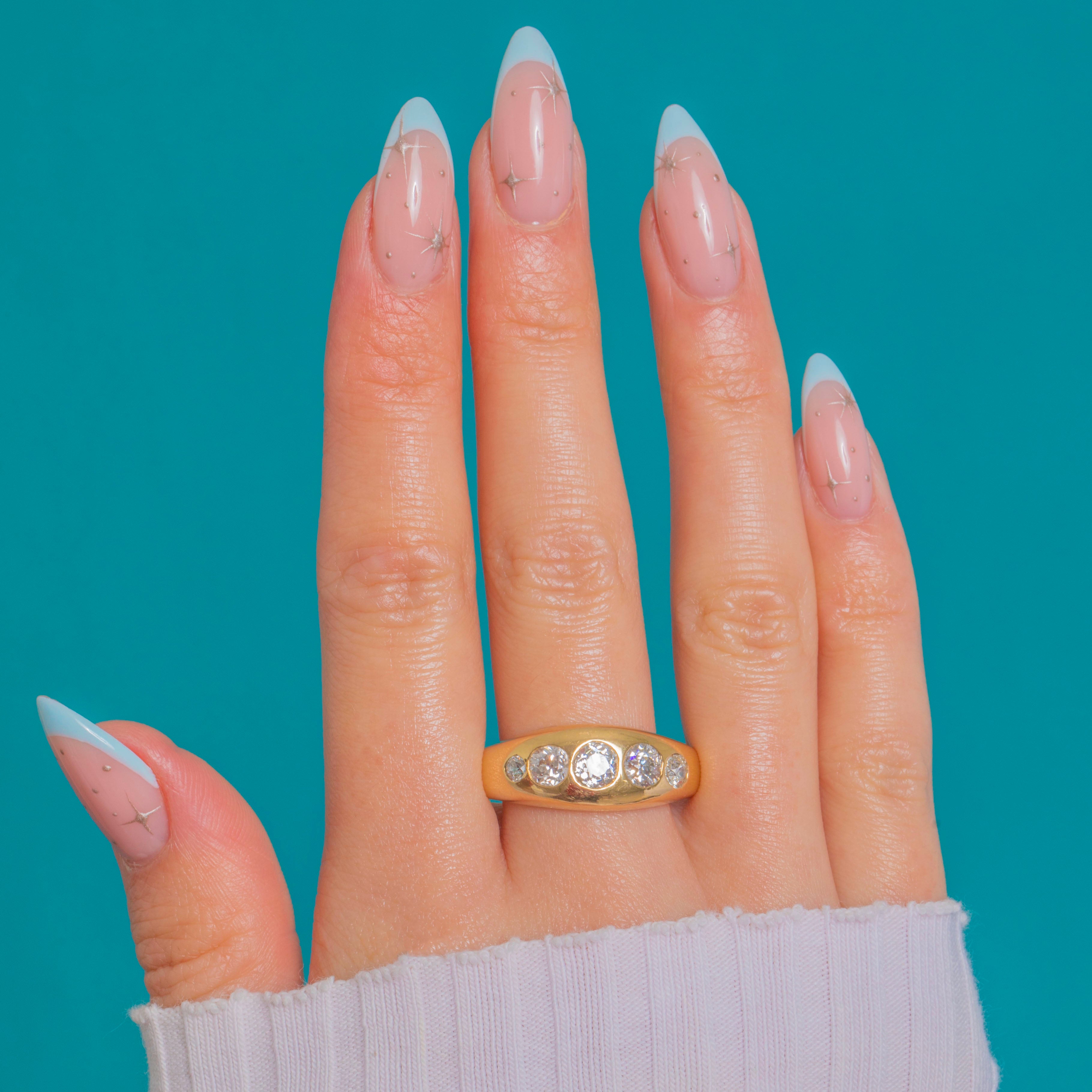 This bold and beautifully executed vintage ring showcases a glorious spread of old cut Diamonds, flush-set into a thick, gleaming band of 14ct Gold. Brimming with vintage charm, each Diamond displays the crisp facets, high crowns and lively brilliance that make old cuts so enduringly beloved.