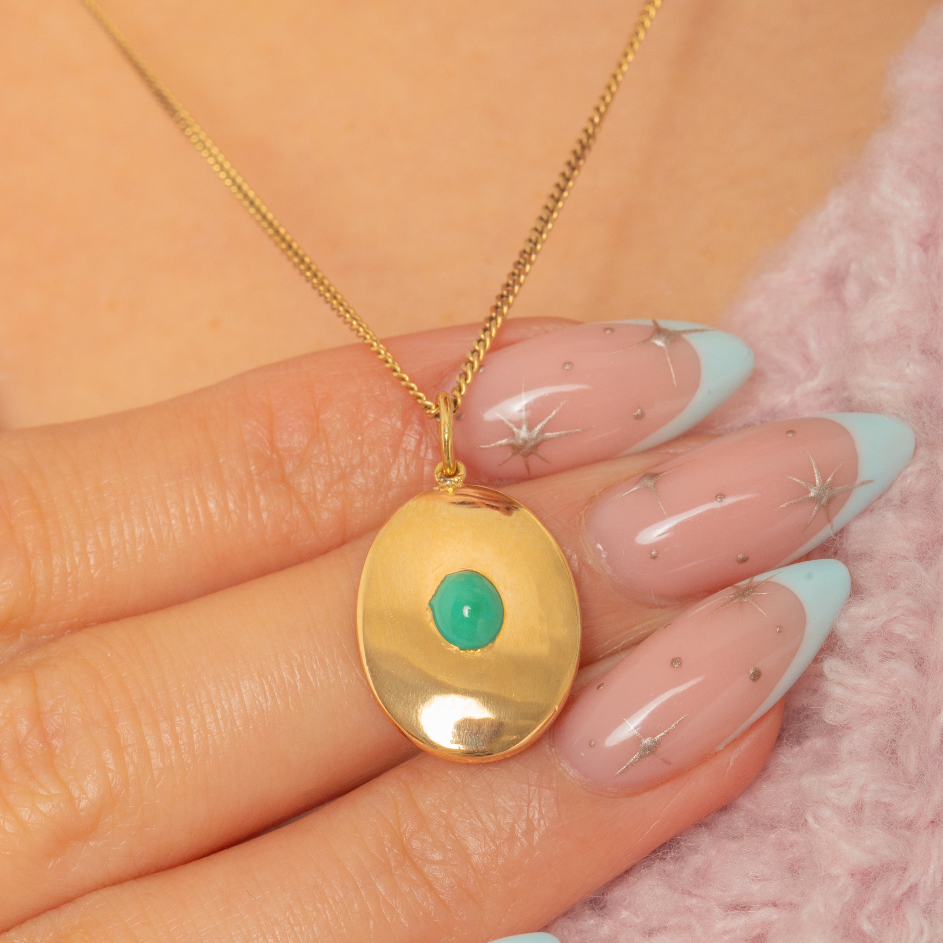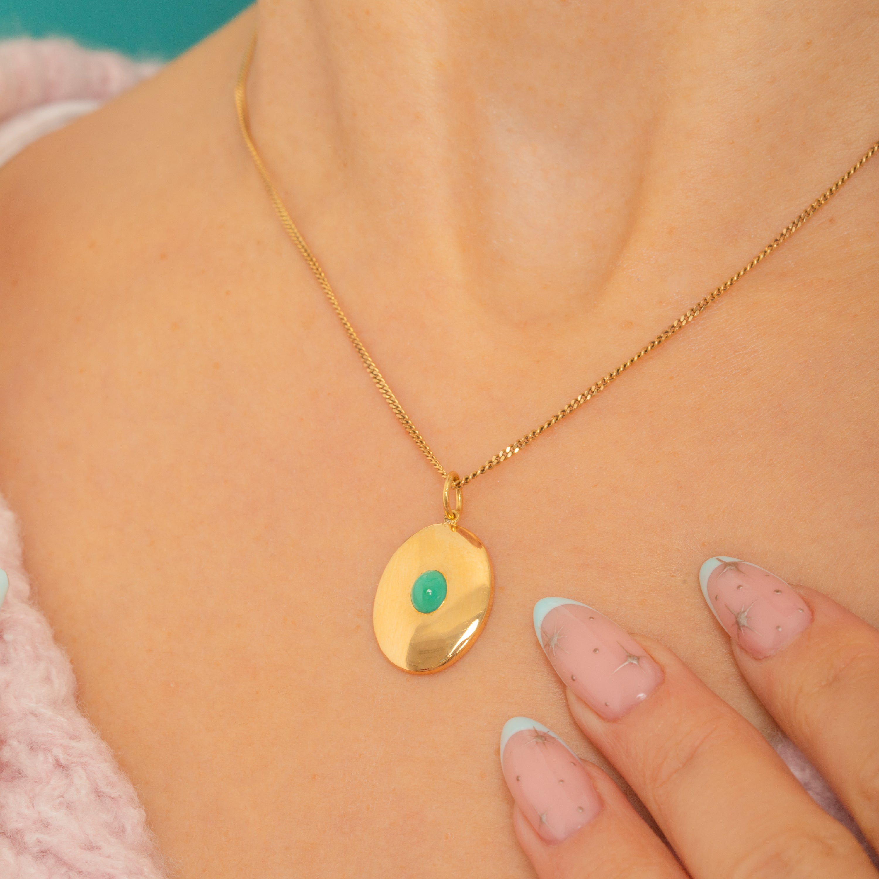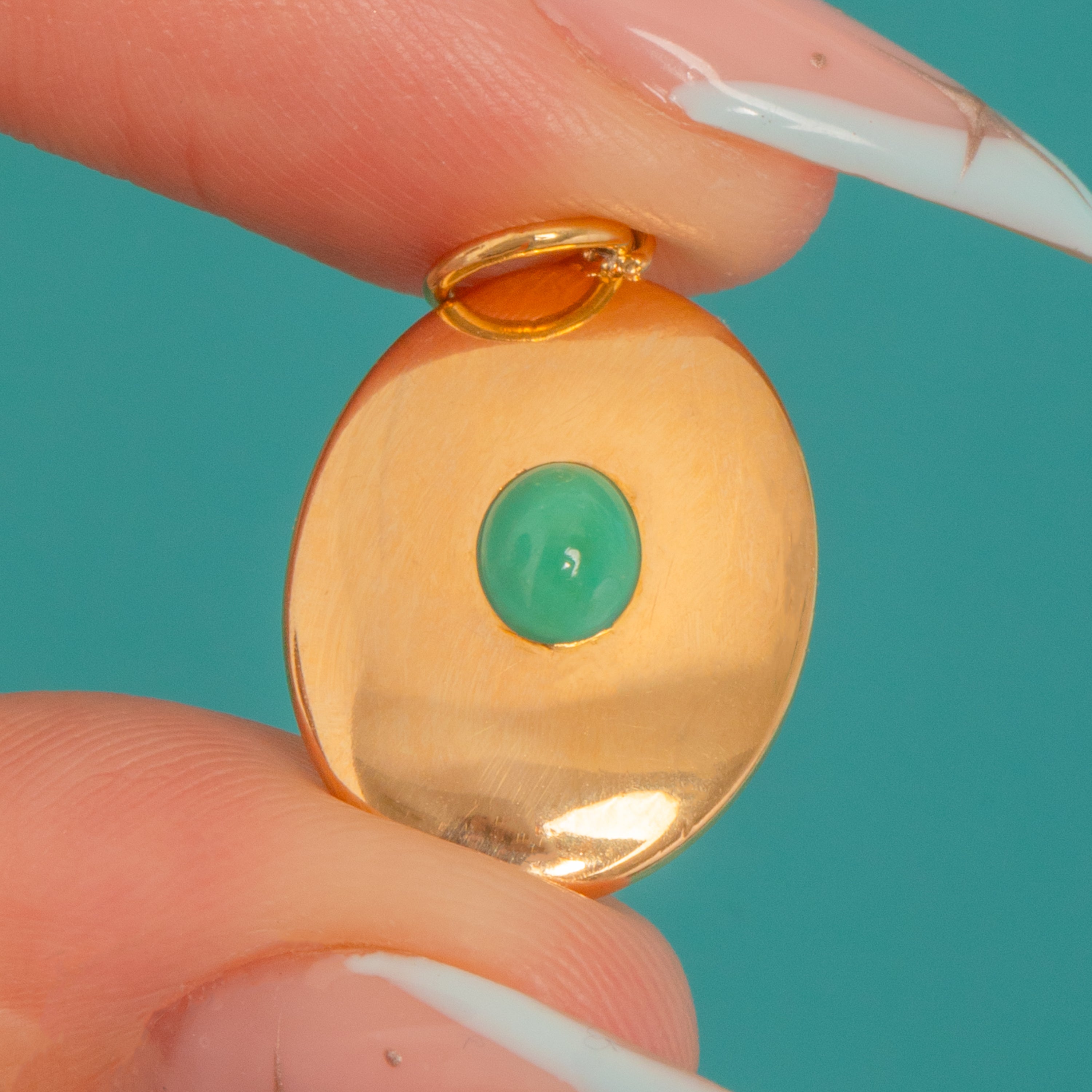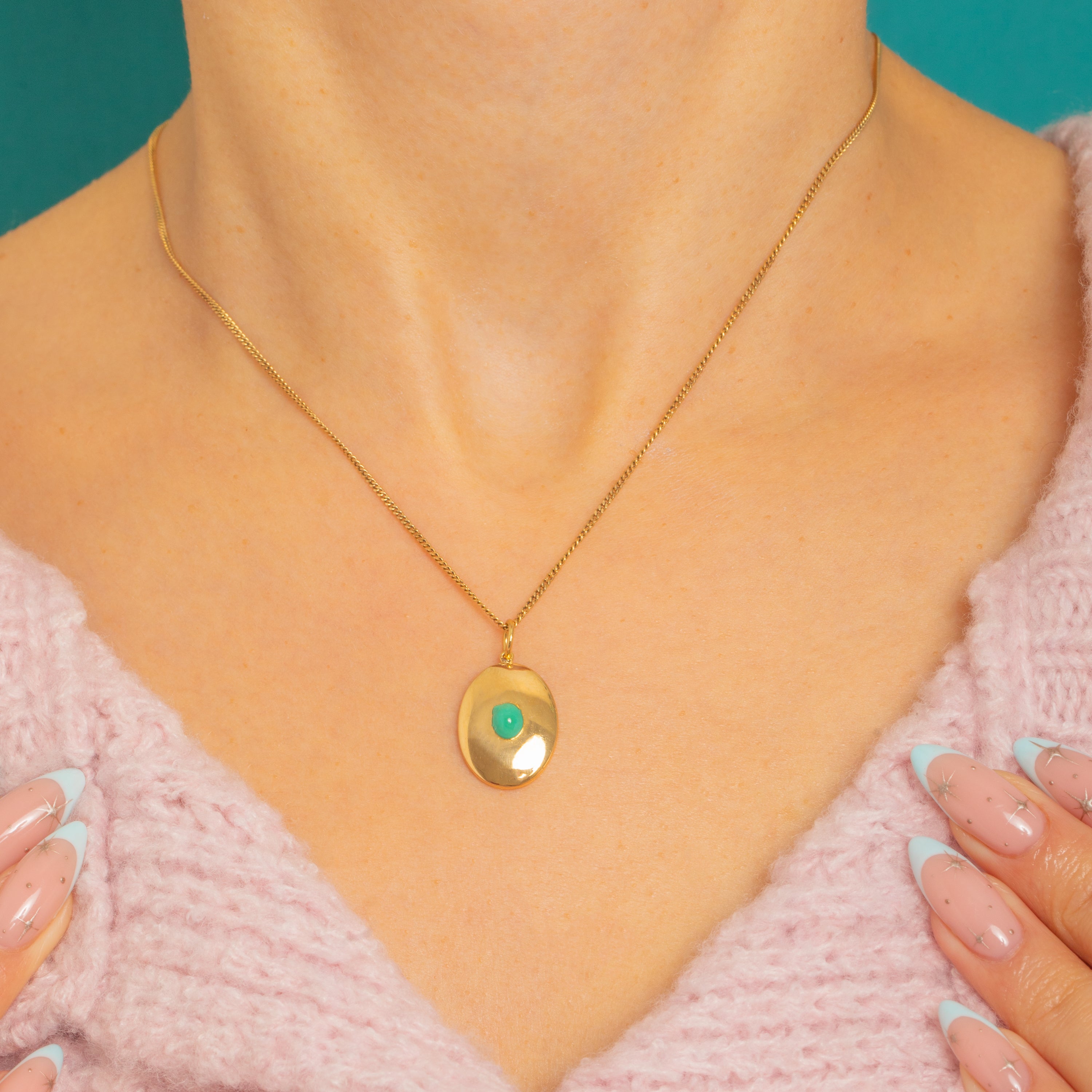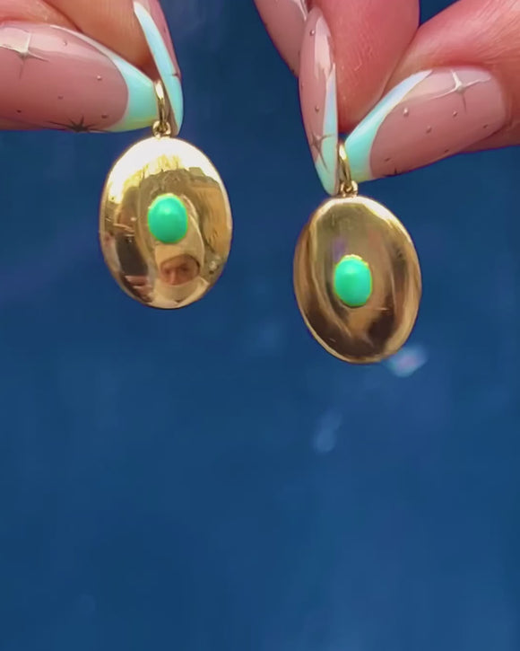 Understated yet luxurious, this Victorian disc pendant is crafted in rich 18ct Gold and centered by a single Turquoise cabochon. The oval plaque is softly domed and mirror-polished, with the gem set flush for a sleek, refined look.