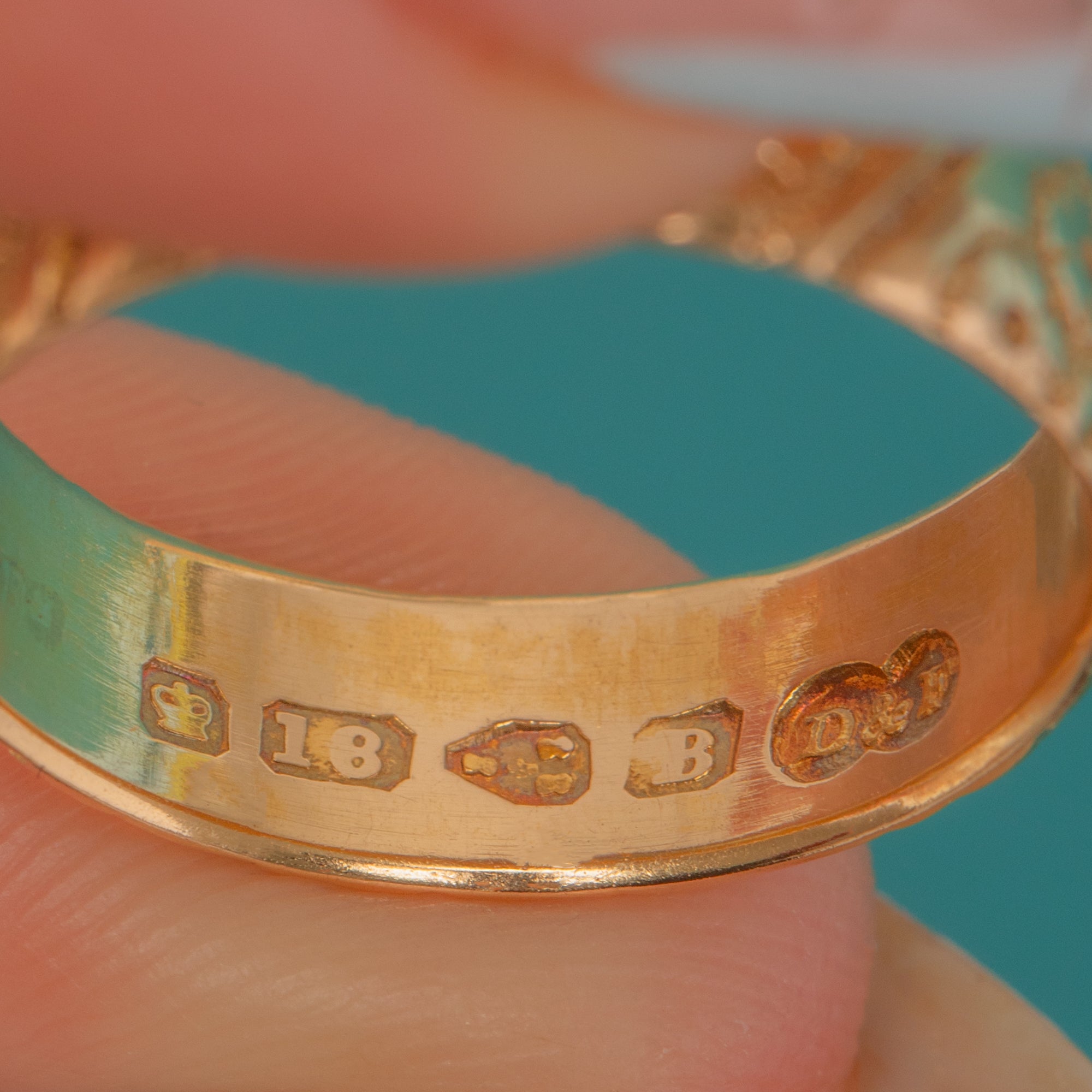 EXCELLENT: The hand-engraved decoration is crisp with only light surface wear and gentle softening to the highest points commensurate with age. The shank is round and sturdy with deeply struck, clear hallmarks inside; no evidence of resizing or repairs.