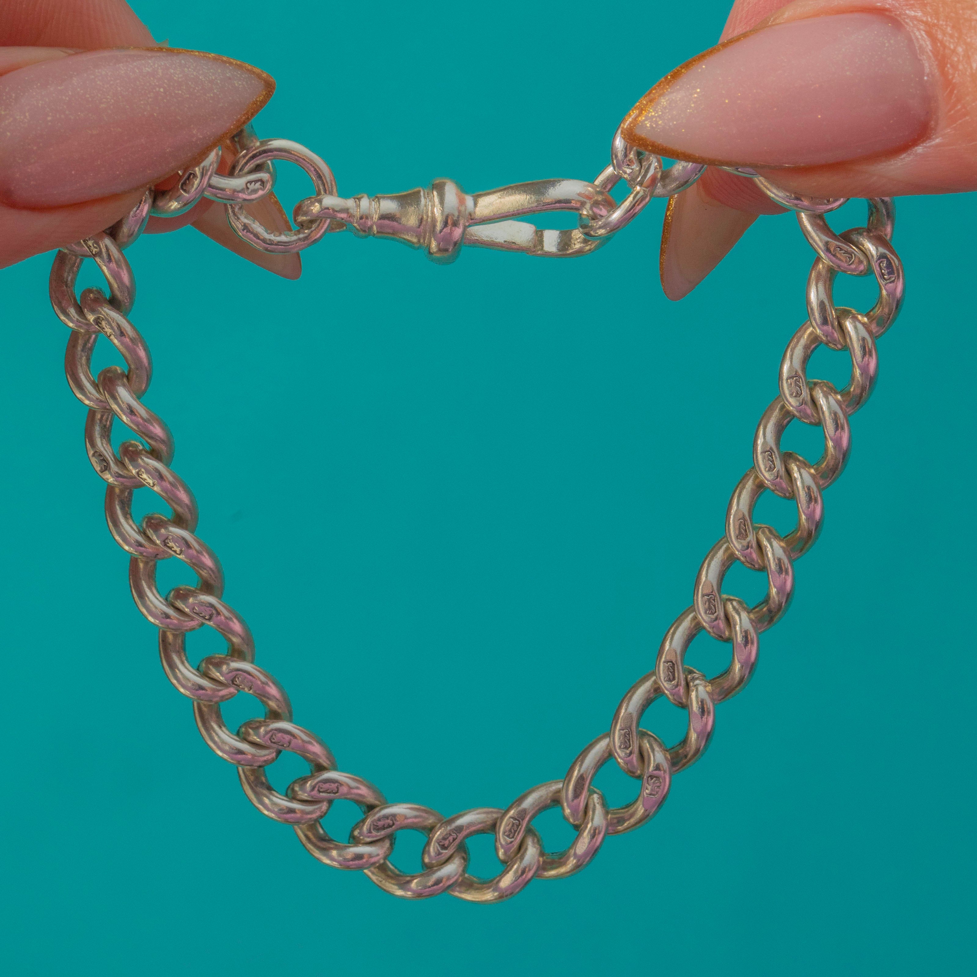 Each chunky link bears a crisp Lion Passant mark, confirming its fine Sterling quality, while the dog clip is stamped “925”. A timeless piece, perfect for layering with charms or worn alone for understated antique style.