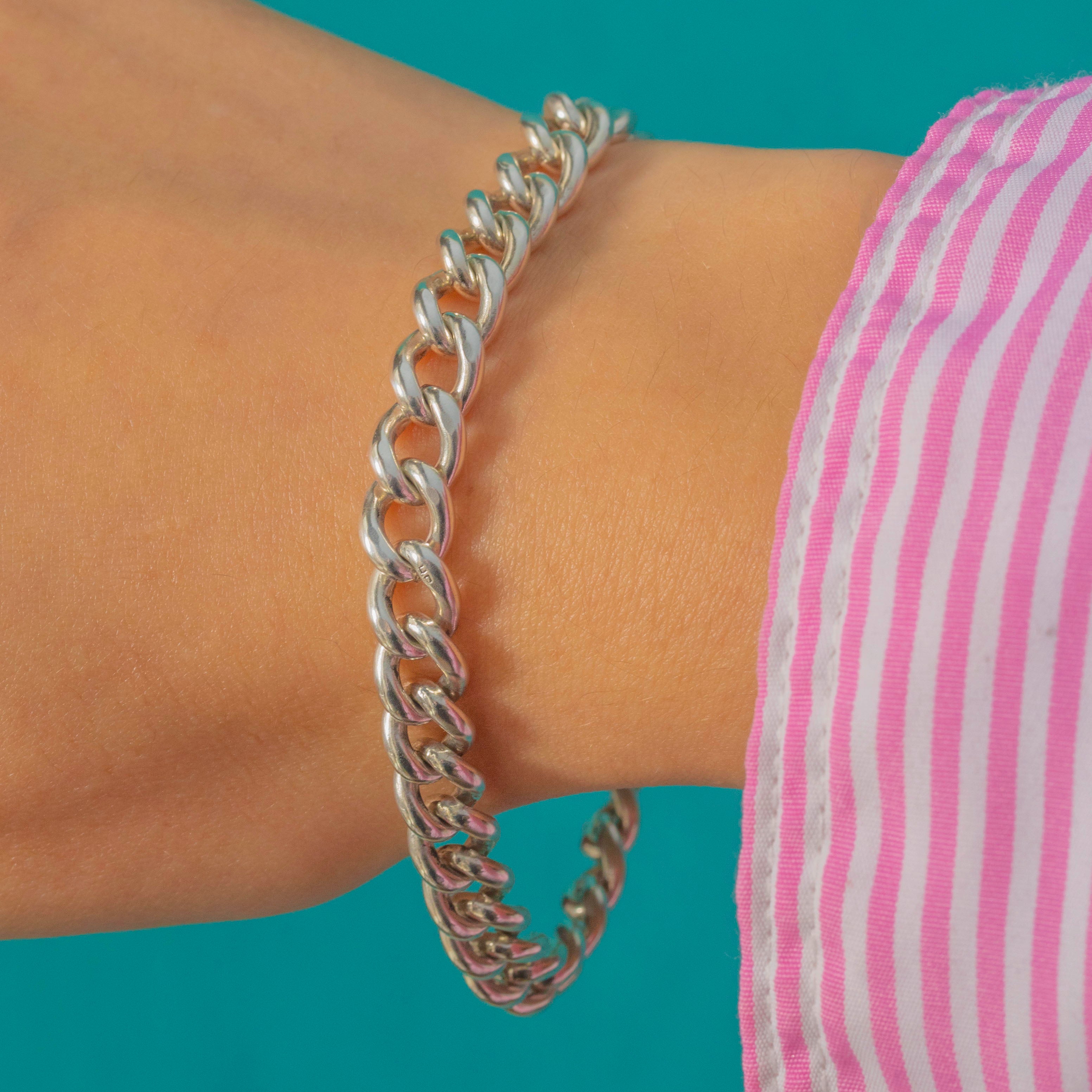 This classic Victorian Sterling Silver curb bracelet features solid, weighty links and its original antique dog-clip clasp, a signature of turn-of-the-century design.