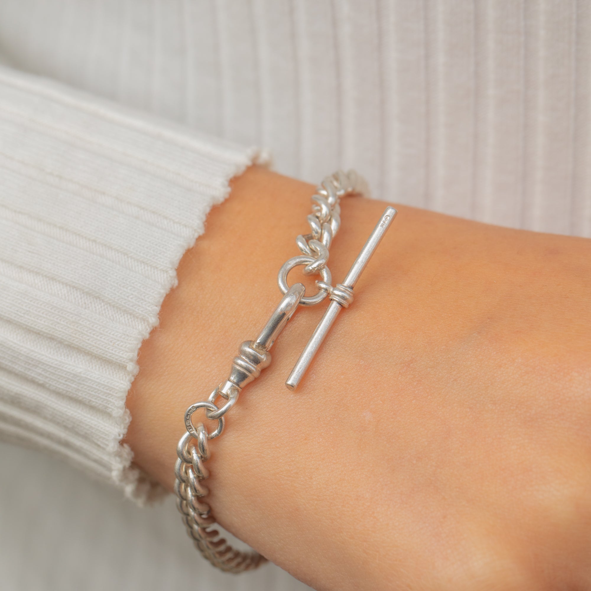 Chunky Sterling Silver Curb Bracelet, T-bar & Dog-Clip Charm-Holder Clasp