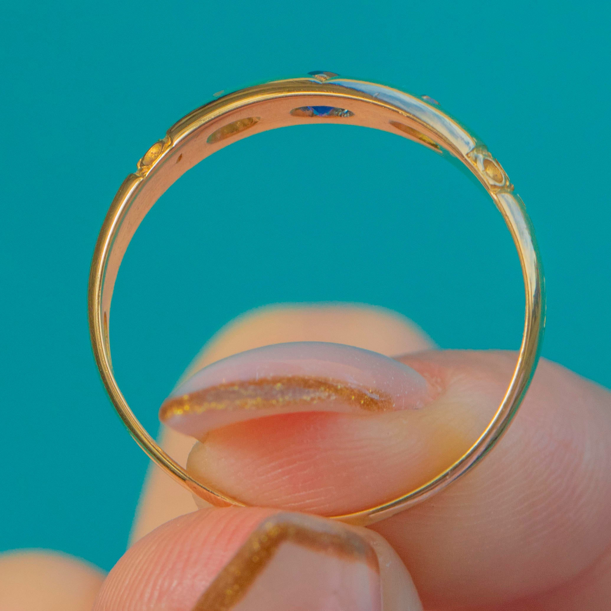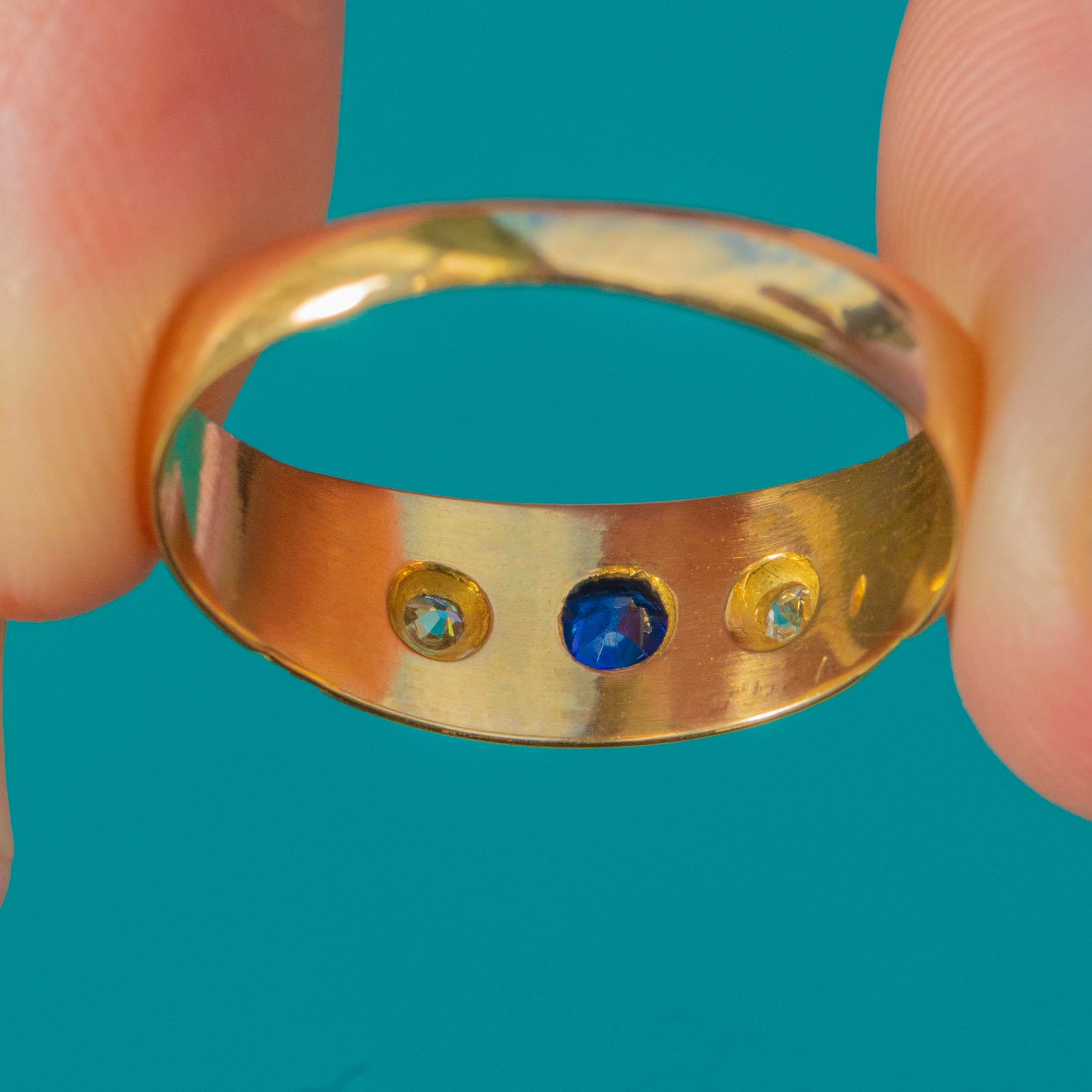 A bold and beautifully preserved late Victorian star-set ring crafted in bright 18ct Yellow Gold, fully hallmarked for Birmingham, 1899. The chunky band is set with a vivid royal blue natural Sapphire at the centre, flanked by two sparkling old mine cut Diamonds in crisp engraved starbursts—a classic and highly sought-after Victorian design.