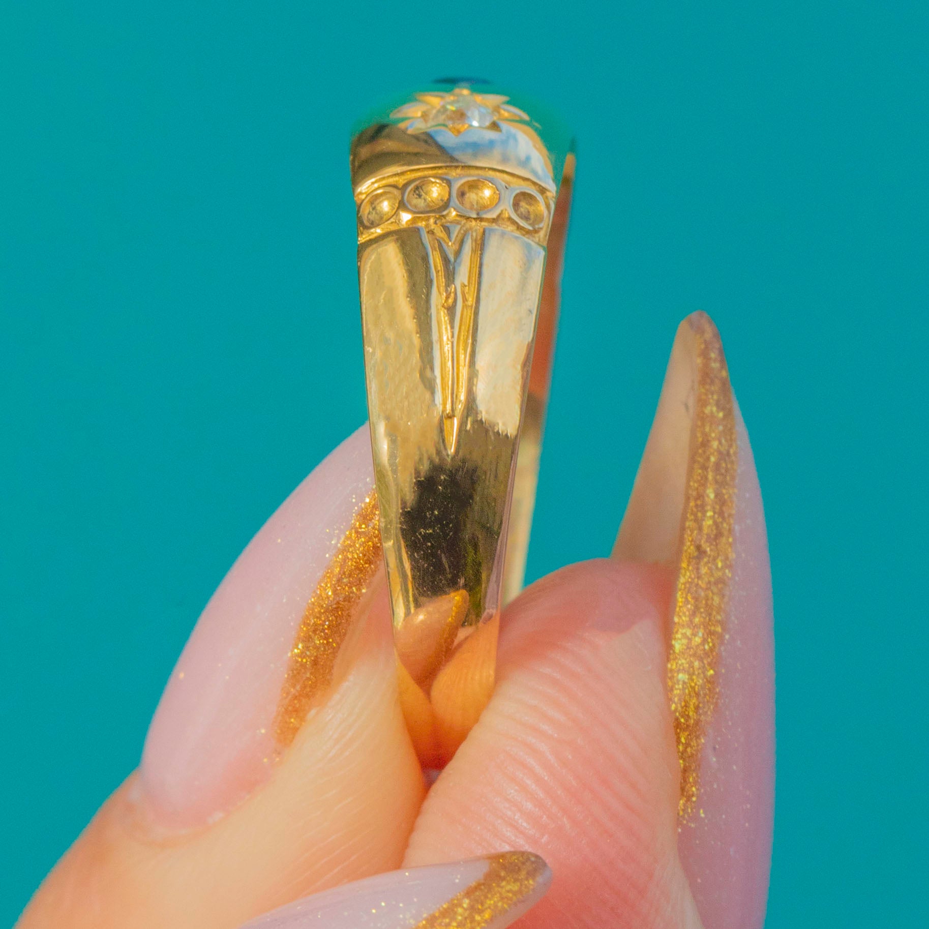 The Gold has that rich, sunny antique tone so characteristic of 19th-century 18ct, complemented by hand-engraved shoulder details that add charm and craftsmanship. Glossy, smooth and wonderfully stylish, it makes a perfect antique stacking ring or standout everyday piece.