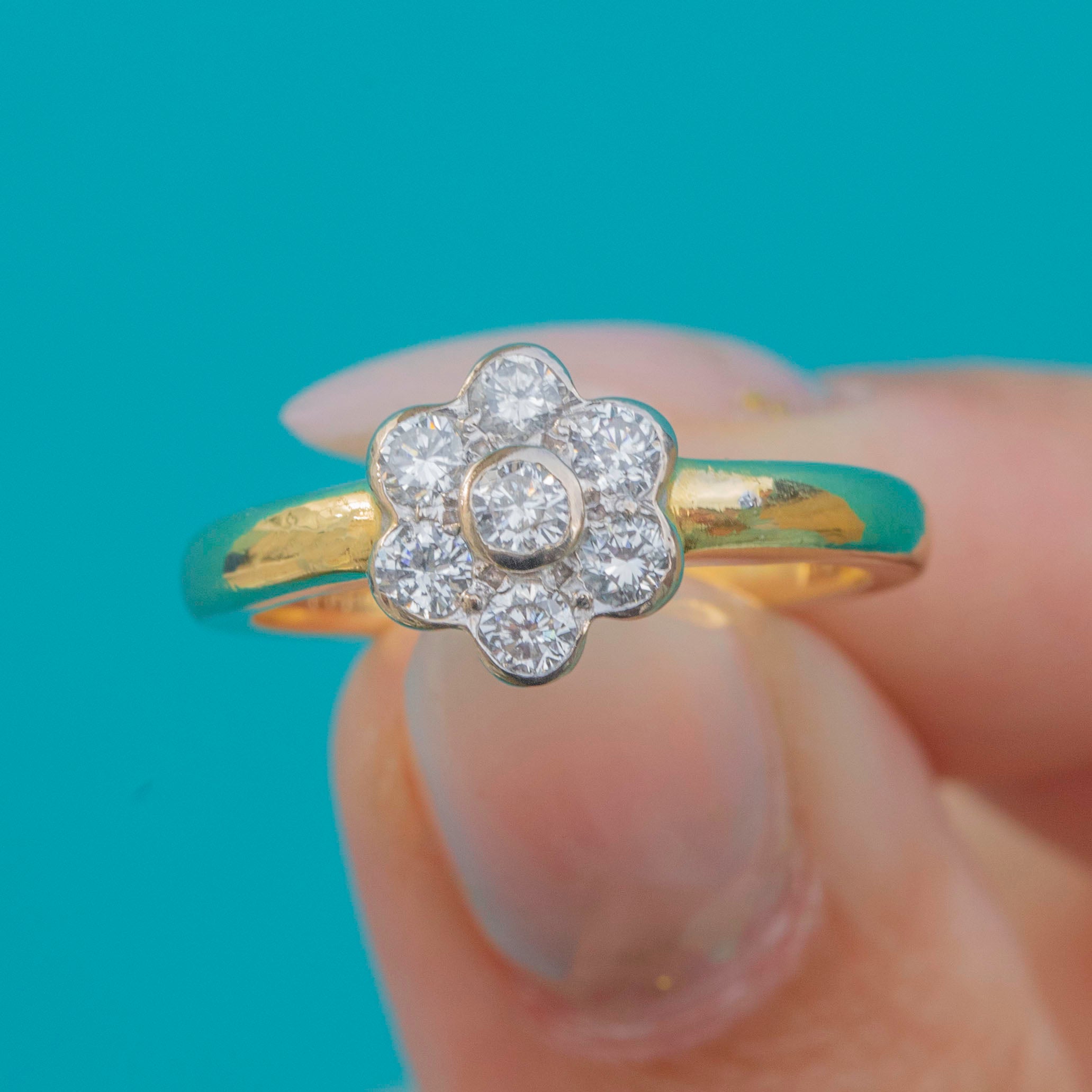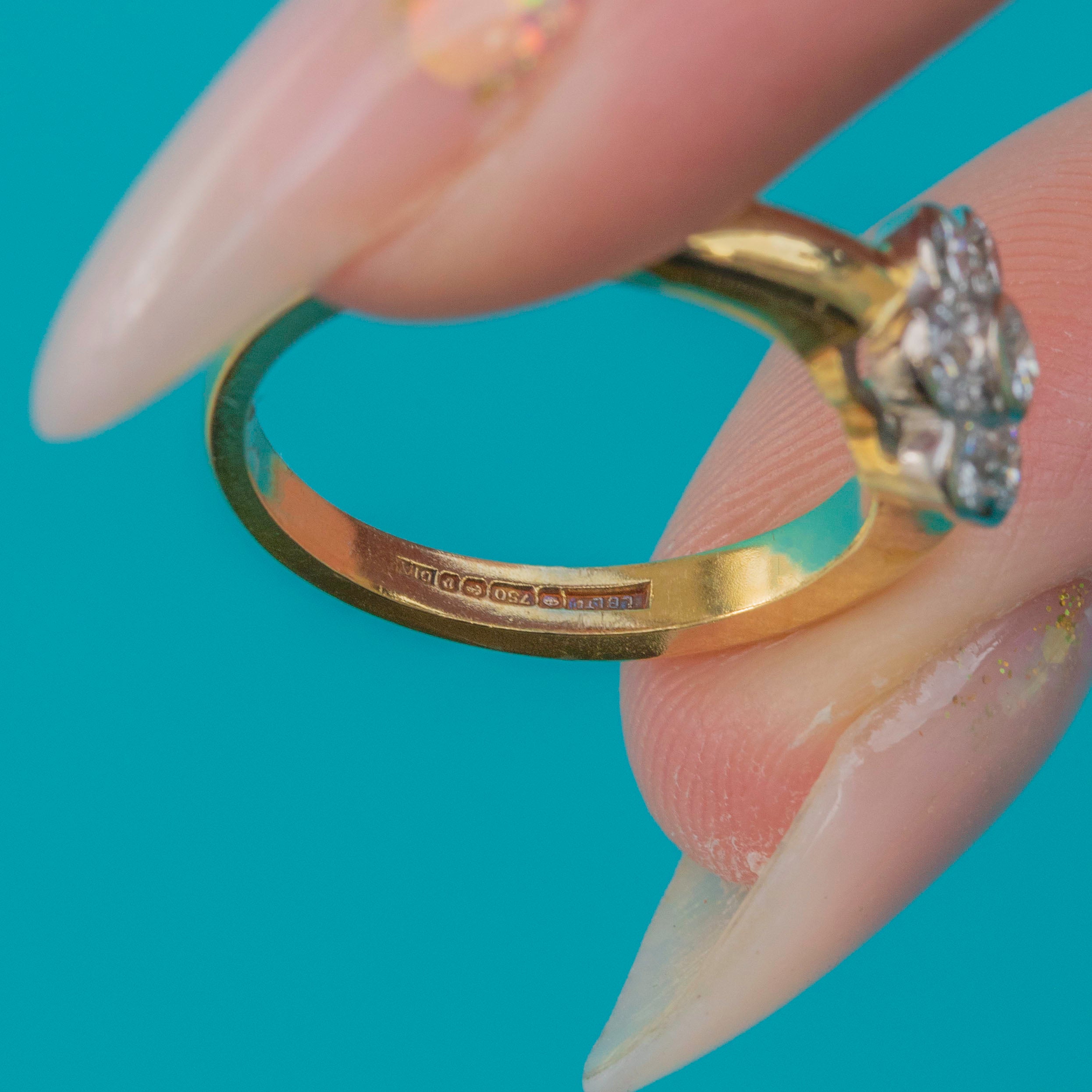 Excellent: The Diamonds are bright and well-matched, all secure in their settings. The cluster head is crisp and in great shape, and the 18ct Gold band shows only light signs of wear, retaining good thickness and durability.