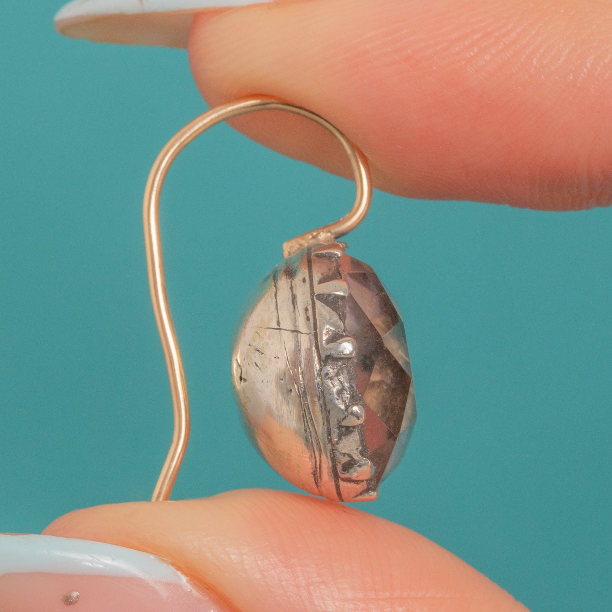 Glowing with soft, smoky pink allure, these Georgian paste drops channel the quiet drama of the period. Each large, faceted Smoky Pink Paste is set in a hand‑worked cut‑down collet with Silver closed-back buttin settings, showcasing the artisanal irregularities collectors love. The two‑tone contrast is timeless: cool silver backs paired with warm 9ct Gold French hooks.