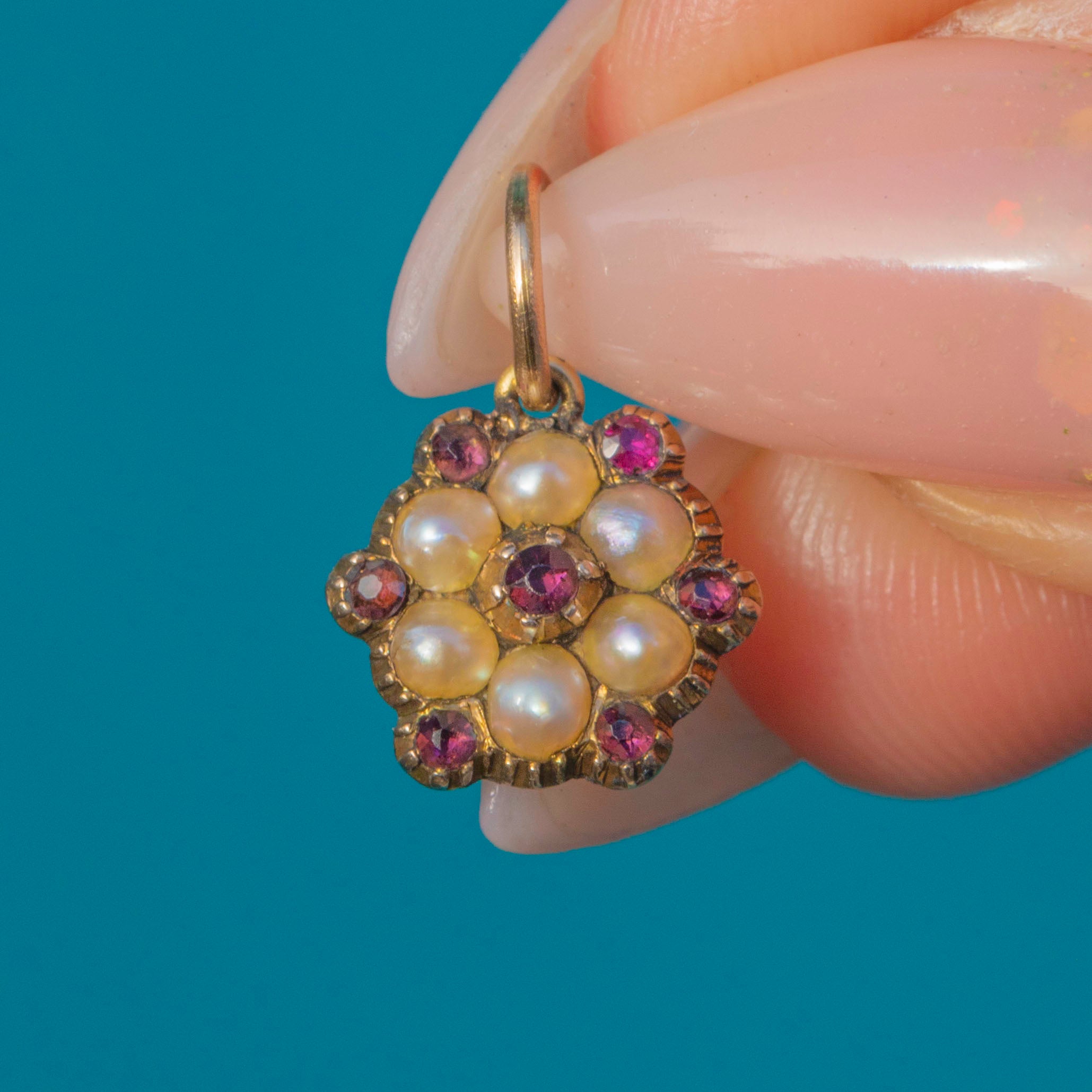 Dainty 12ct Gold Natural Pearl Ruby Flower Cluster Charm, c.1820