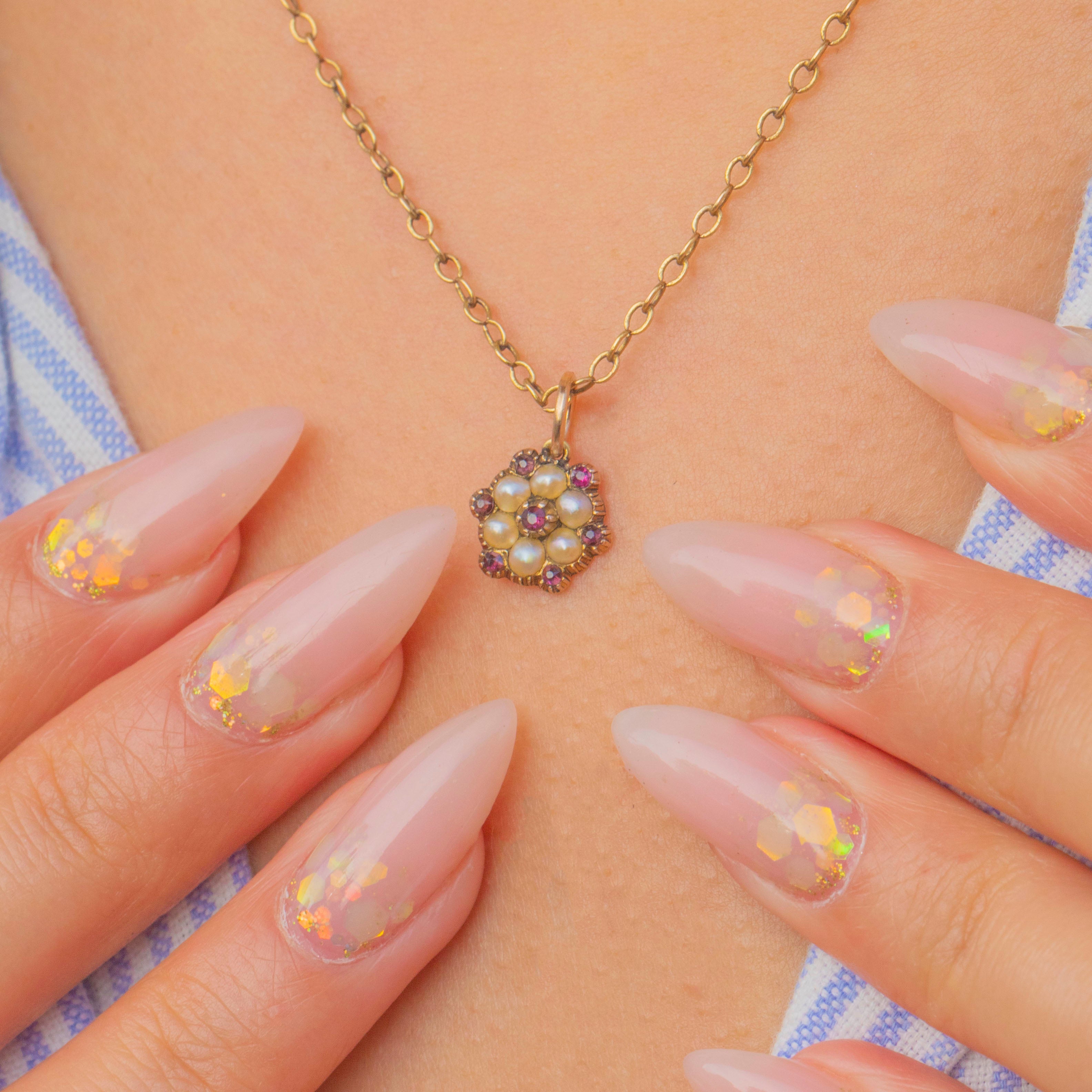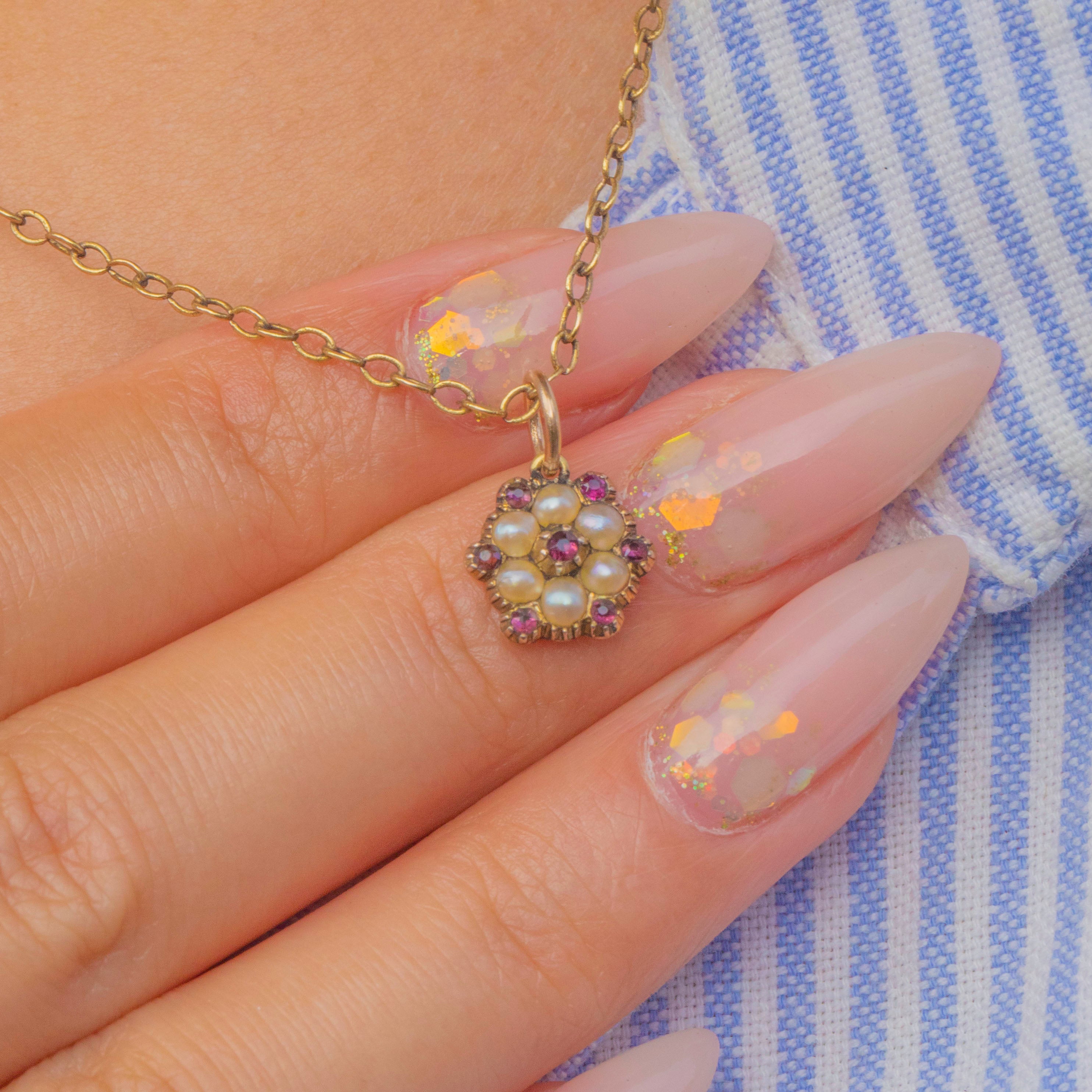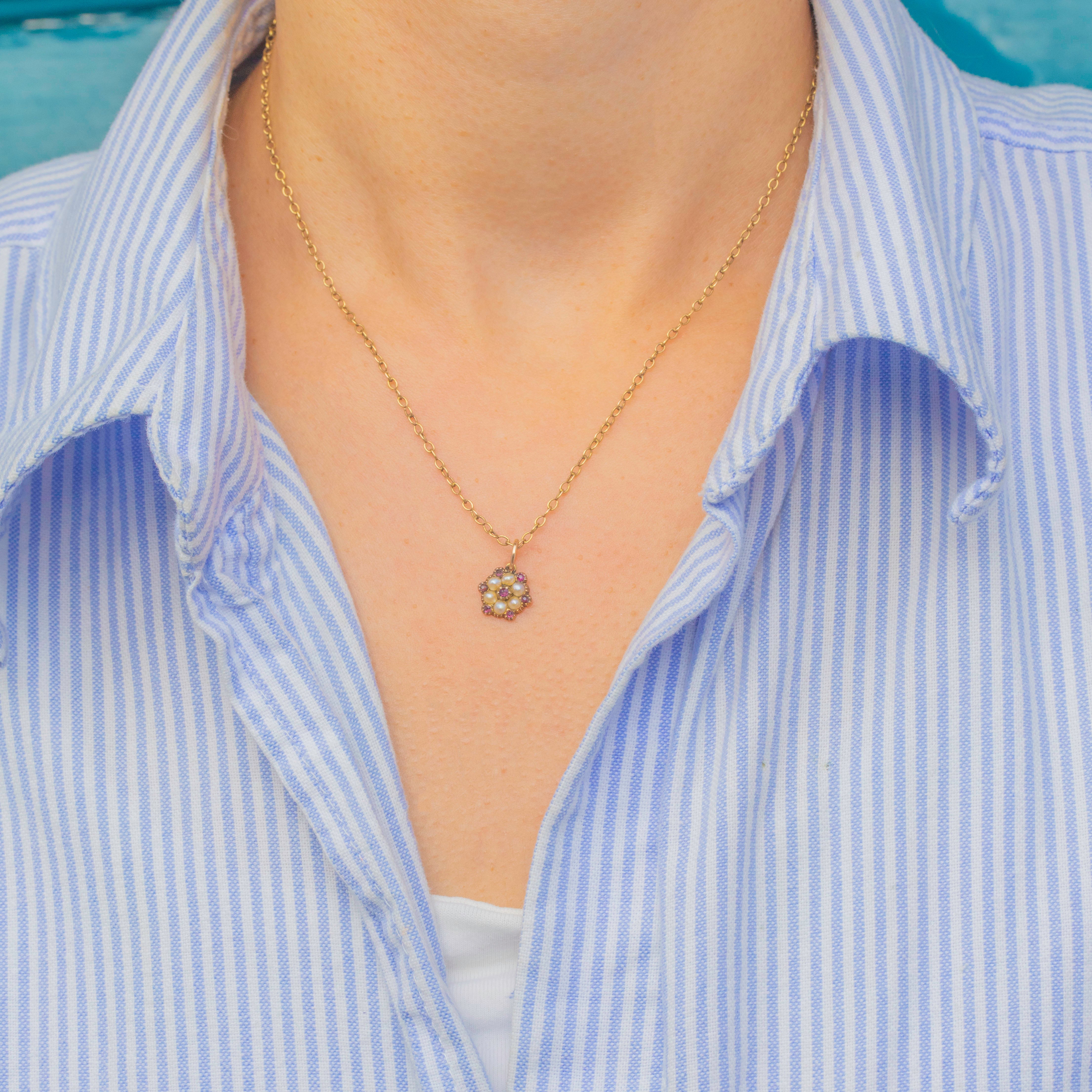 This dainty Georgian charm is crafted in 12ct Gold and set with natural Pearls and Rubies in a sweet flower cluster design. The Pearls are creamy and lustrous, perfectly complemented by the rich pinkish-red Rubies, forming a delicate yet vibrant jewel.