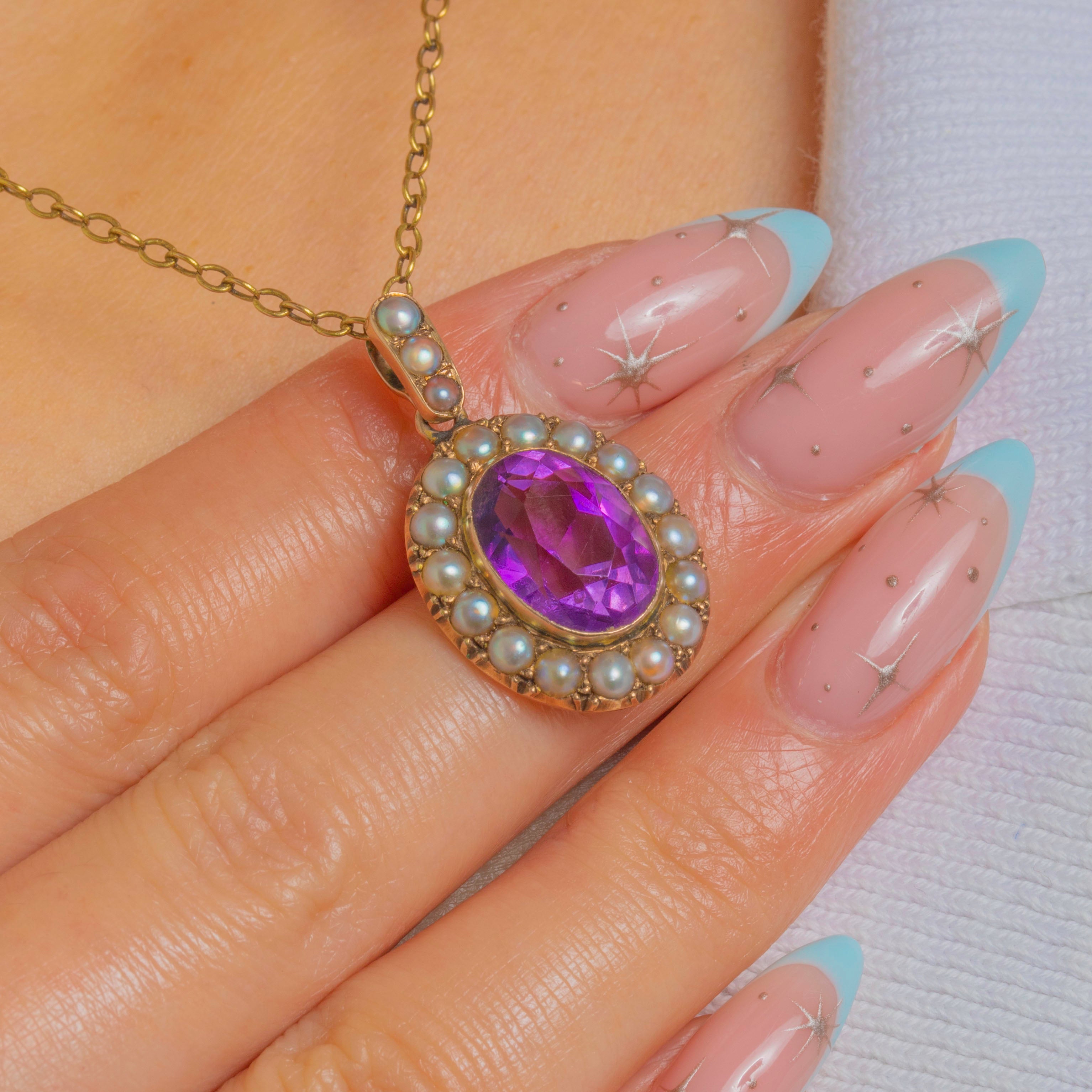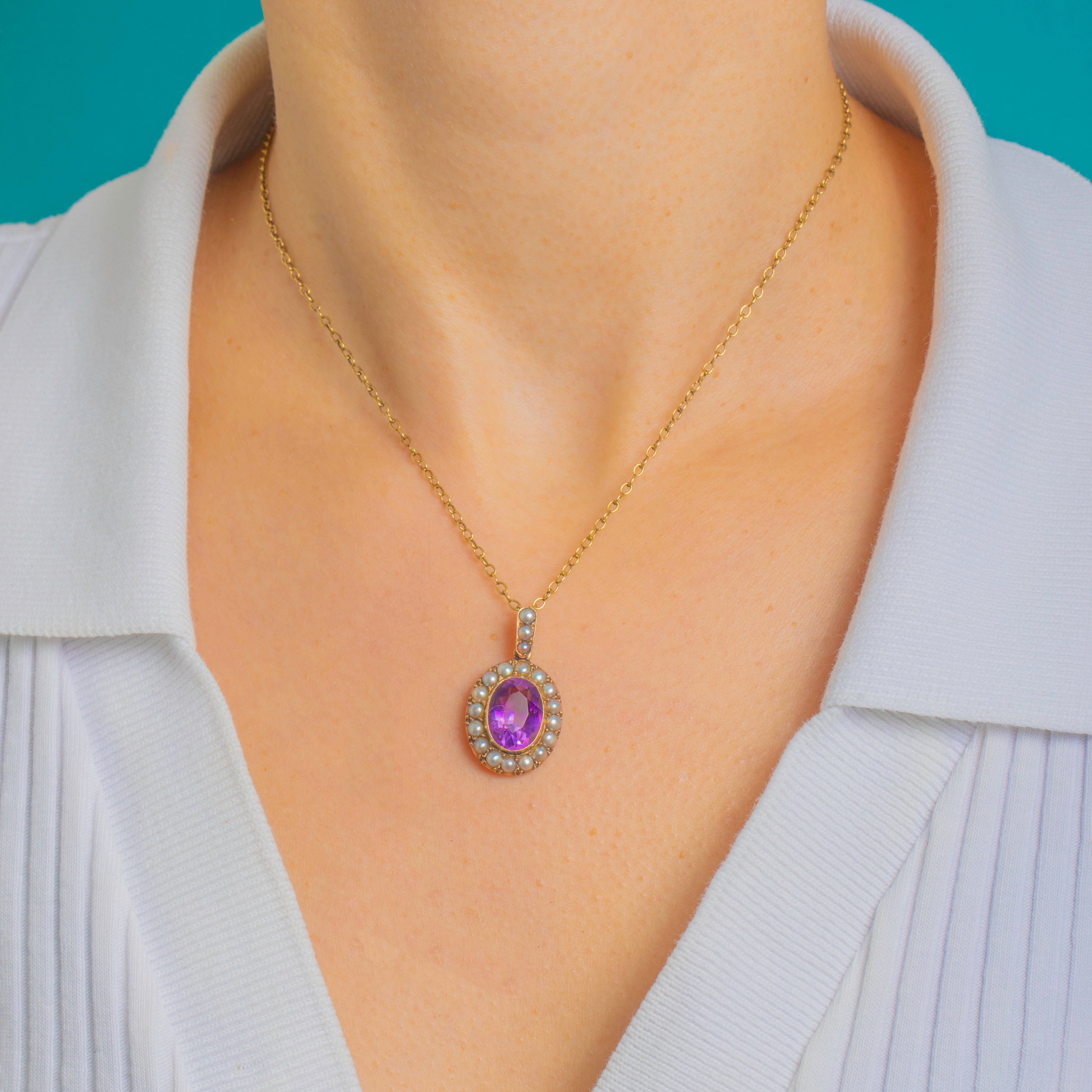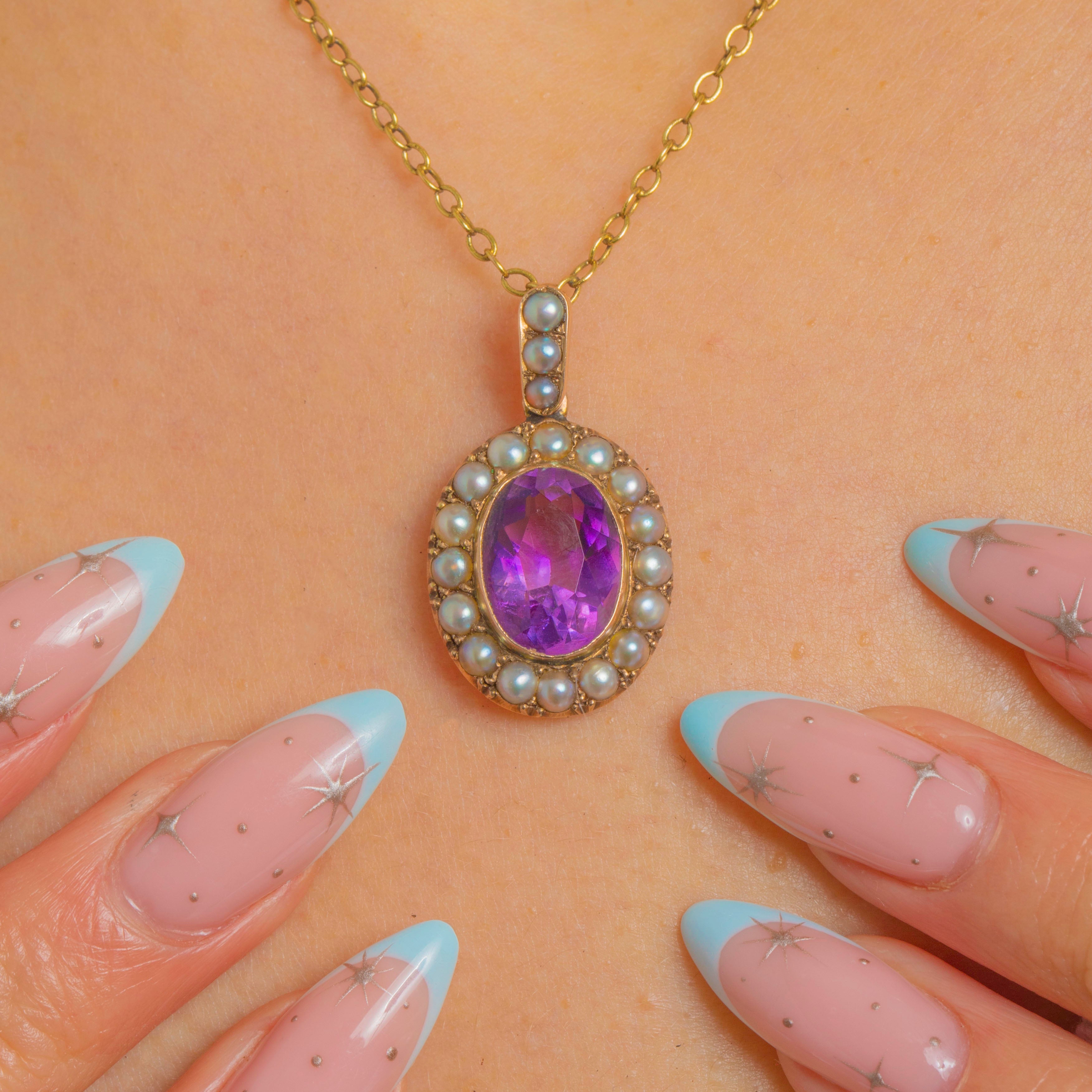 A graceful ode to the Edwardian era, this dainty 9ct Gold pendant showcases a velvety violet Amethyst embraced by a luminous halo of petite Pearls. The oval centre is secured in a neat rub-over bezel, for that delicate, romantic touch we adore from this period.