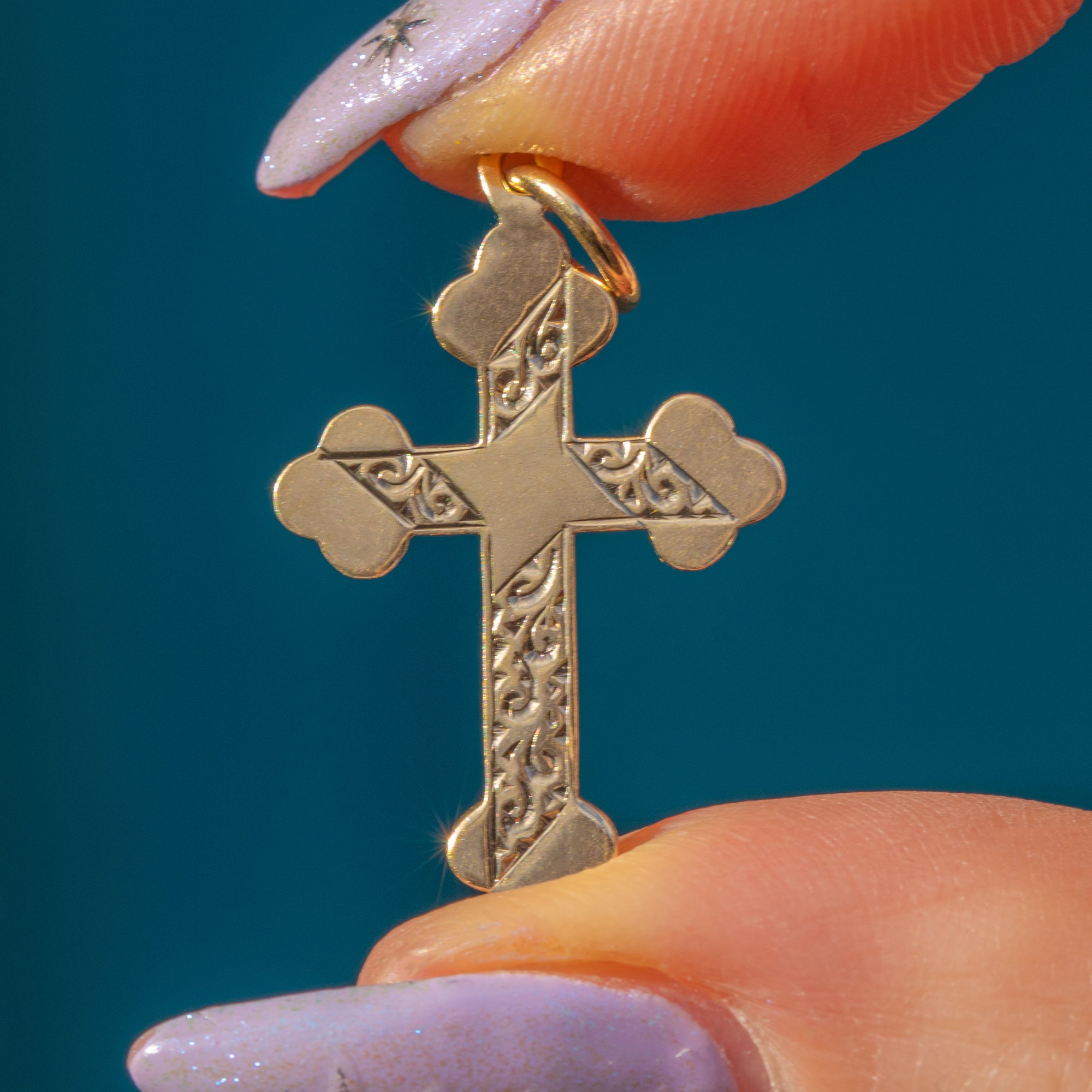 This dainty antique 9ct Gold engraved cross pendant is simply gorgeous! Finely engraved orate details sweep across the front of this cross, catching the light beautifully and bringing texture to the buttery 9ct Gold.