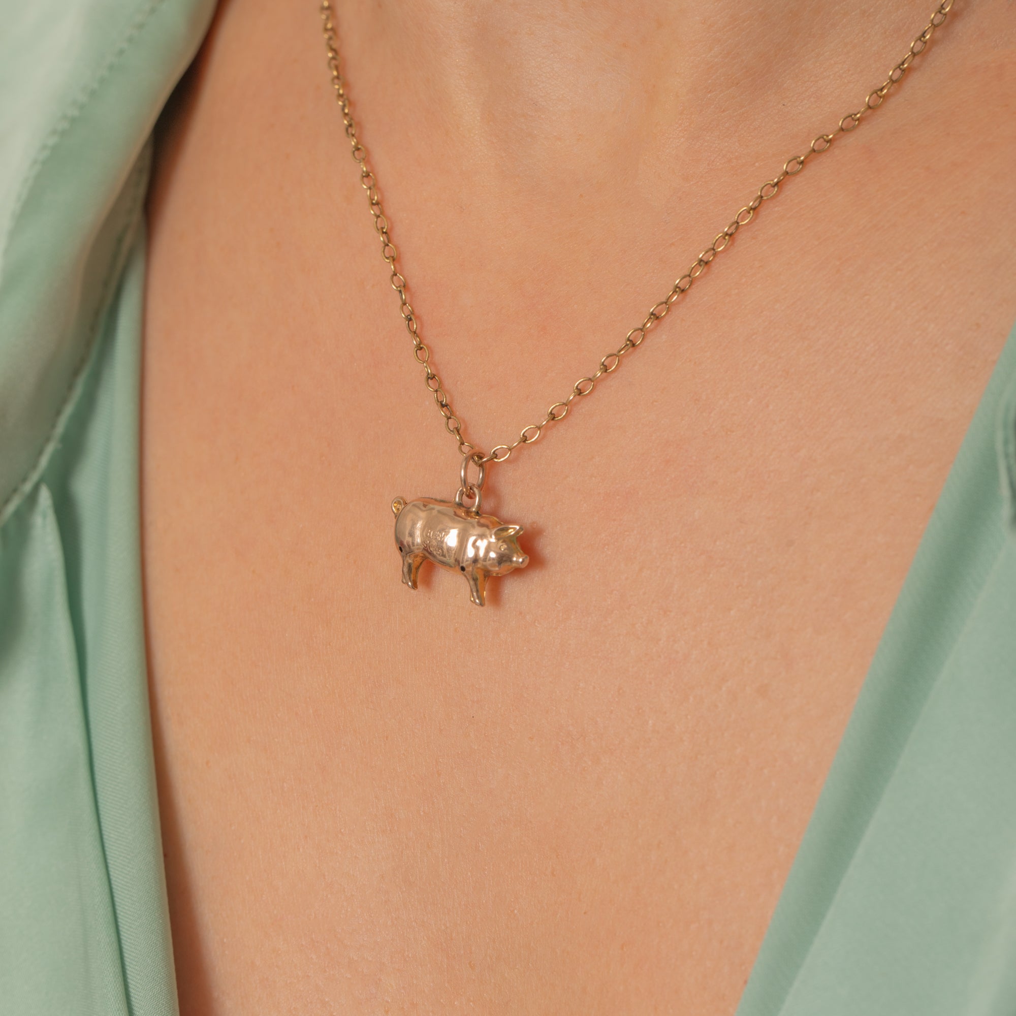 EXCELLENT: Smooth, bright Gold surfaces with a small mark visible on the Gold of the pig, consistent with gentle vintage wear. Detailing remains crisp and the jump ring is secure. A well-preserved, charming piece.