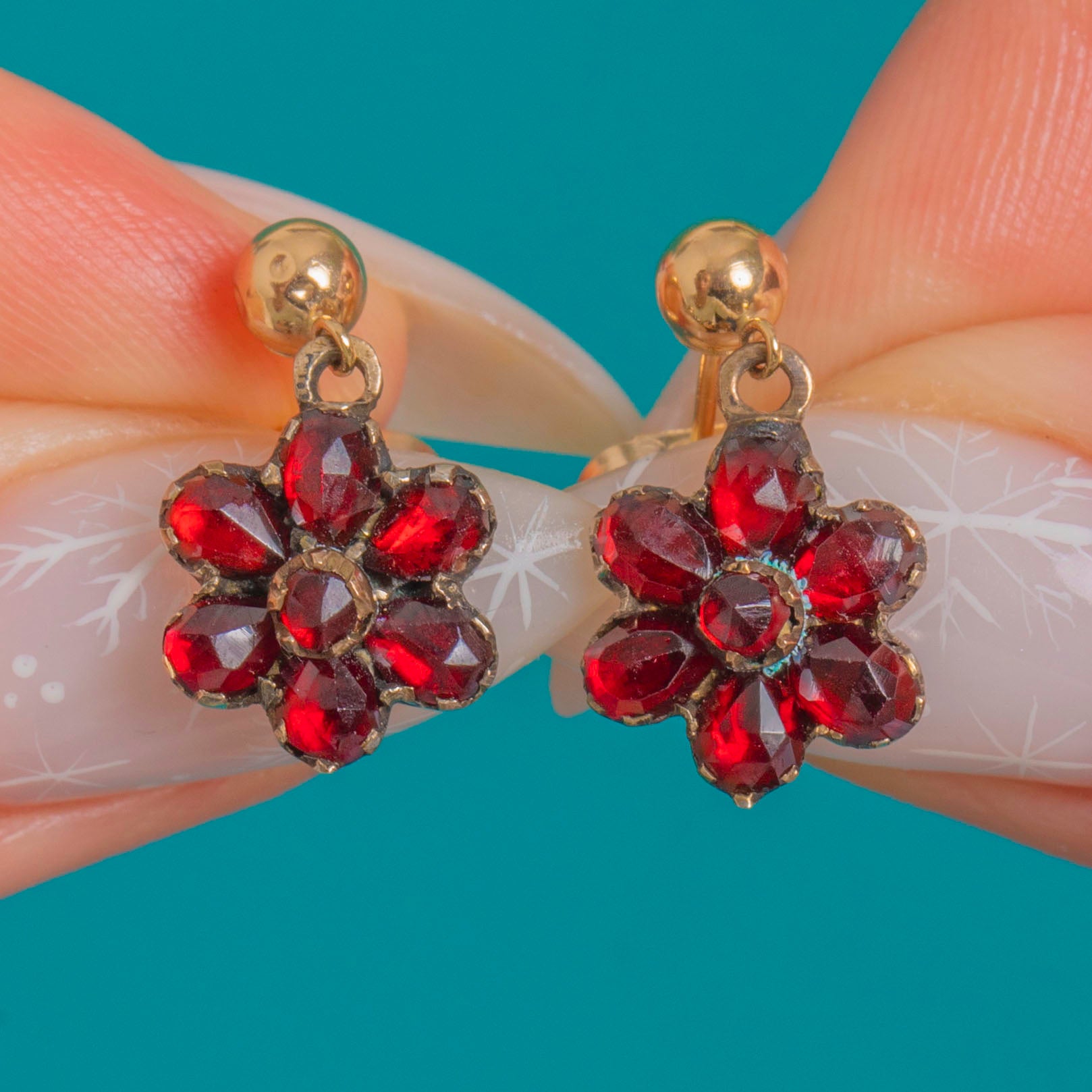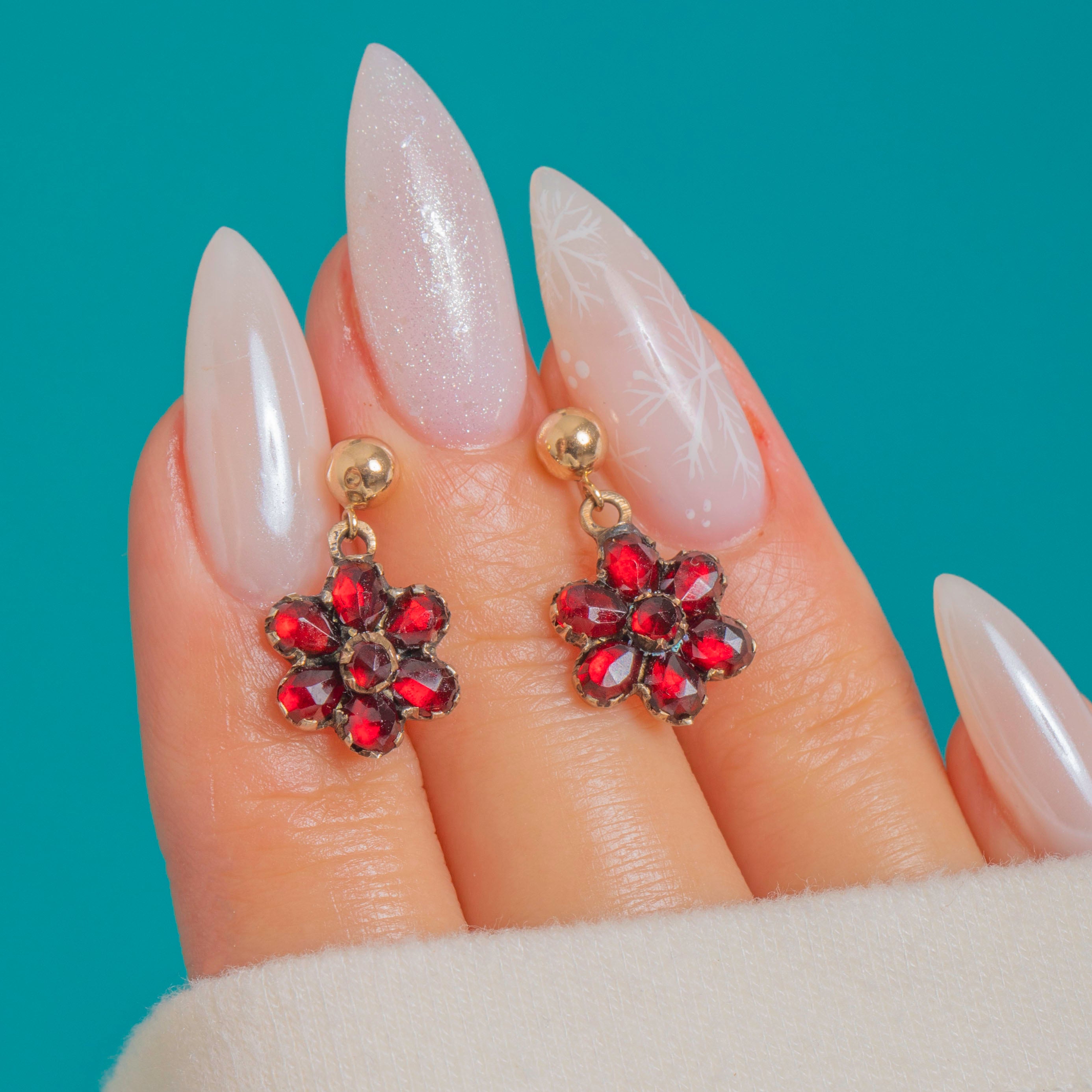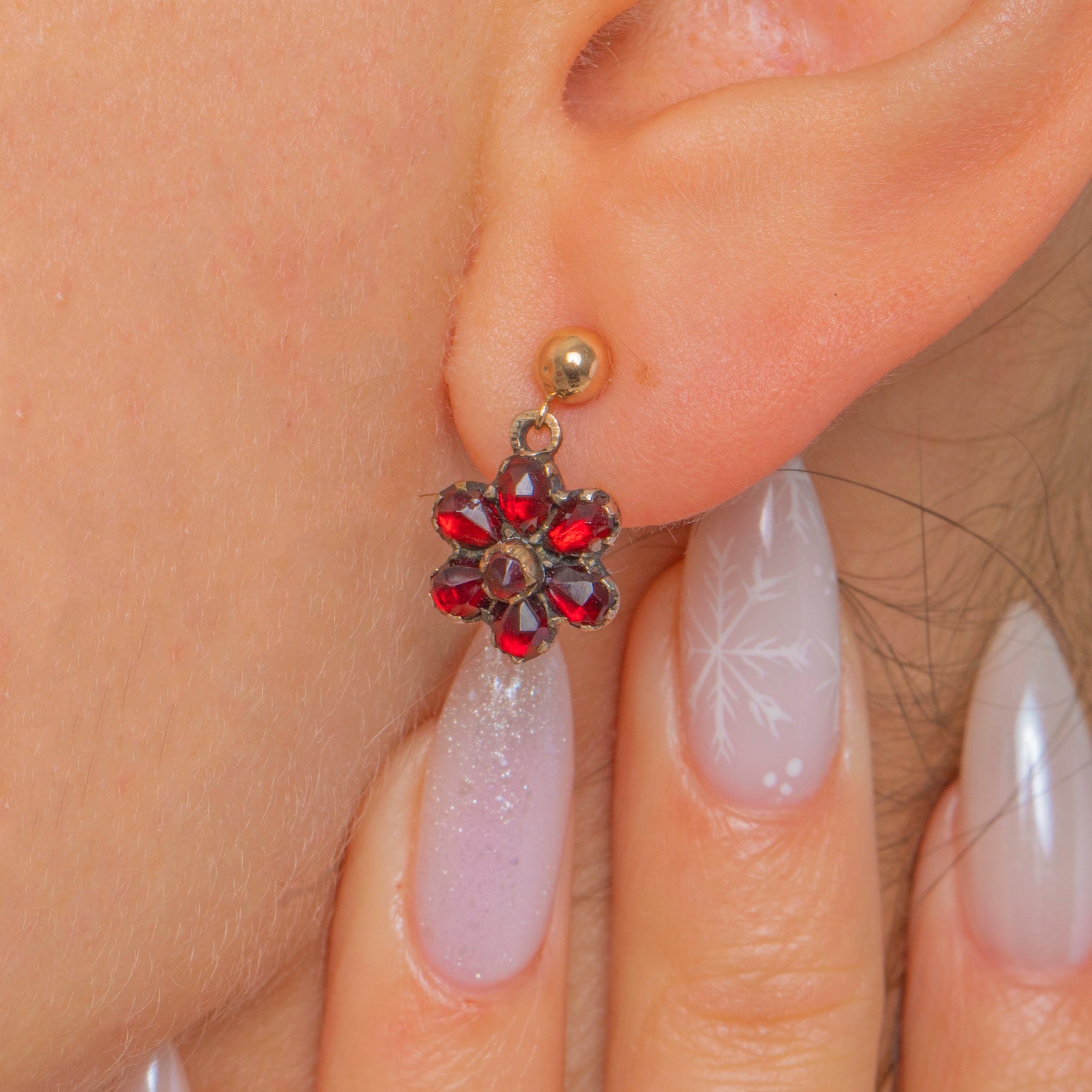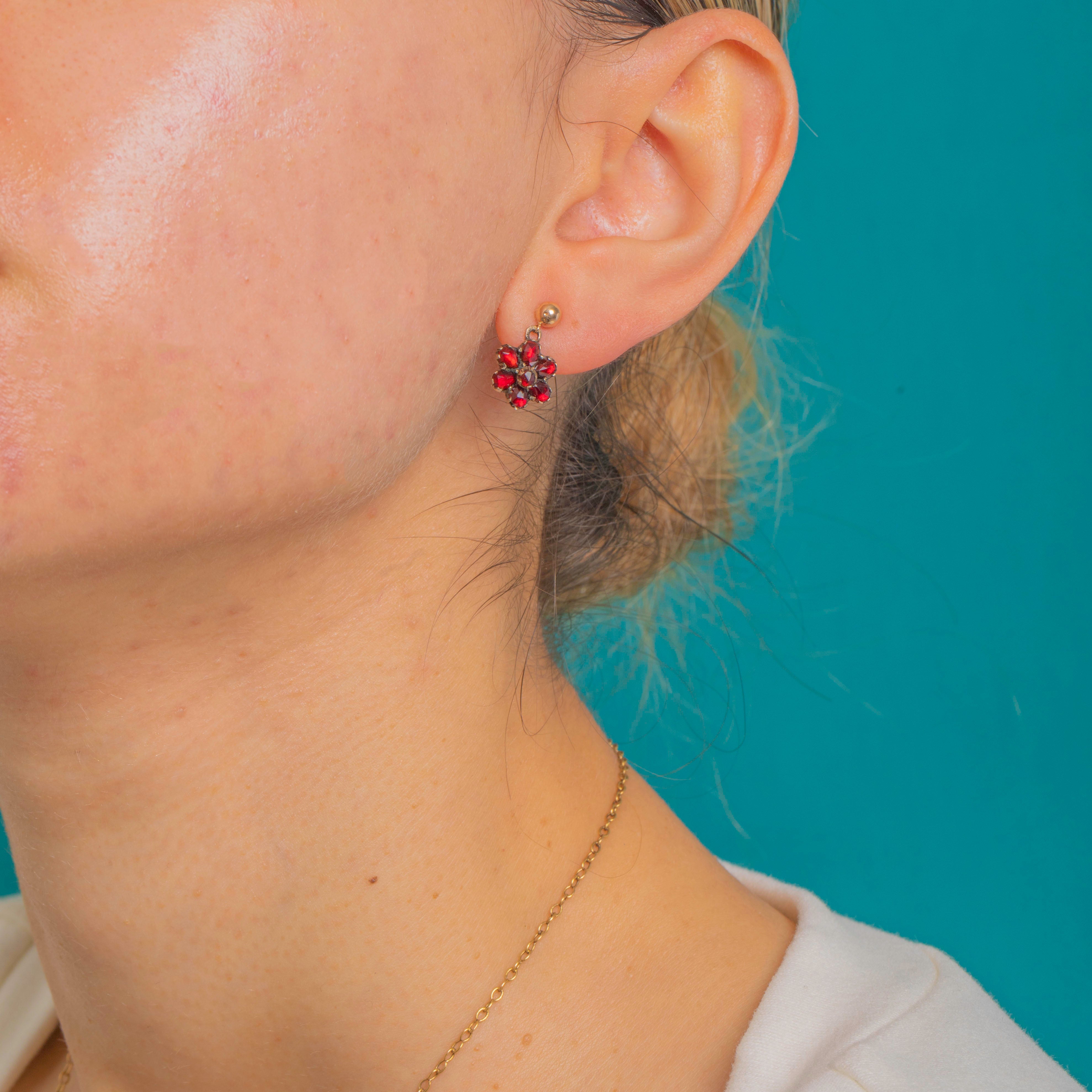 Feiner Victorian-Charme verbindet sich mit romantischer Farbgebung in diesen antiken Granat-Blütentropfen. Jede Rosette ist mit tiefroten, intensiv leuchtenden böhmischen Granaten besetzt, die sich um einen zentralen Stein gruppieren. Die gezackten, geschlossenen Fassungen zeigen eine sanfte, altersbedingte Patina, die das Strahlen der Steine auf wunderbare Weise unterstreicht. Das zart proportionierte, bewegliche Design verleiht bei jeder Bewegung einen feinen Schimmer.