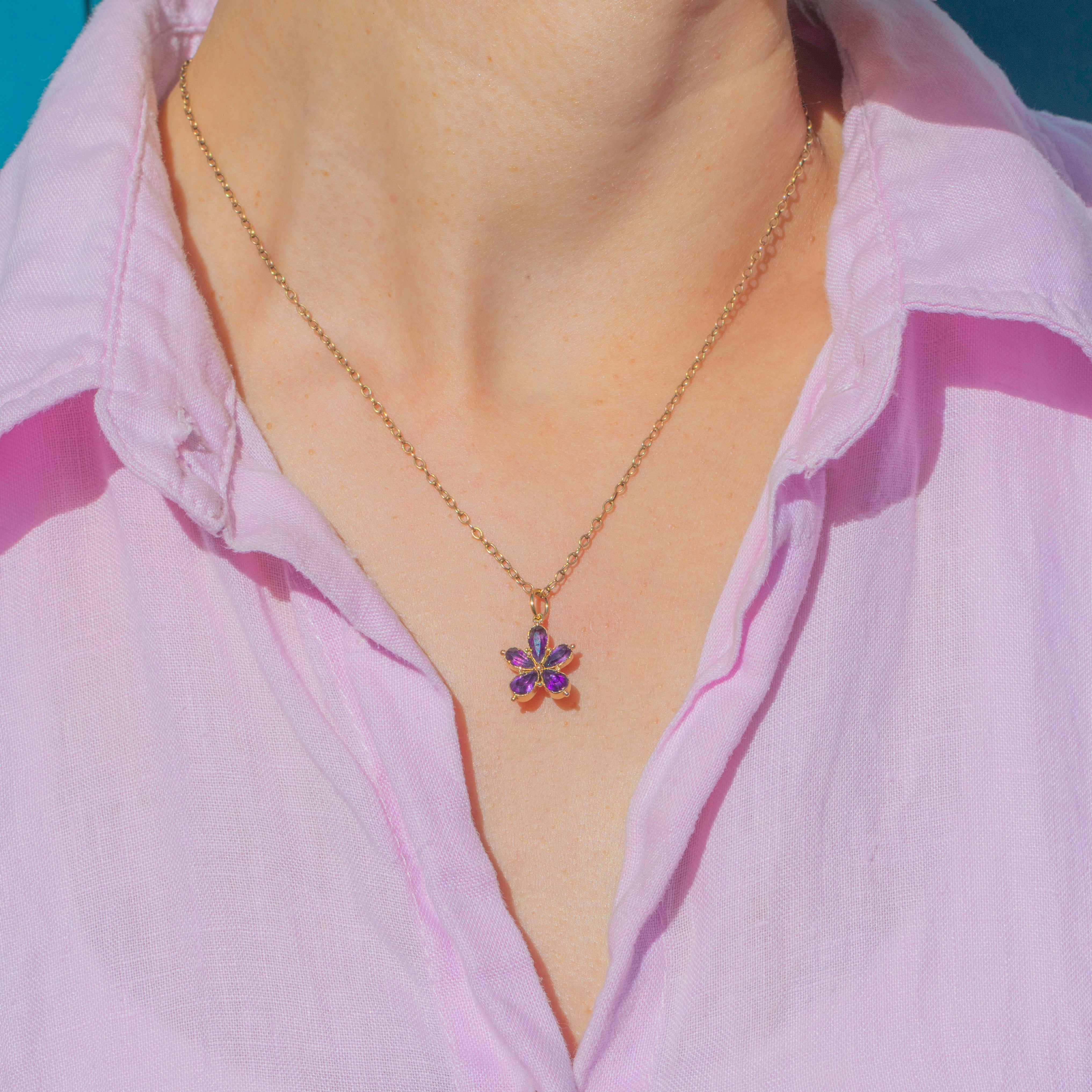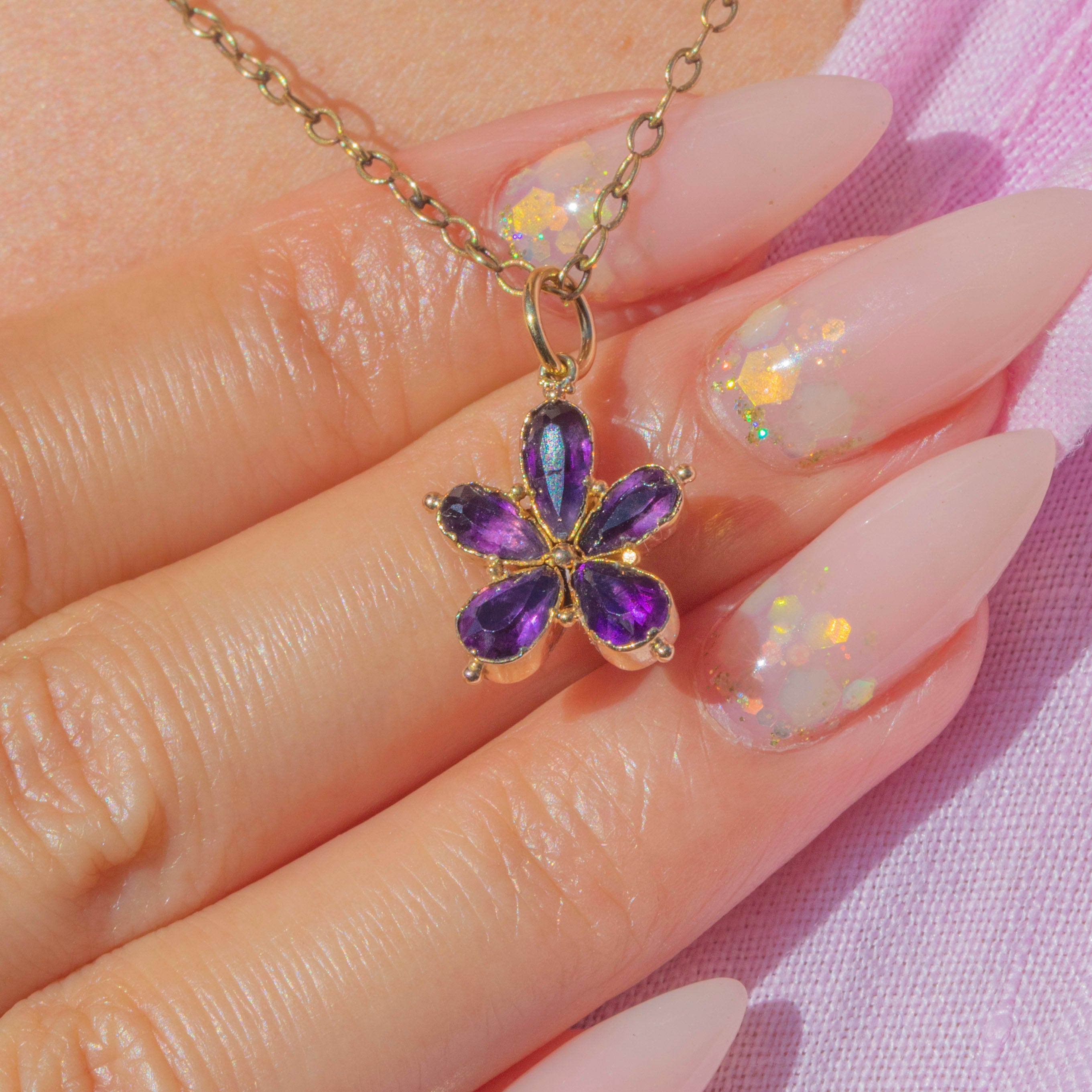 This dainty Georgian charm is crafted in 18ct Gold and set with a vibrant Purple Paste stone, faceted into the shape of a flower- a stylised pansy, no less! The petals shimmer with a rich, amethyst-like hue, radiating from the centre in a classic antique floral design.