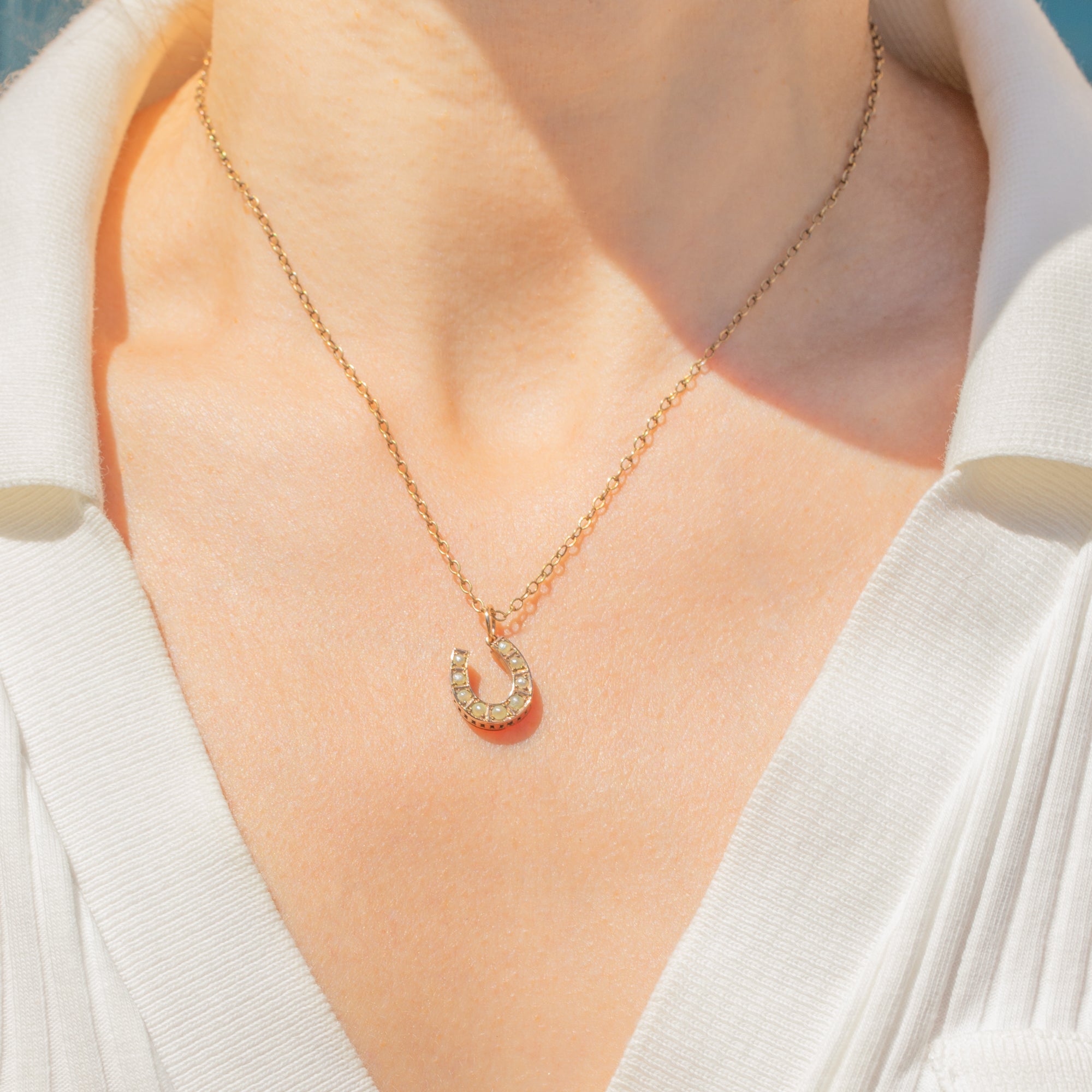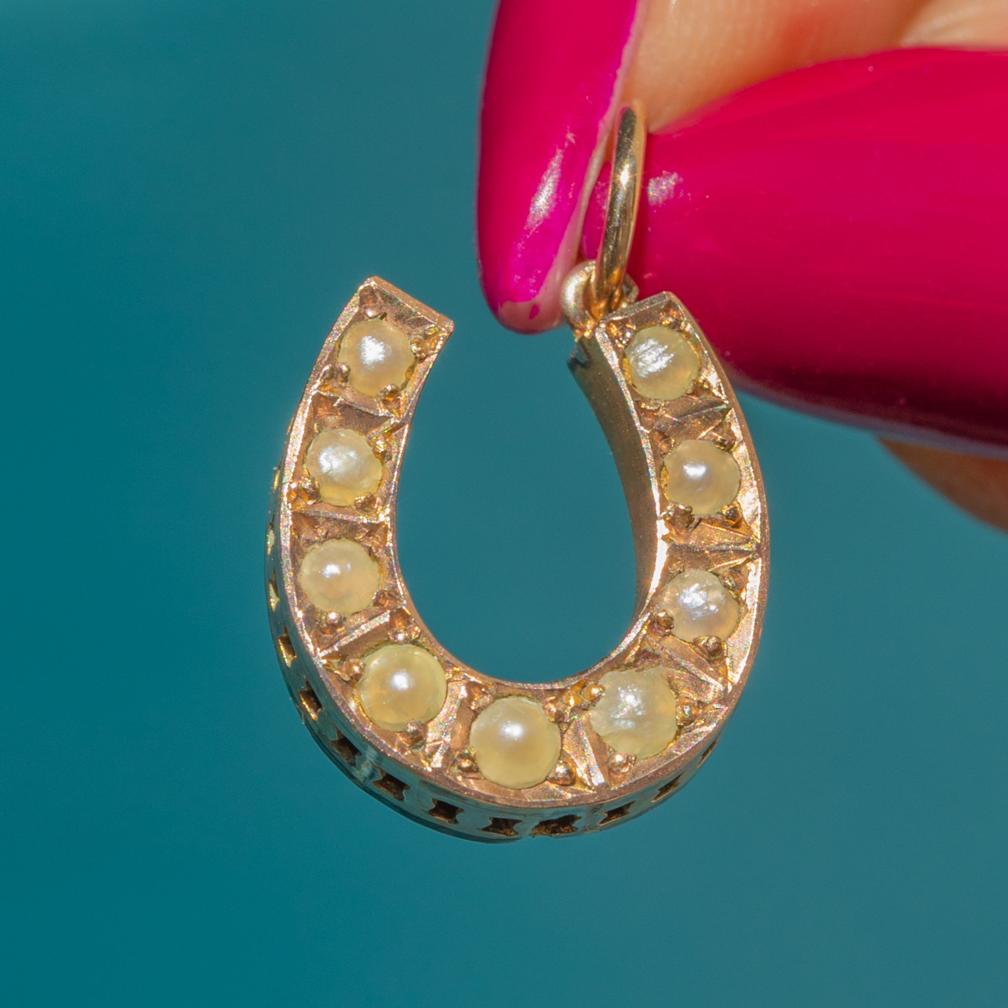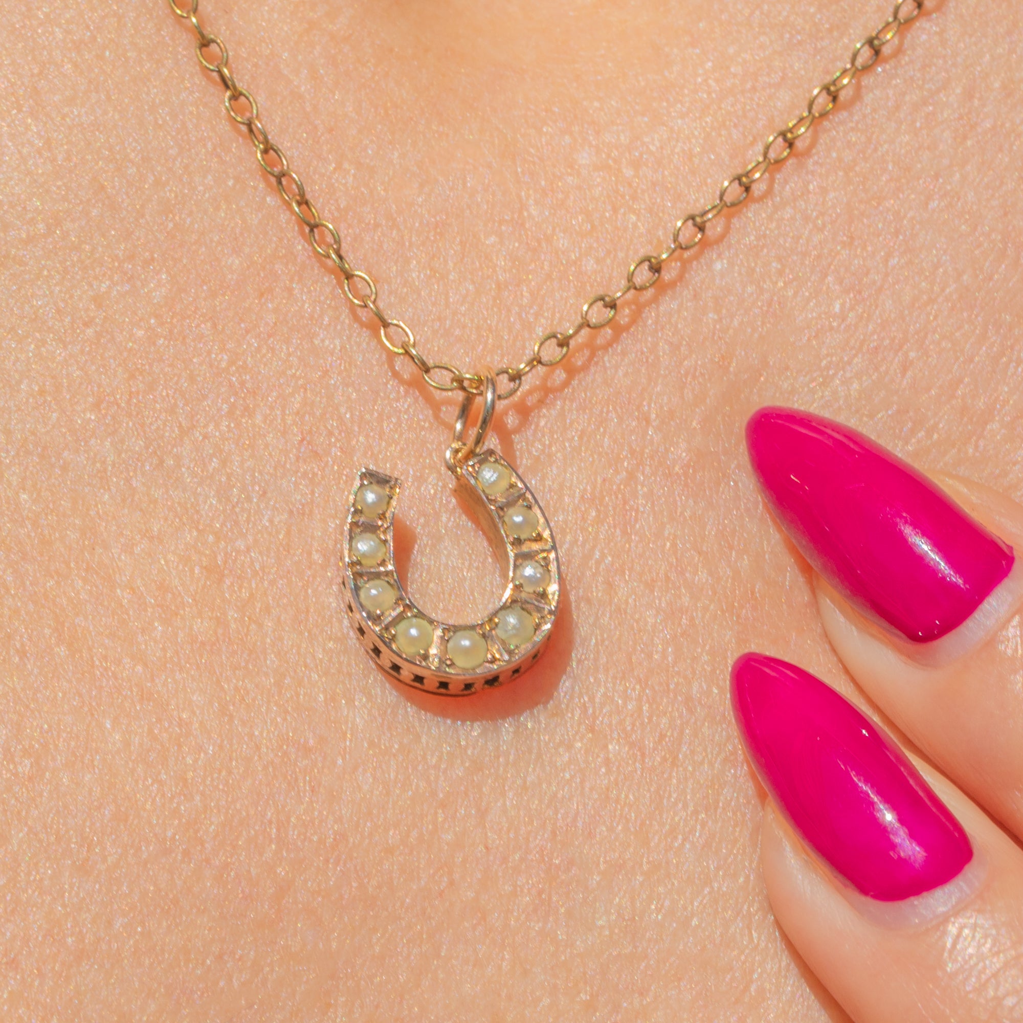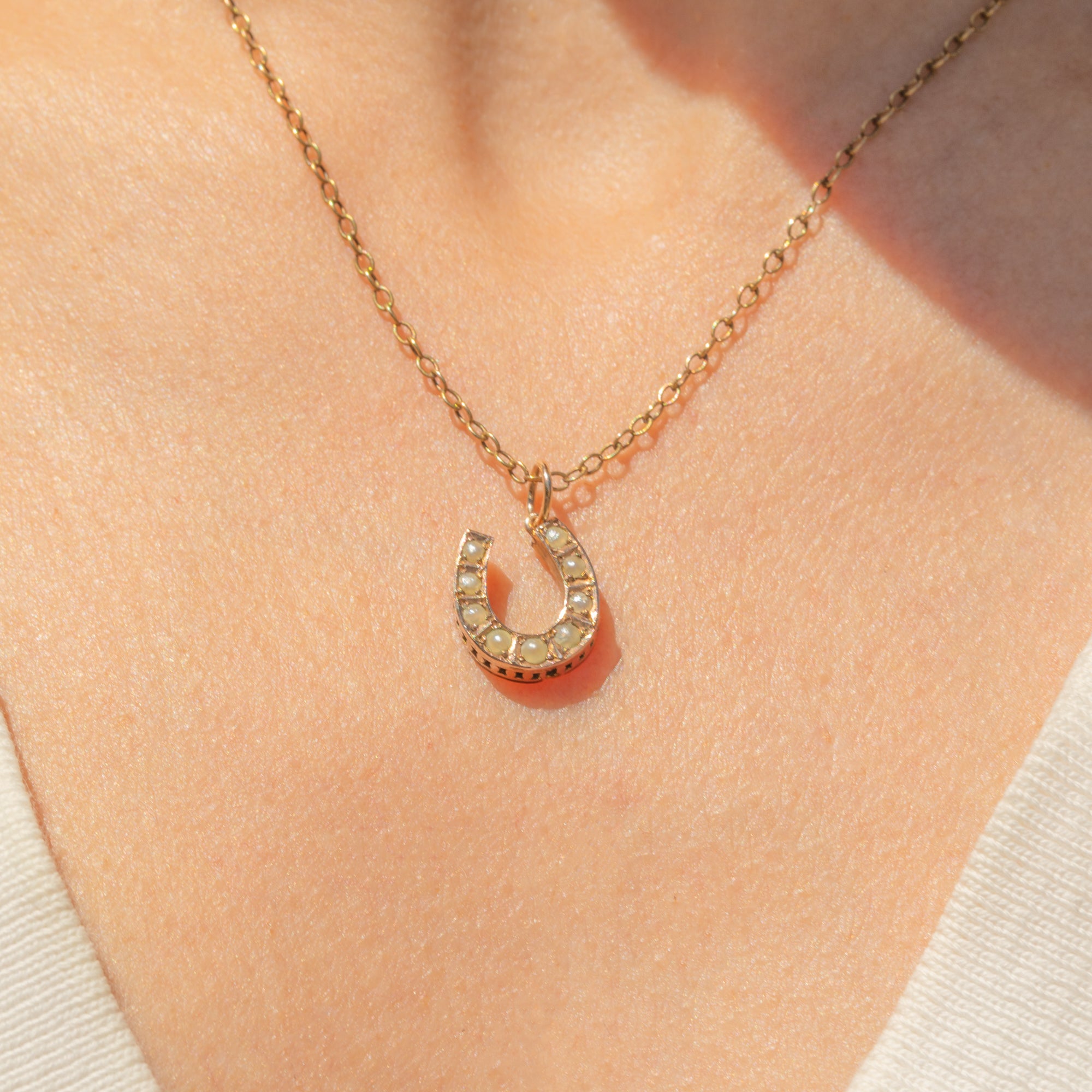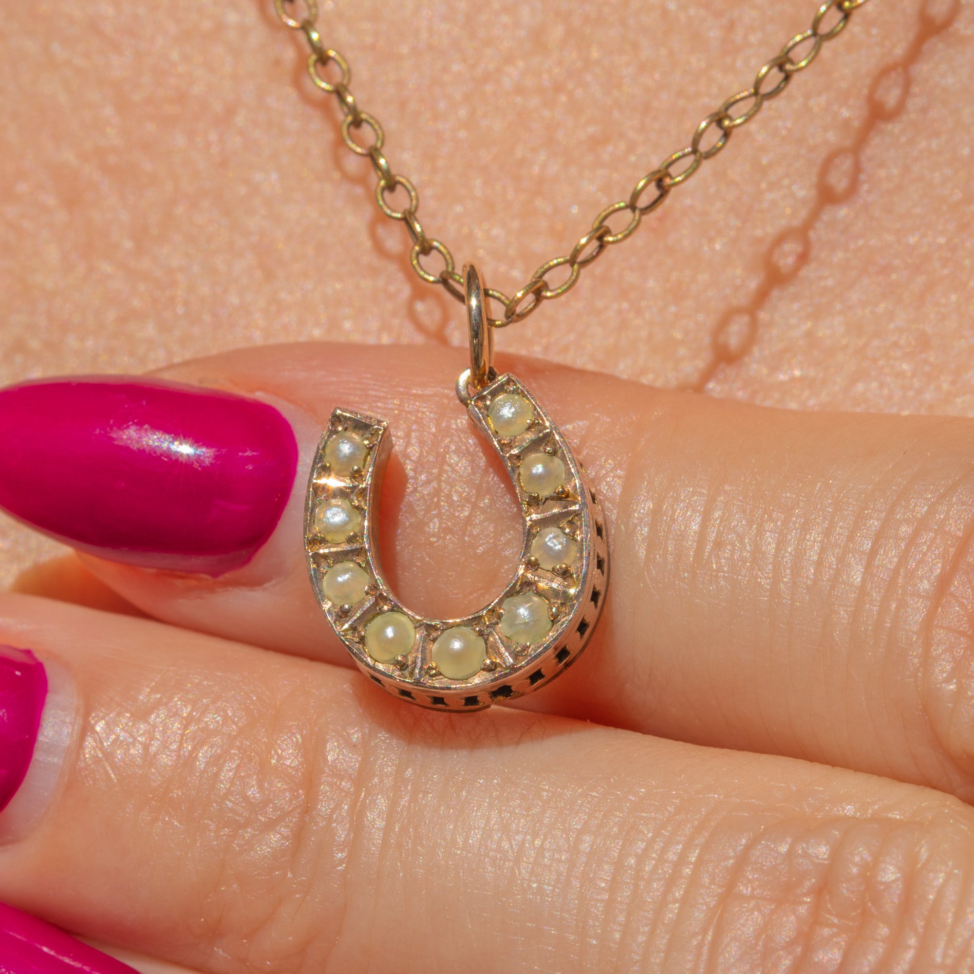 EXCELLENT: The 9ct Gold is rich in lustre, with a fashionable satin finish on the reverse, and all of the Pearls are snug within their settings. Complete with a large jump ring, you can easily suspend this antique Horseshoe pendant from a chain of your choice!