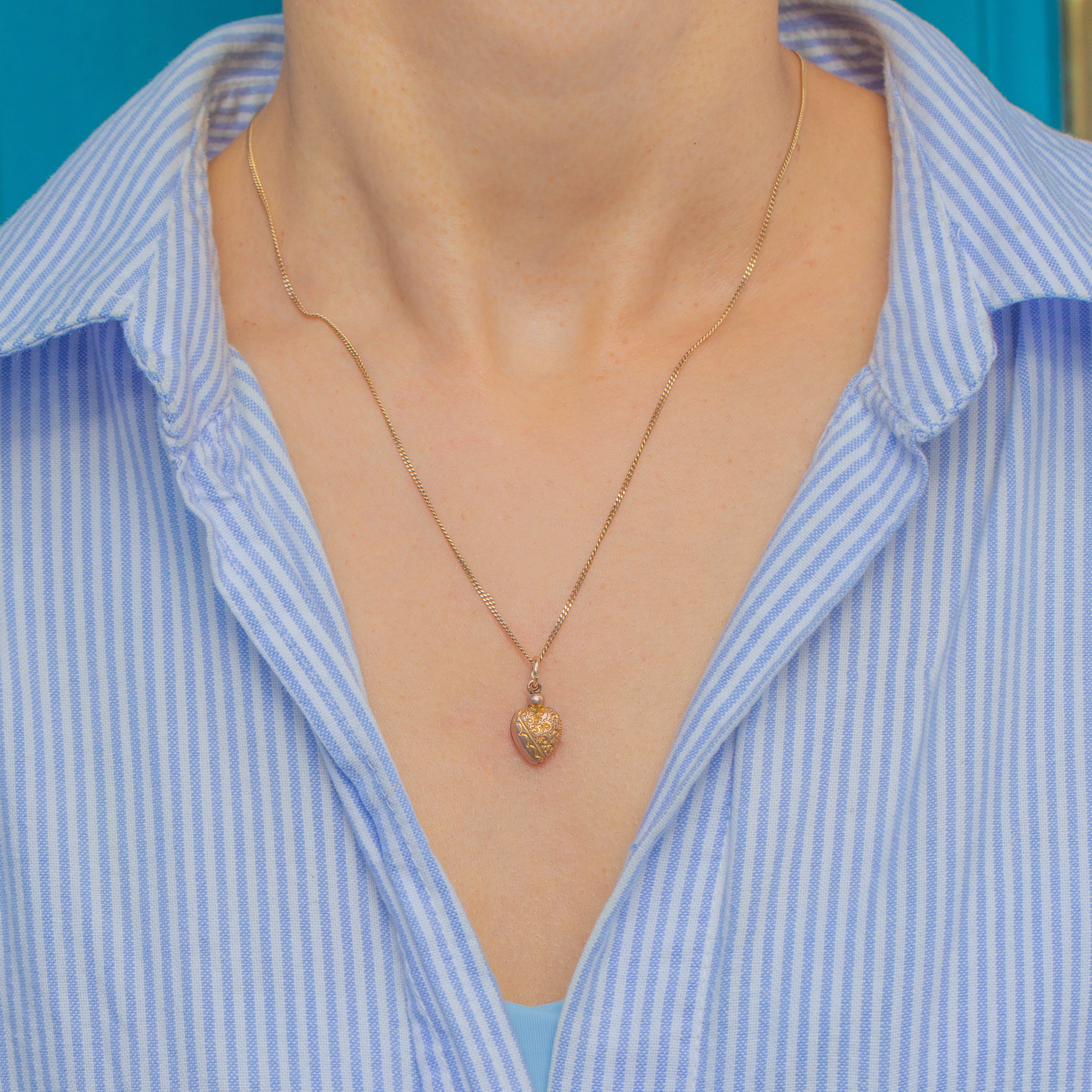This dainty Victorian heart pendant is a sweet and romantic jewel. Crafted in 9ct Gold, the front is decorated with ornate repoussé detailing, adding texture and depth to the warm Gold surface. Heart charms were much loved in the Victorian era as sentimental tokens of love and devotion, and this petite example captures that symbolism beautifully.