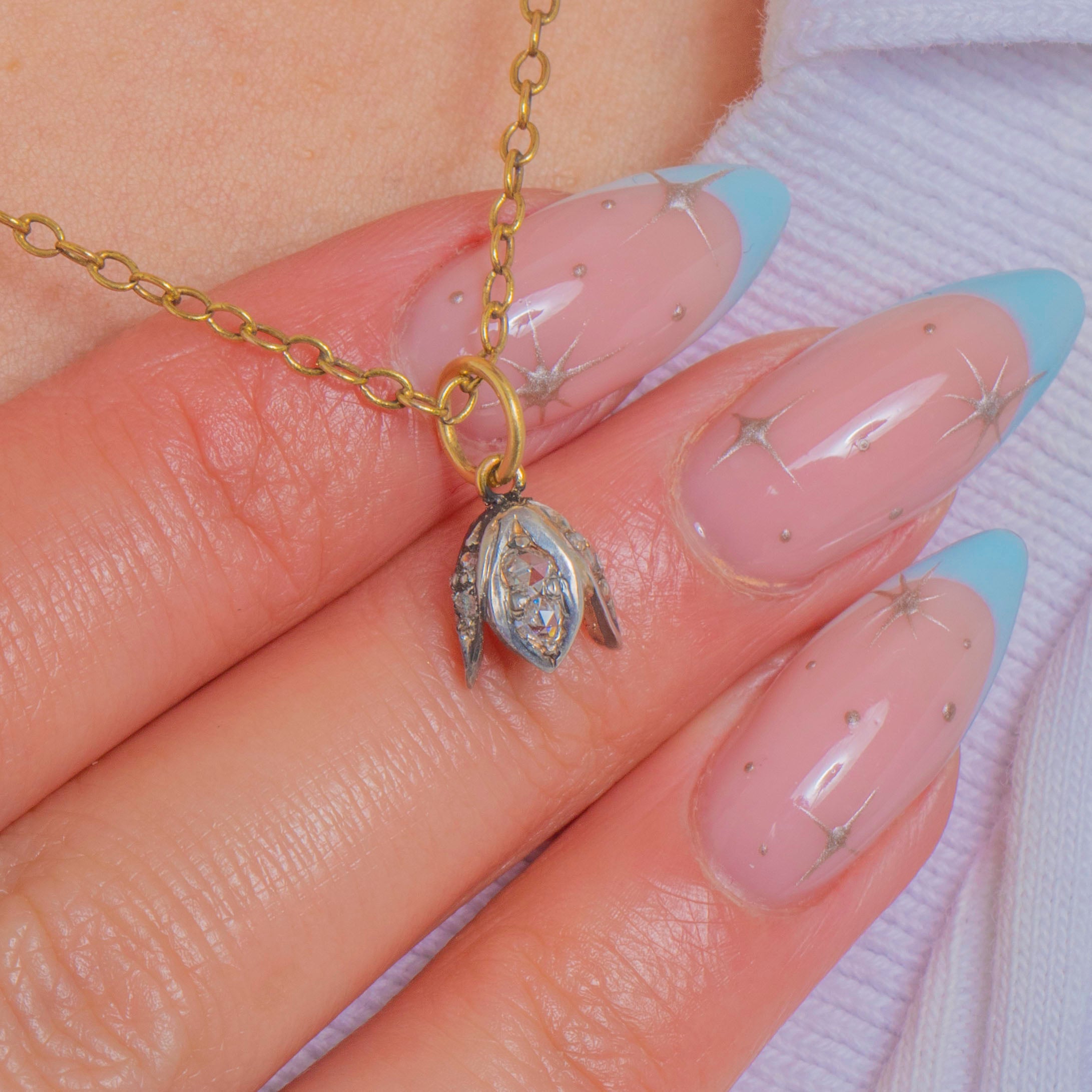 A delicately formed Victorian flower charm crafted in Silver and 18ct Gold and set with glinting rose-cut Diamonds. Petite and refined, its naturalistic trefoil bloom captures the soft, romantic sparkle that rose-cuts are loved for, framed by an elegant two-tone palette that feels effortlessly timeless.
