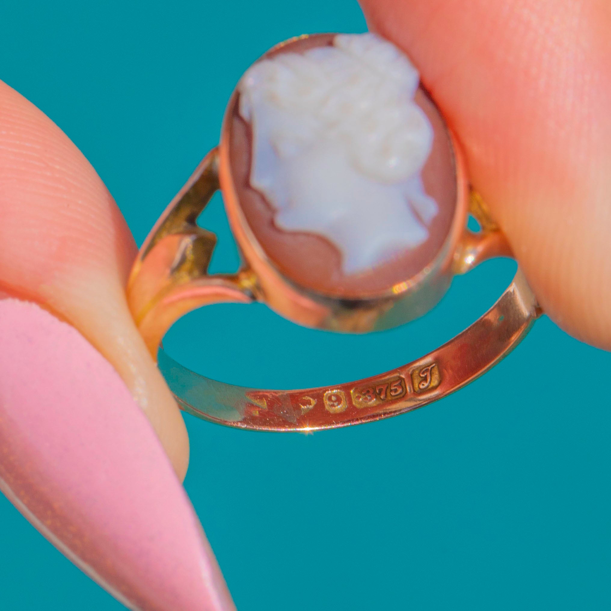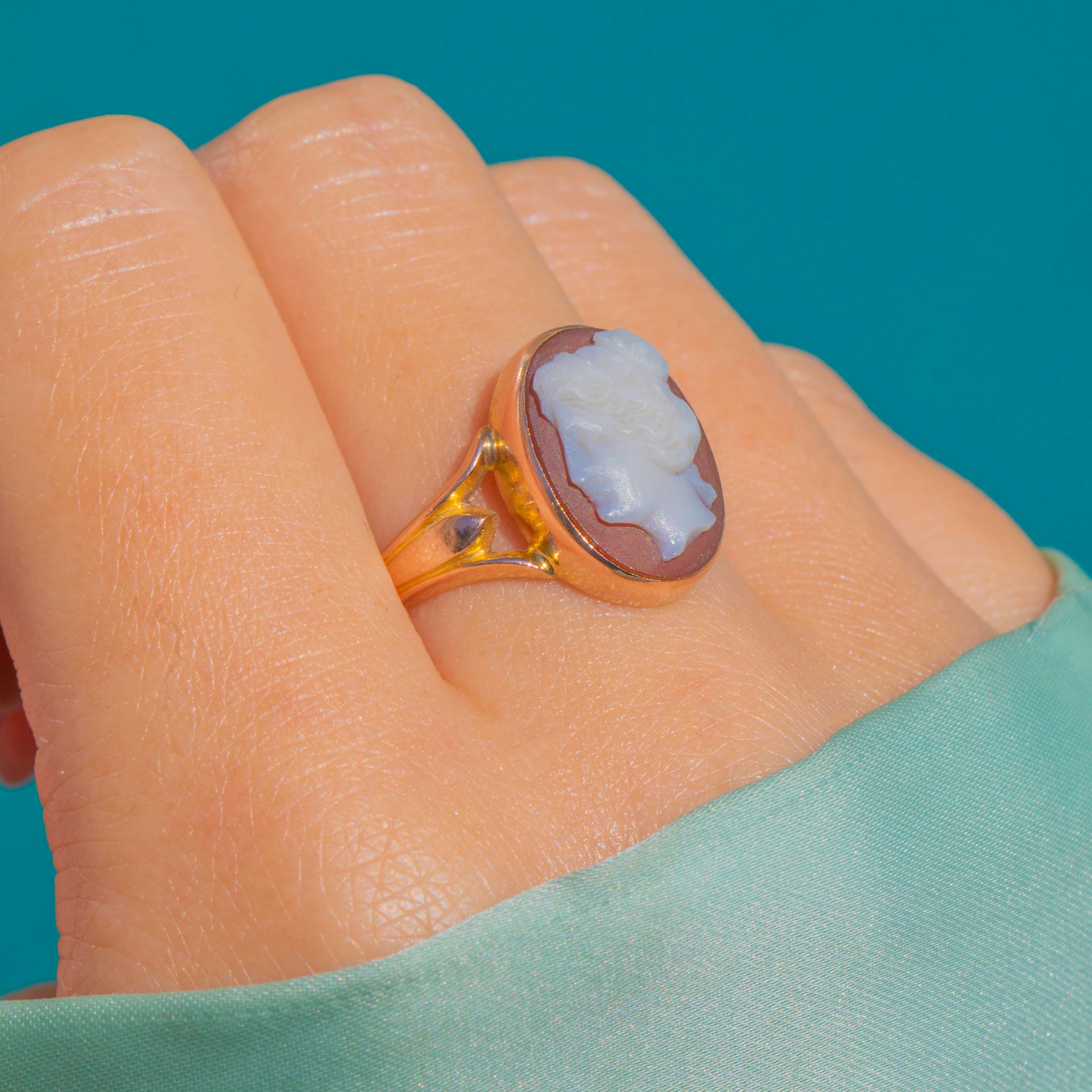 Ein bezaubernder Sardonyx-Achat-Cameoring aus dem frühen 20. Jahrhundert, gefertigt aus warmem 9ct Gold. Das klare weiße Profil ist in Hochrelief über einem satten, tan-braunen Grund geschnitzt, eingefasst von einer schlanken, geschlossenen Zarge und anmutig durchbrochenen, geteilten Schultern für eine elegante, feminine Silhouette.