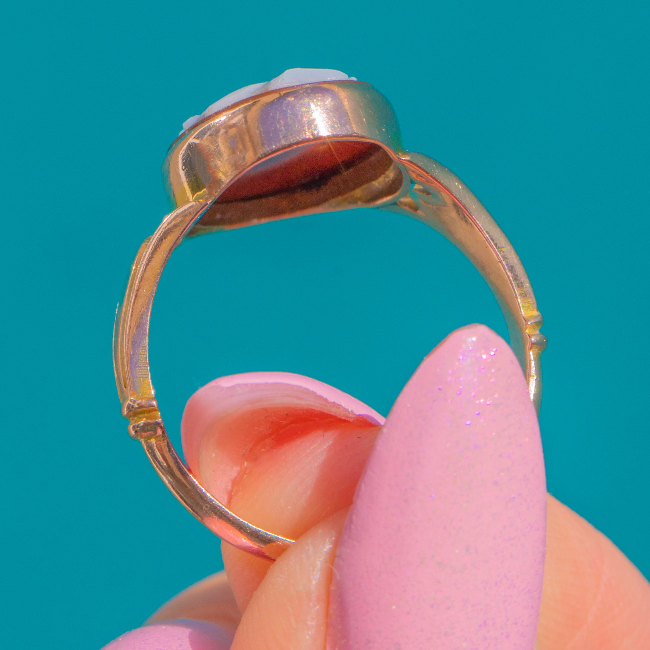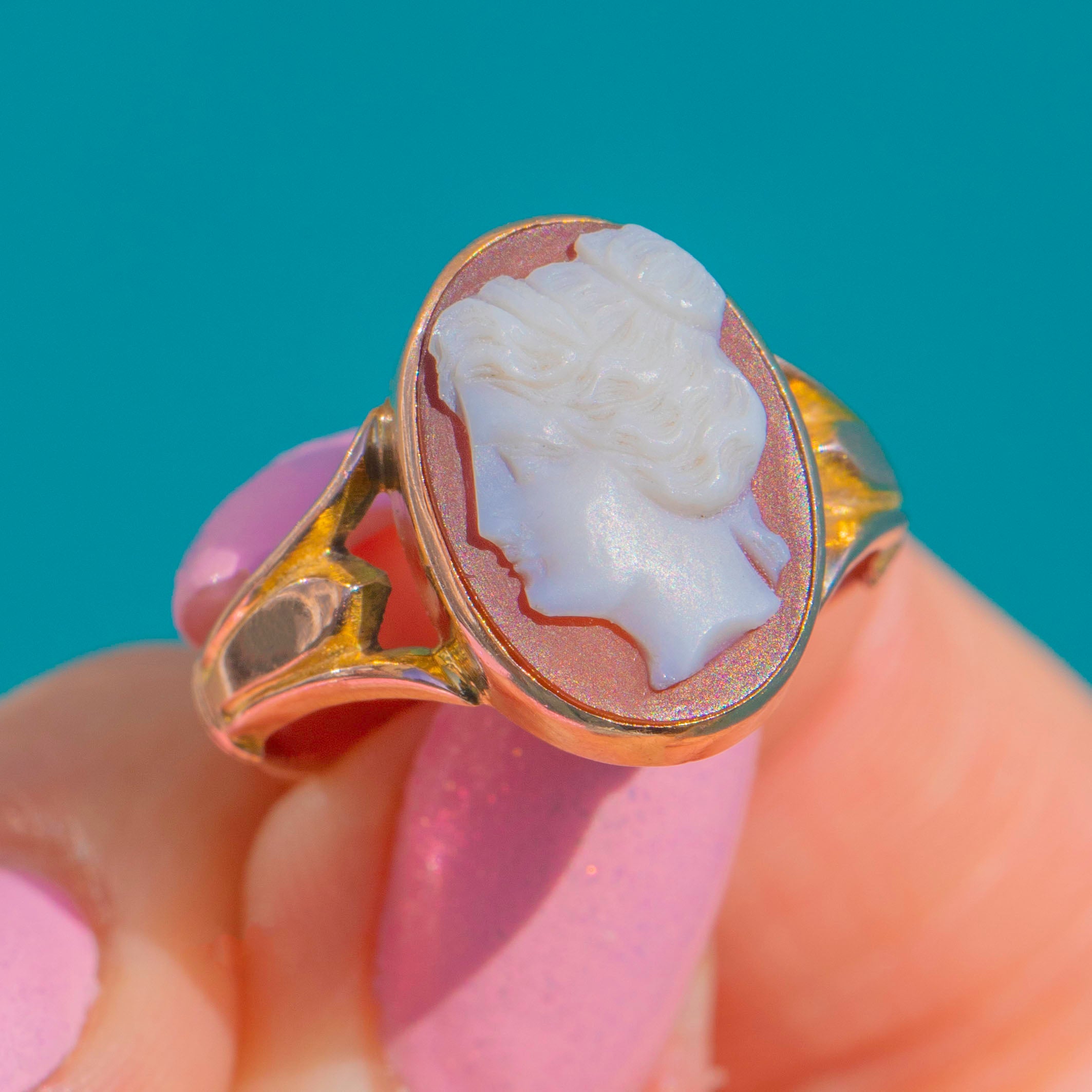 Elegant und tragbar vereint dieses Schmuckstück von 1919 klassische neoklassizistische Kunstfertigkeit mit einer feinen Goldfassung. Die Gravur des Cameos zeigt eine wunderschöne Definition und Textur und setzt einen zeitlosen Akzent – ob einzeln getragen oder als Teil einer kuratierten Ringkombination.