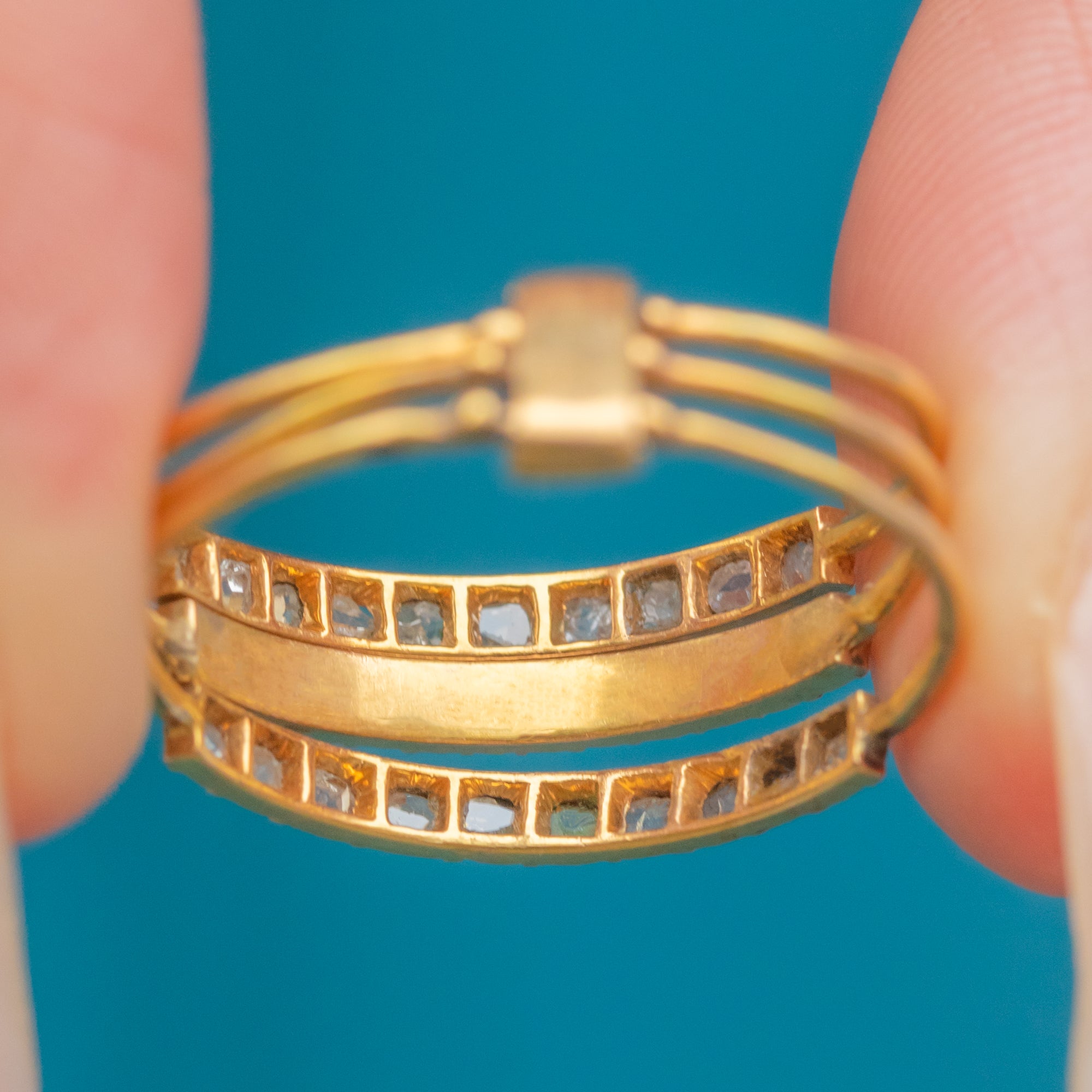 EXCELLENT: The ring is in superb condition for its age. All gemstones are securely set with no chips, losses, or abrasions. The multiple bands are intact, showing no signs of repair, and the Gold has retained a bright, even finish. A beautifully preserved Georgian ring.