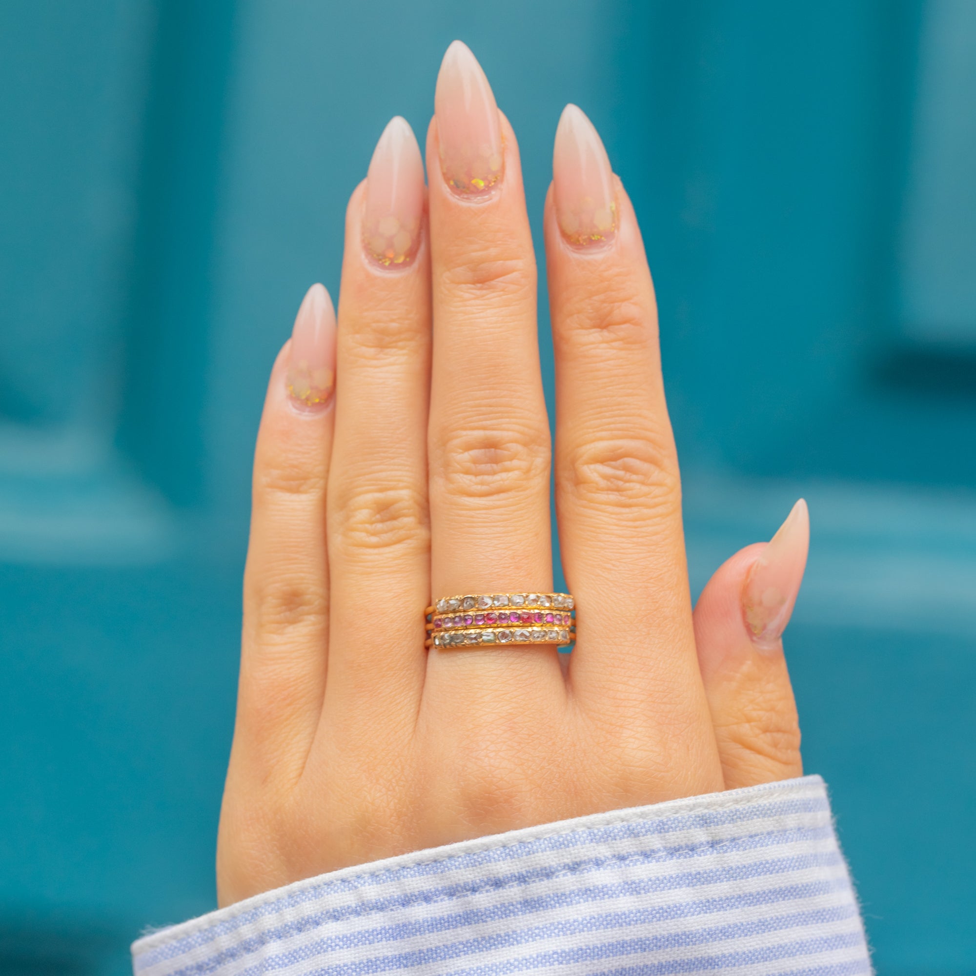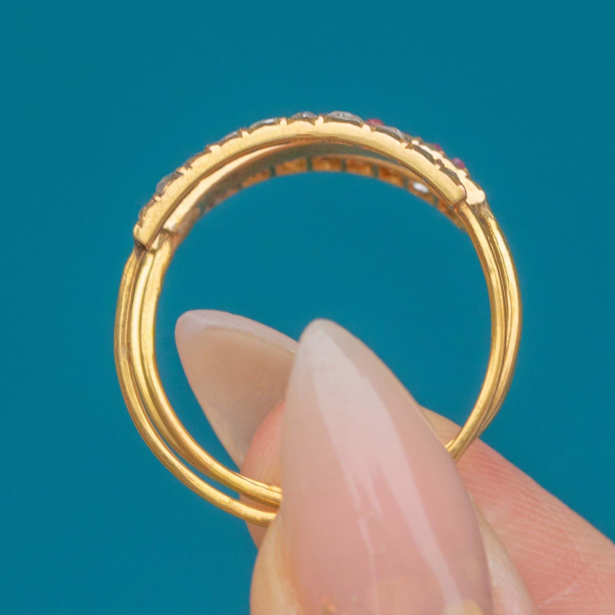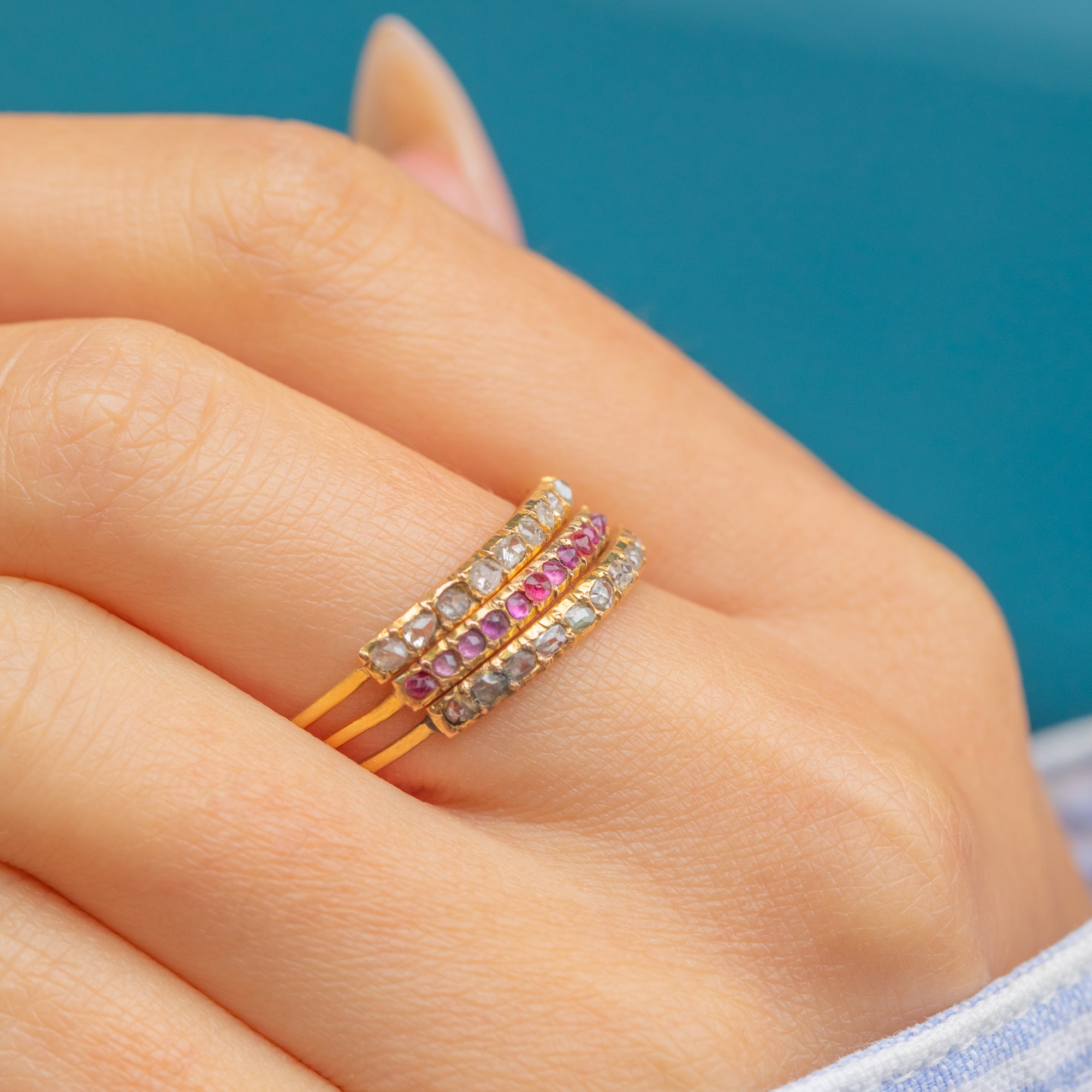 This rare Georgian Hareem ring is set with a vibrant combination of Rubies and Diamonds in 18ct Gold. Hareem rings, with their distinctive multiple bands fused together, were a fashionable choice in the late 18th and early 19th centuries, symbolising both opulence and status.