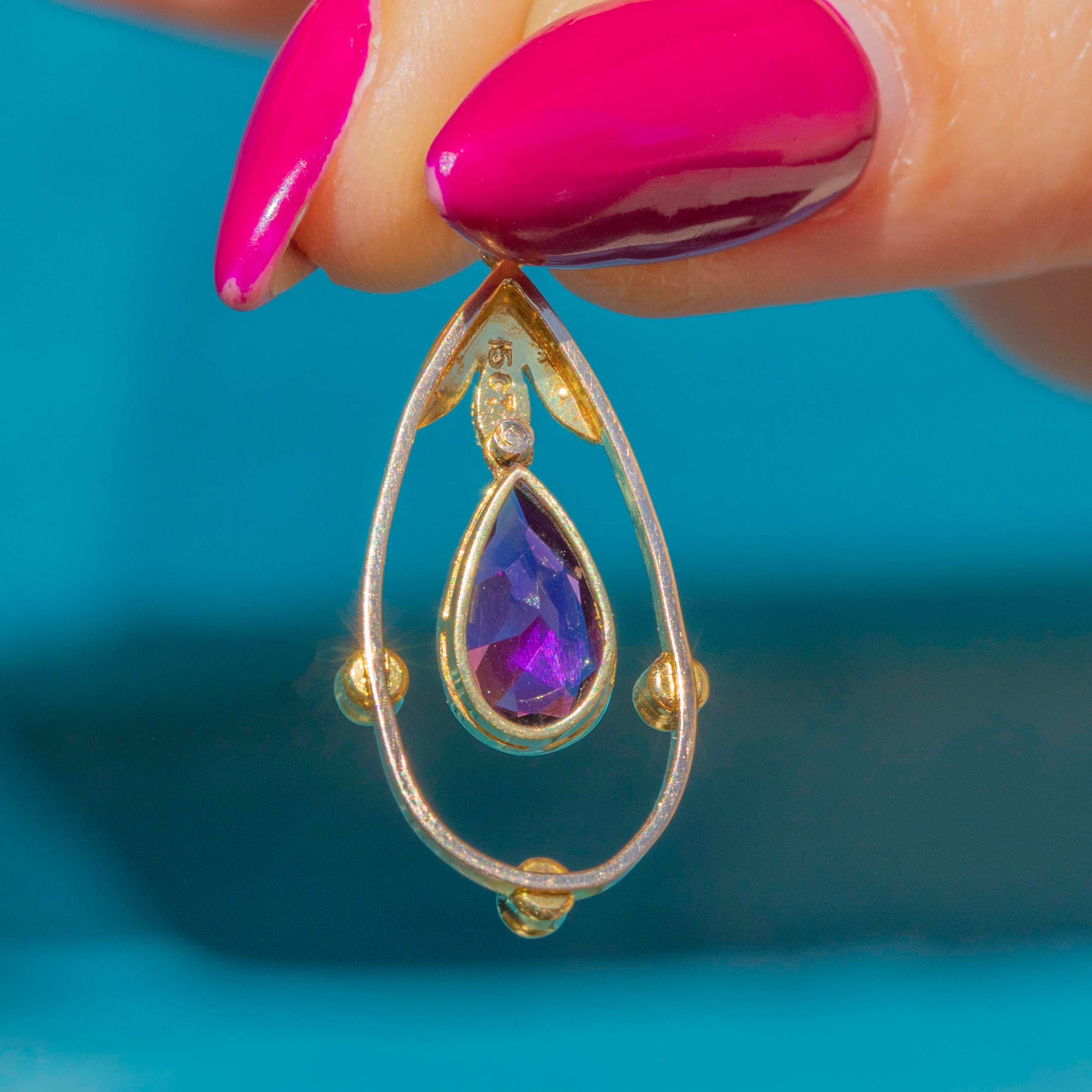 Crafted from bright and buttery 15ct Gold, this antique pendant suspends an elegant pear-shaped 0.70ct Siberian Amethyst, with saturated royal purple hues radiating from its crisp facets.