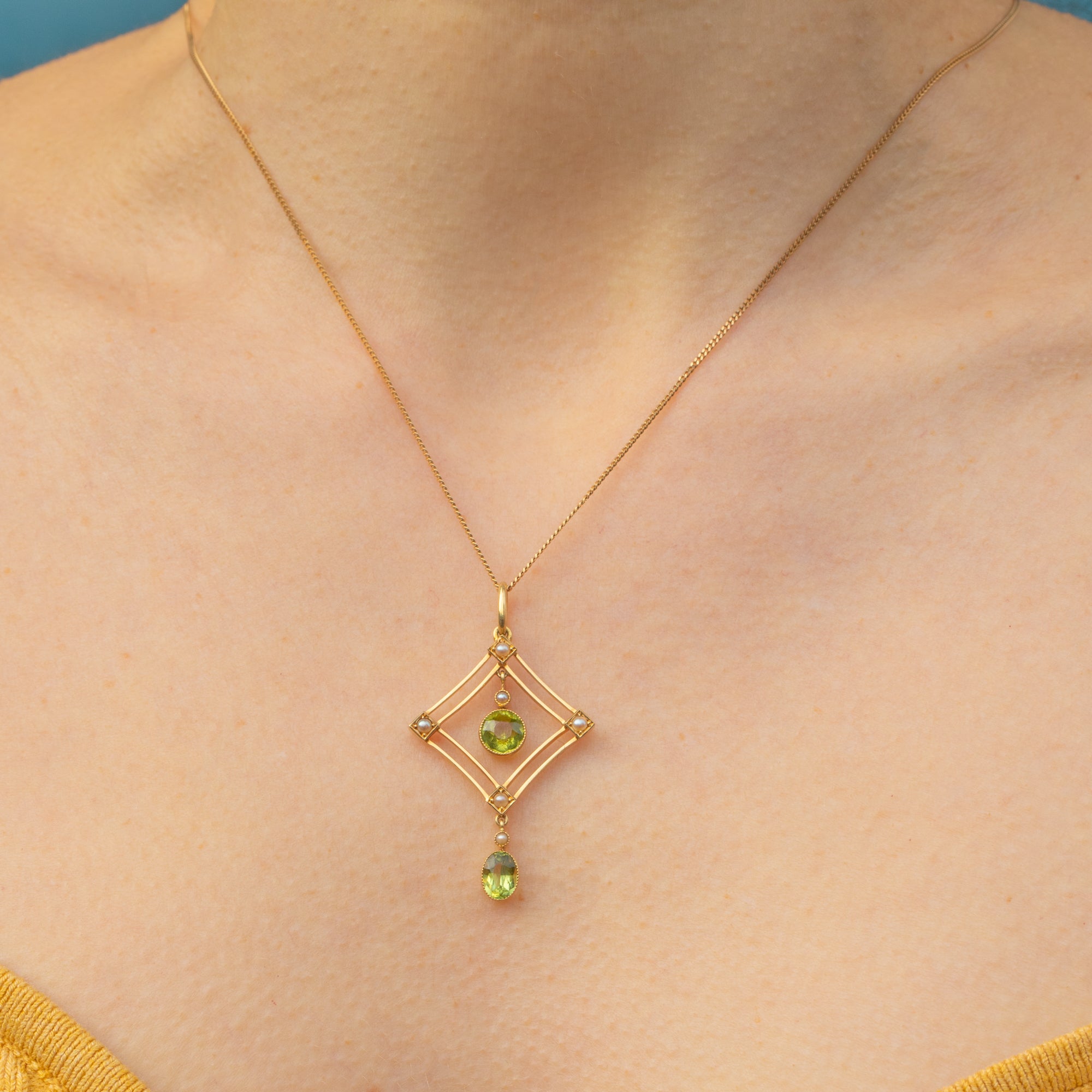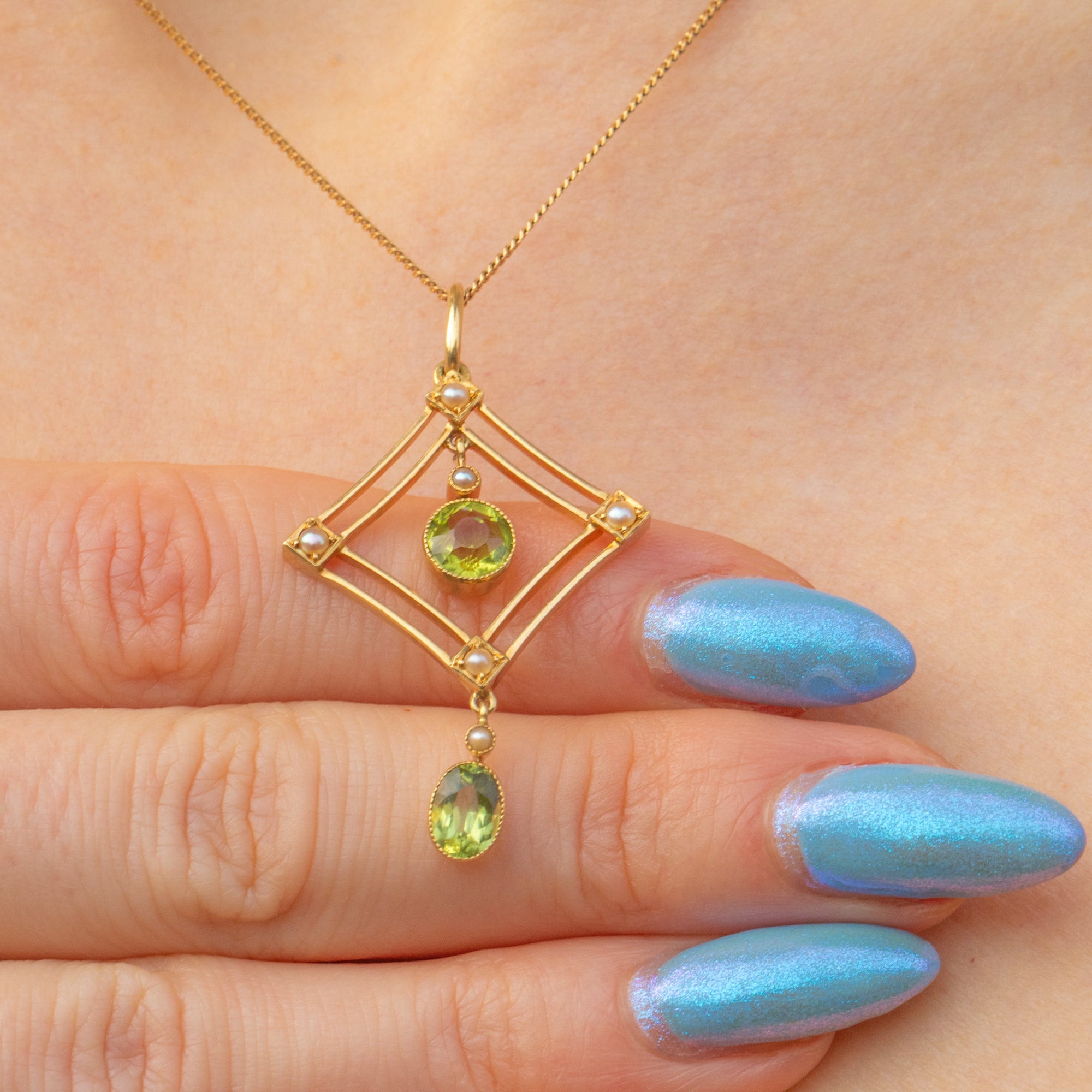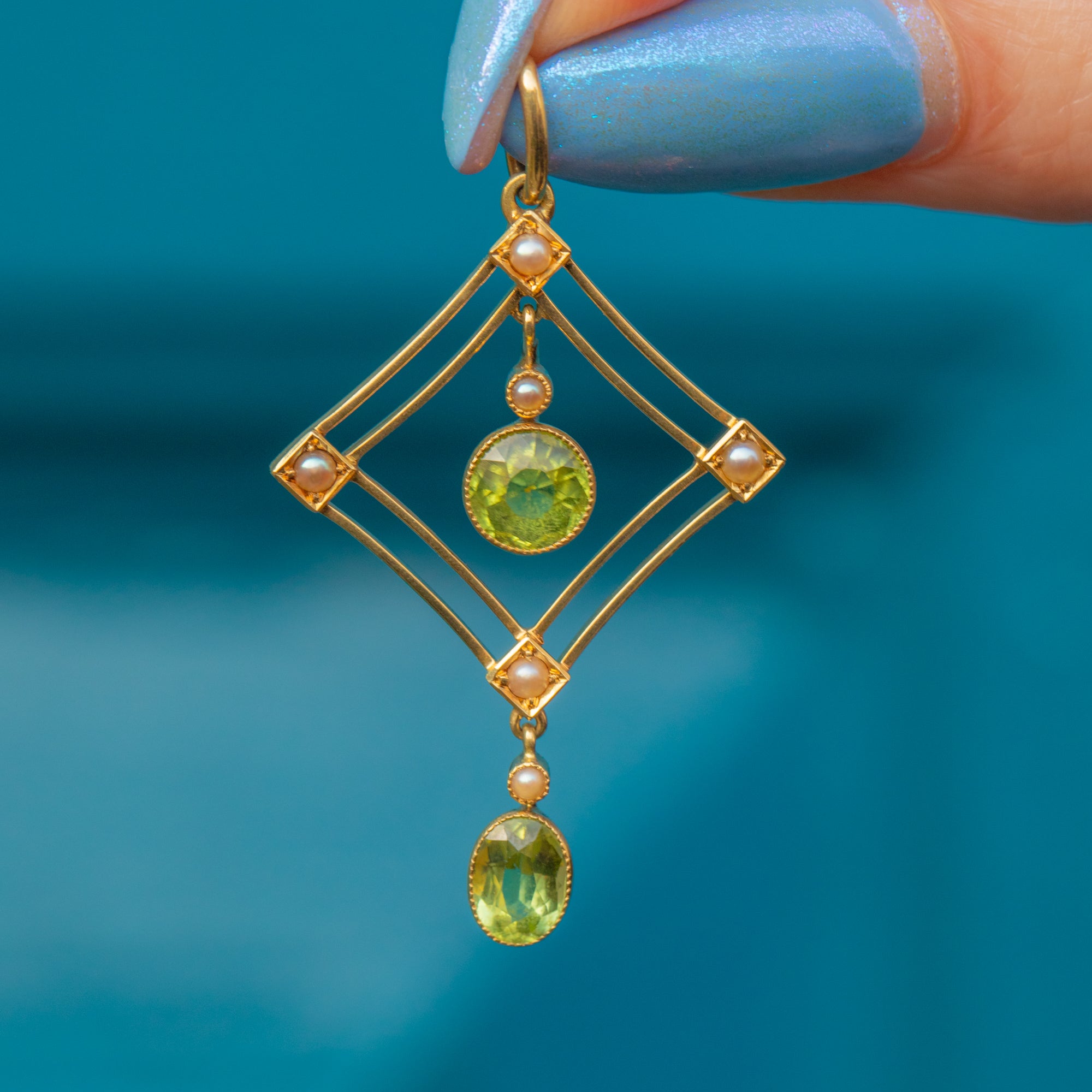 This captivating Edwardian 15ct Gold Peridot Pearl drop pendant is a stunning piece for any collection! Her rich 15ct Gold design forms an elegant structure, adorned with vibrant lime-green Peridot and lustrous Pearls.