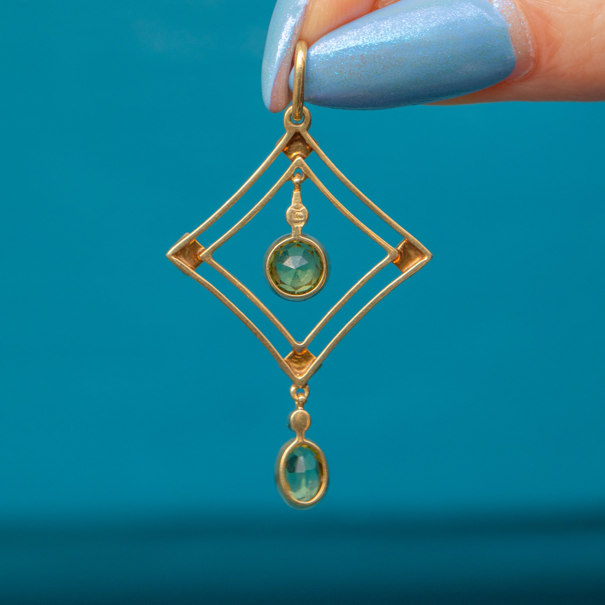 Featuring a suspended Peridot drop at the base, this pendant offers a graceful, flowing movement when suspended from an antique Gold chain. Radiating femininity, this antique Gold Peridot pendant is sure to be cherished for generations!