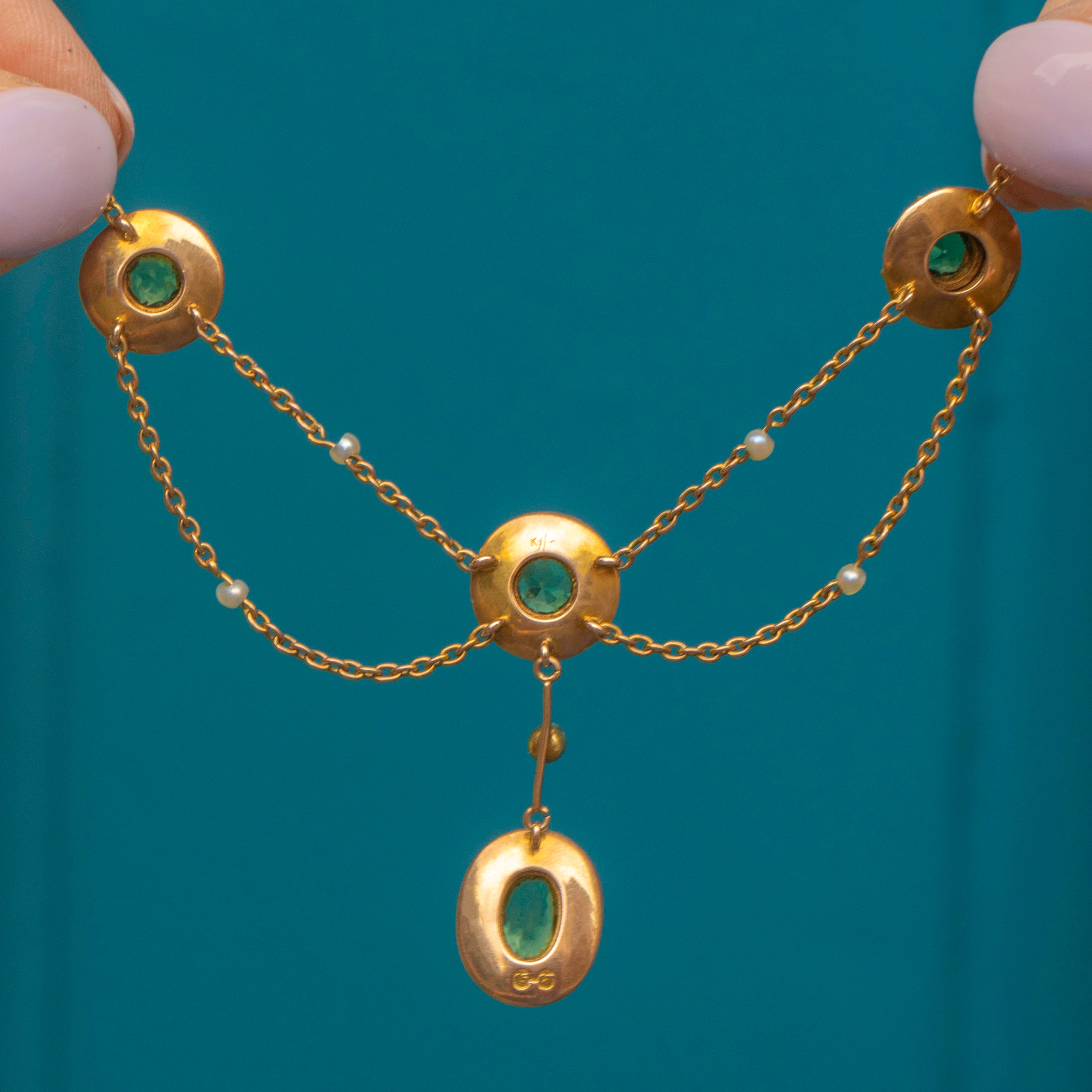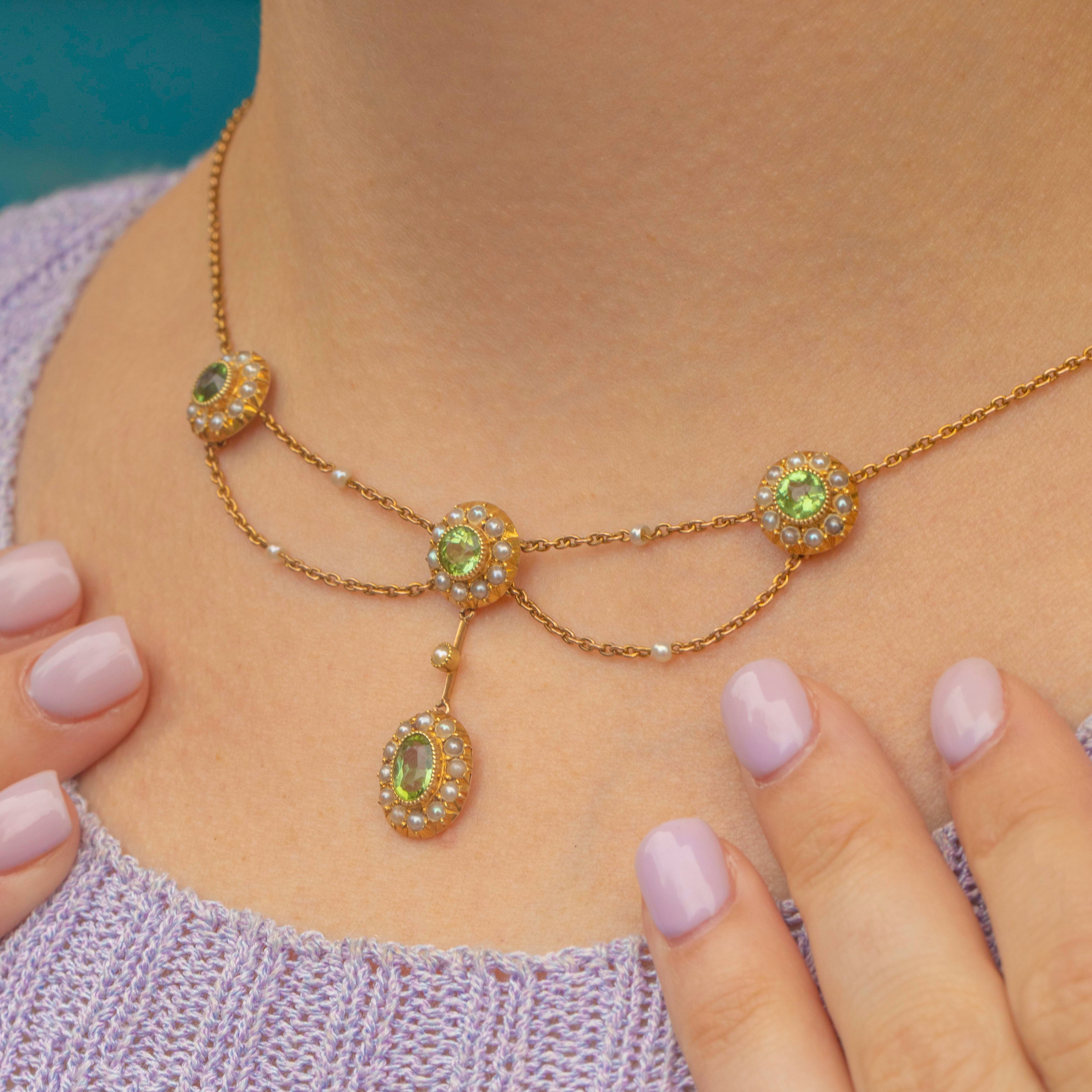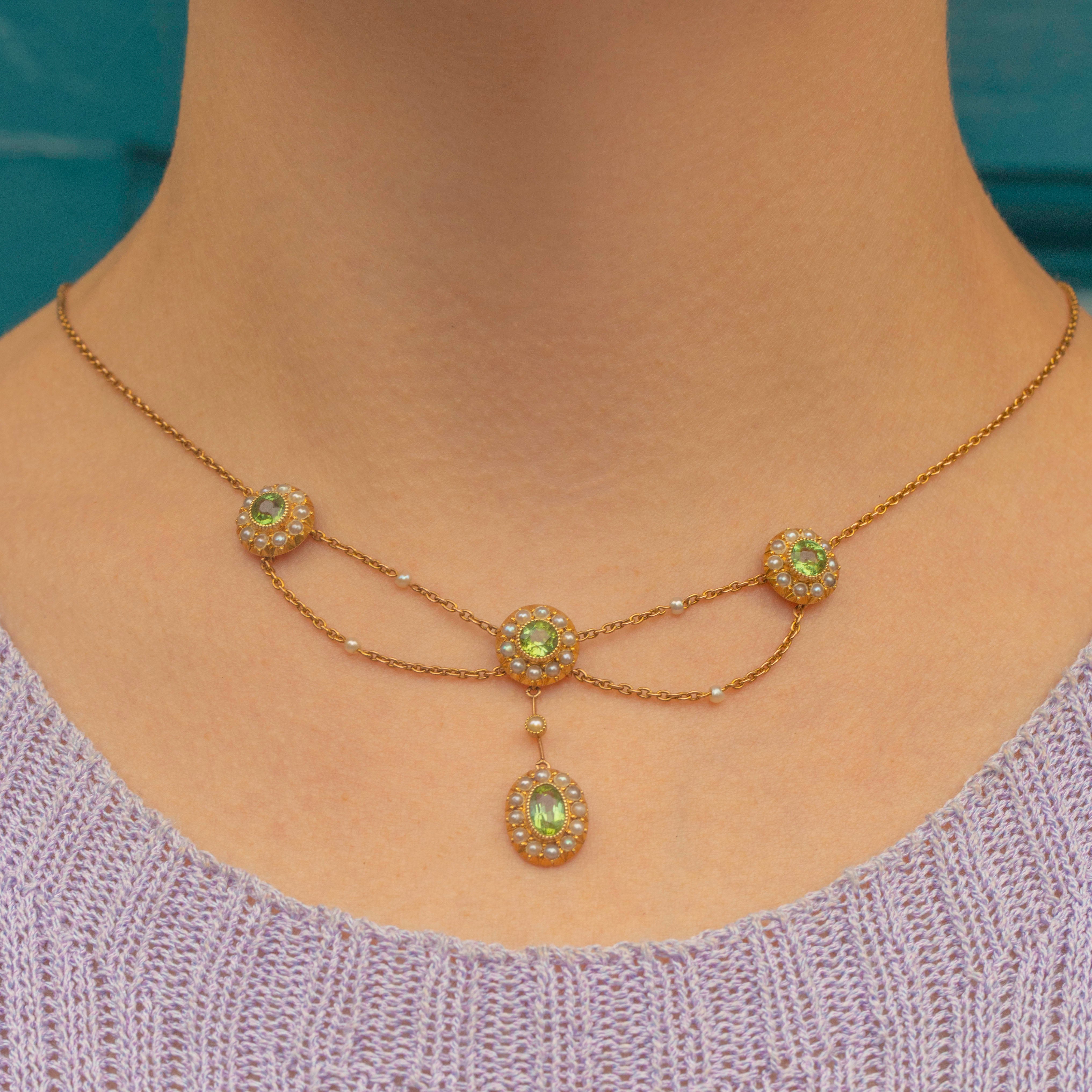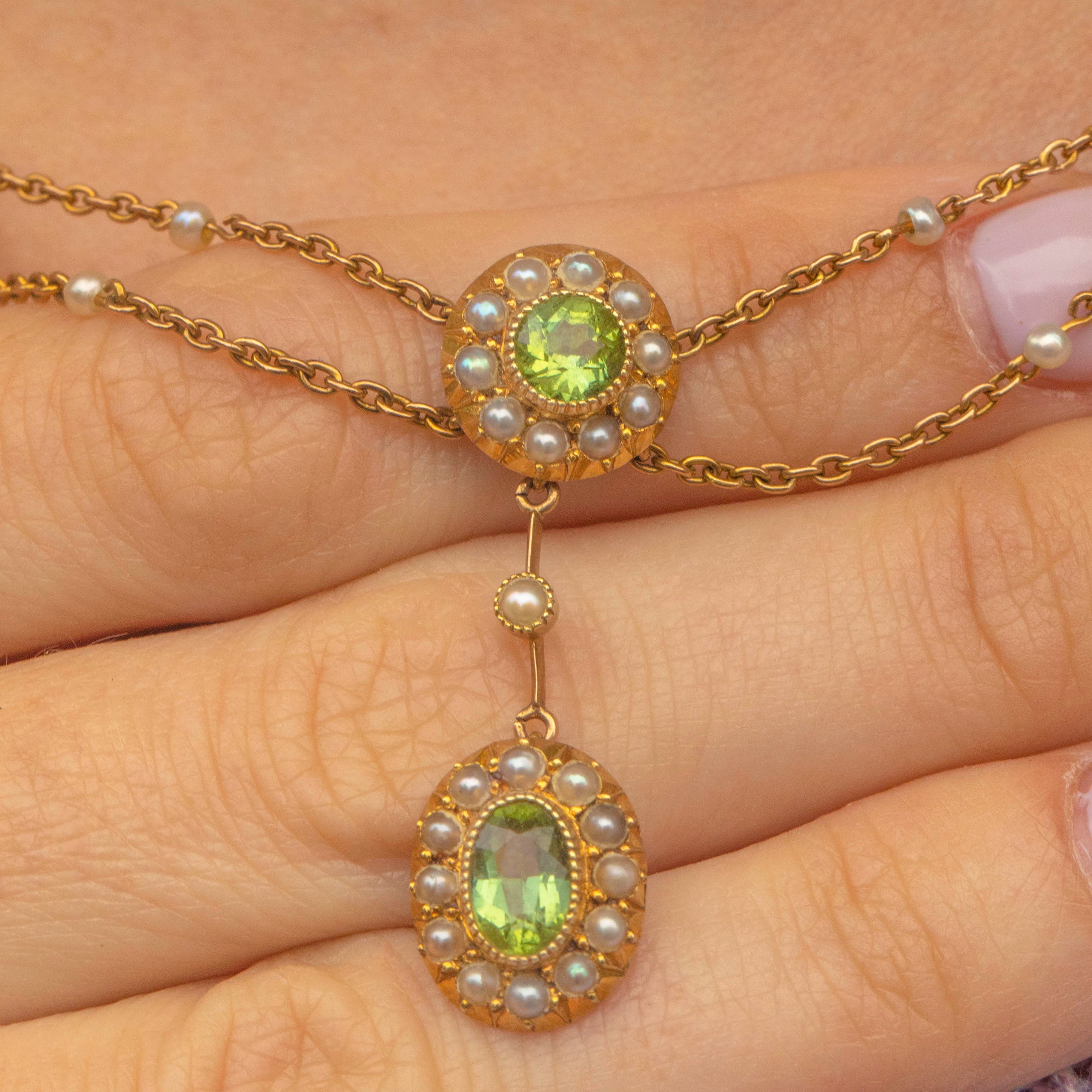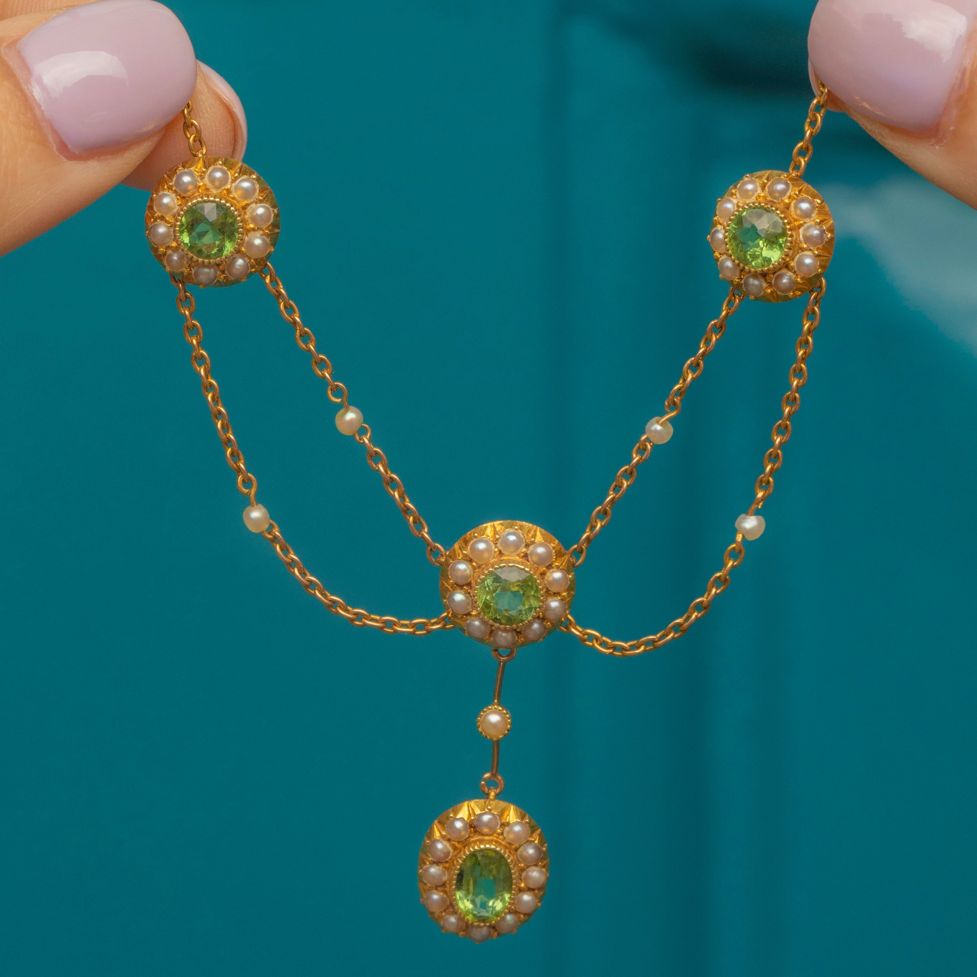 EXCELLENT. We are pleased to present this Edwardian 15ct Gold Peridot Pearl swag necklace in excellent condition. The Peridots are secure within their settings, free from any damage to note with a vivid green hue that glistens between their fabulously faceted forms. Each Pearl is present and secure with their natural nacre remaining intact. The chain is securely interlinked and effortlessly hangs the Peridot Pearl clusters across your chest. With a fully functioning bolt-ring, this Edwardian Gold necklace can be worn with absolute confidence!
