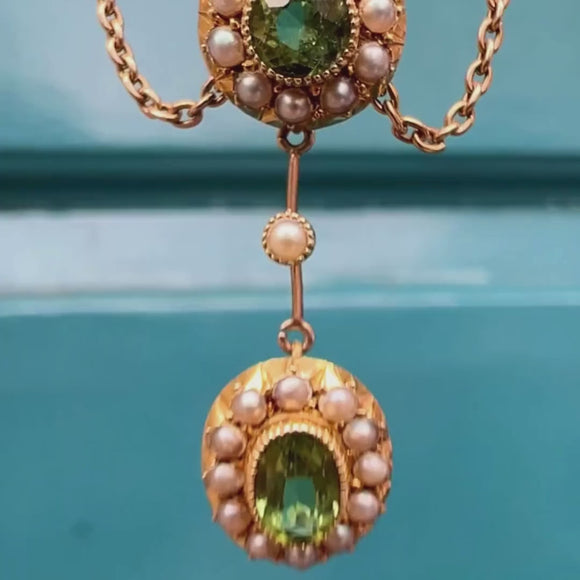 Edwardian 15ct Gold Peridot Pearl Swag Necklace, 1.30ct