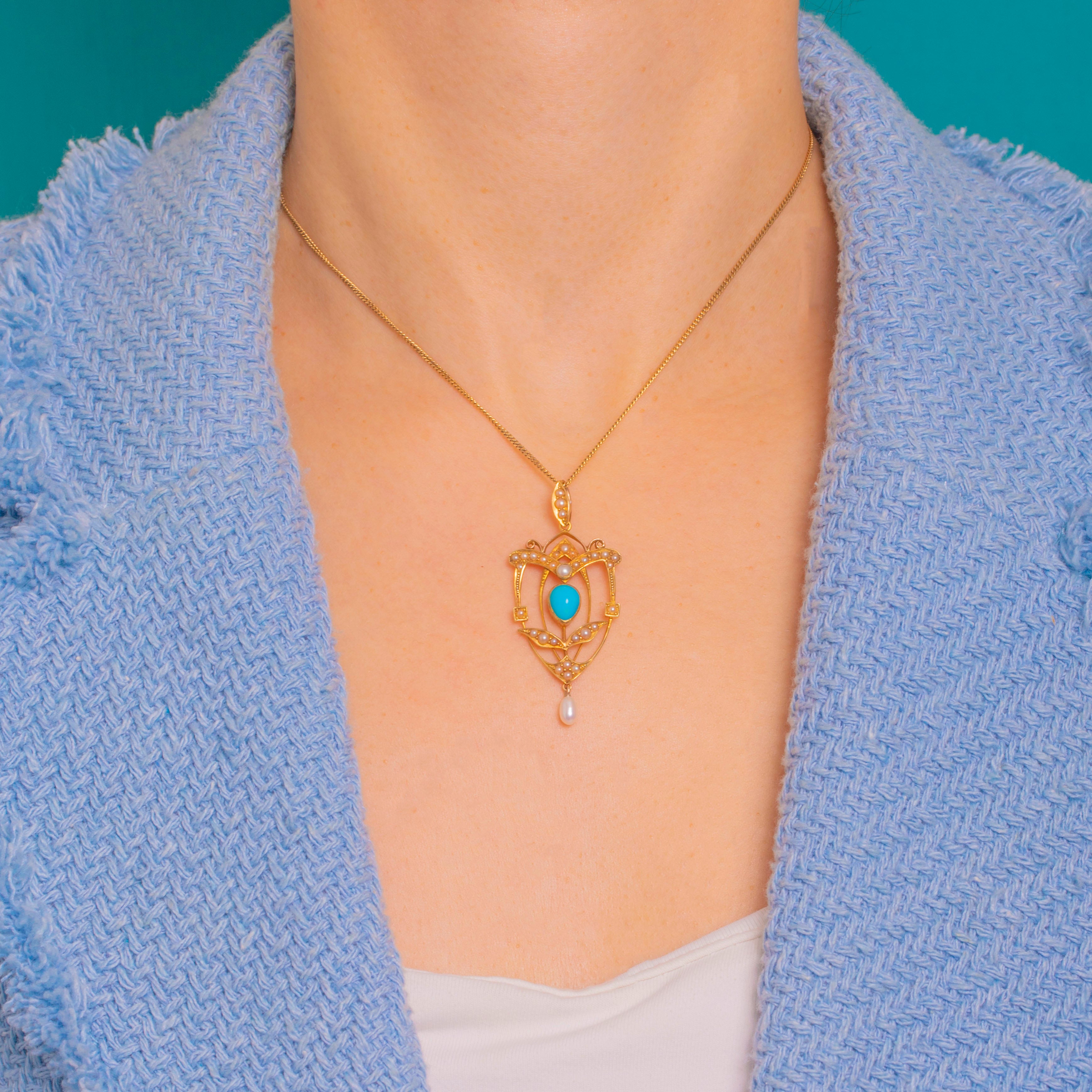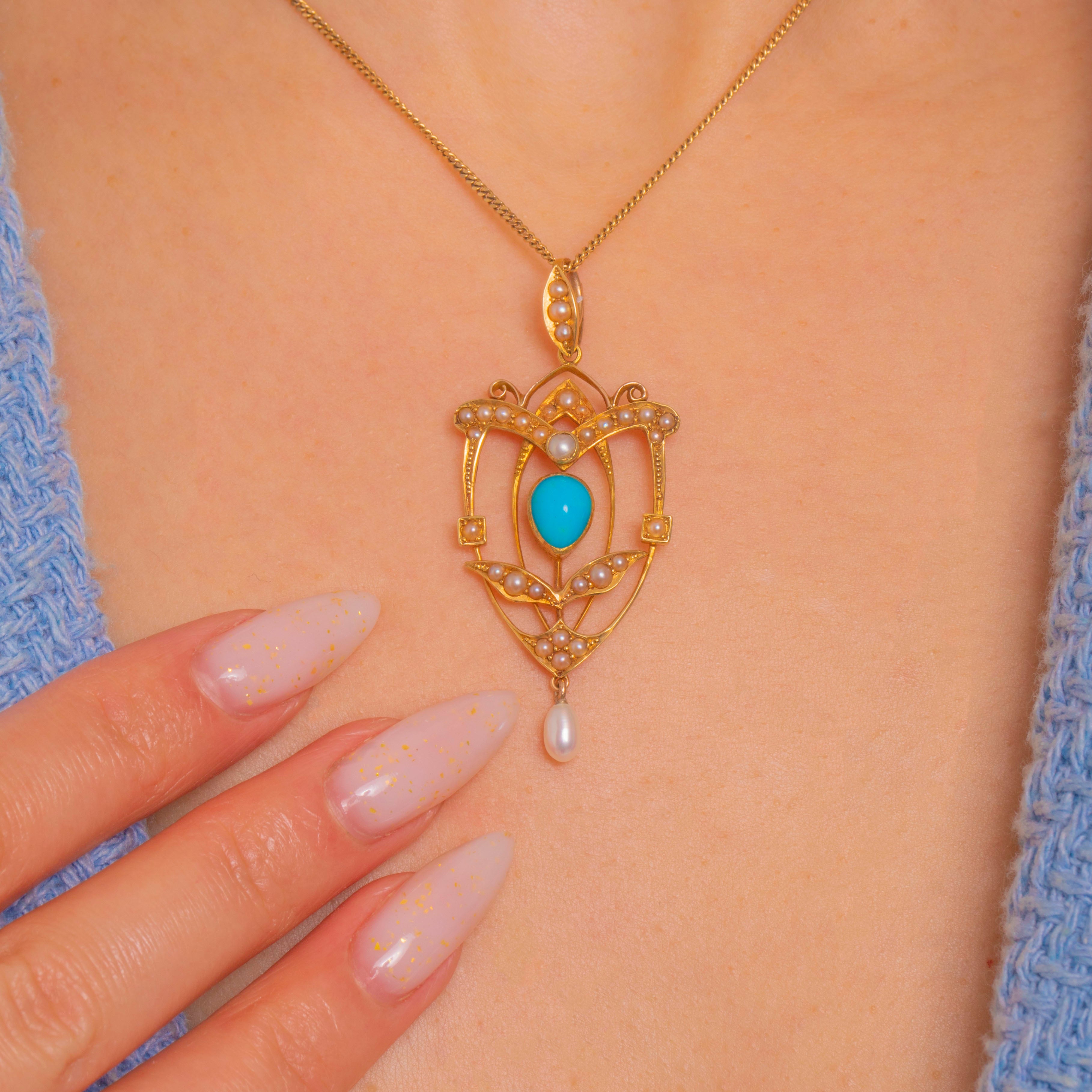 A quintessential Edwardian beauty, this openwork shield pendant is crafted in rich 15ct Gold and alive with delicate foliate whiplash lines. At its heart sits a vivid oval Turquoise cabochon, framed by a constellation of creamy Seed Pearls that trace the elegant, symmetrical silhouette.
