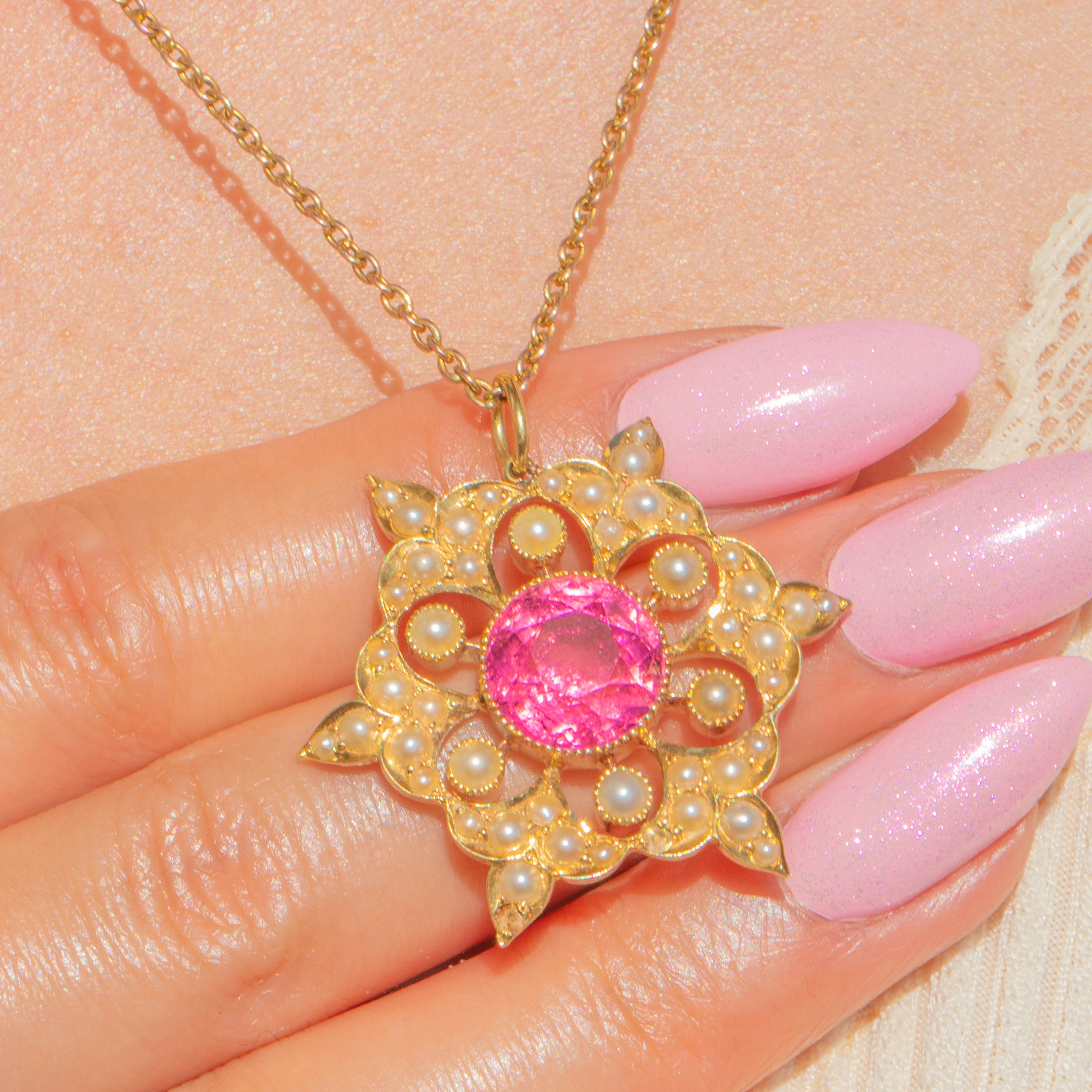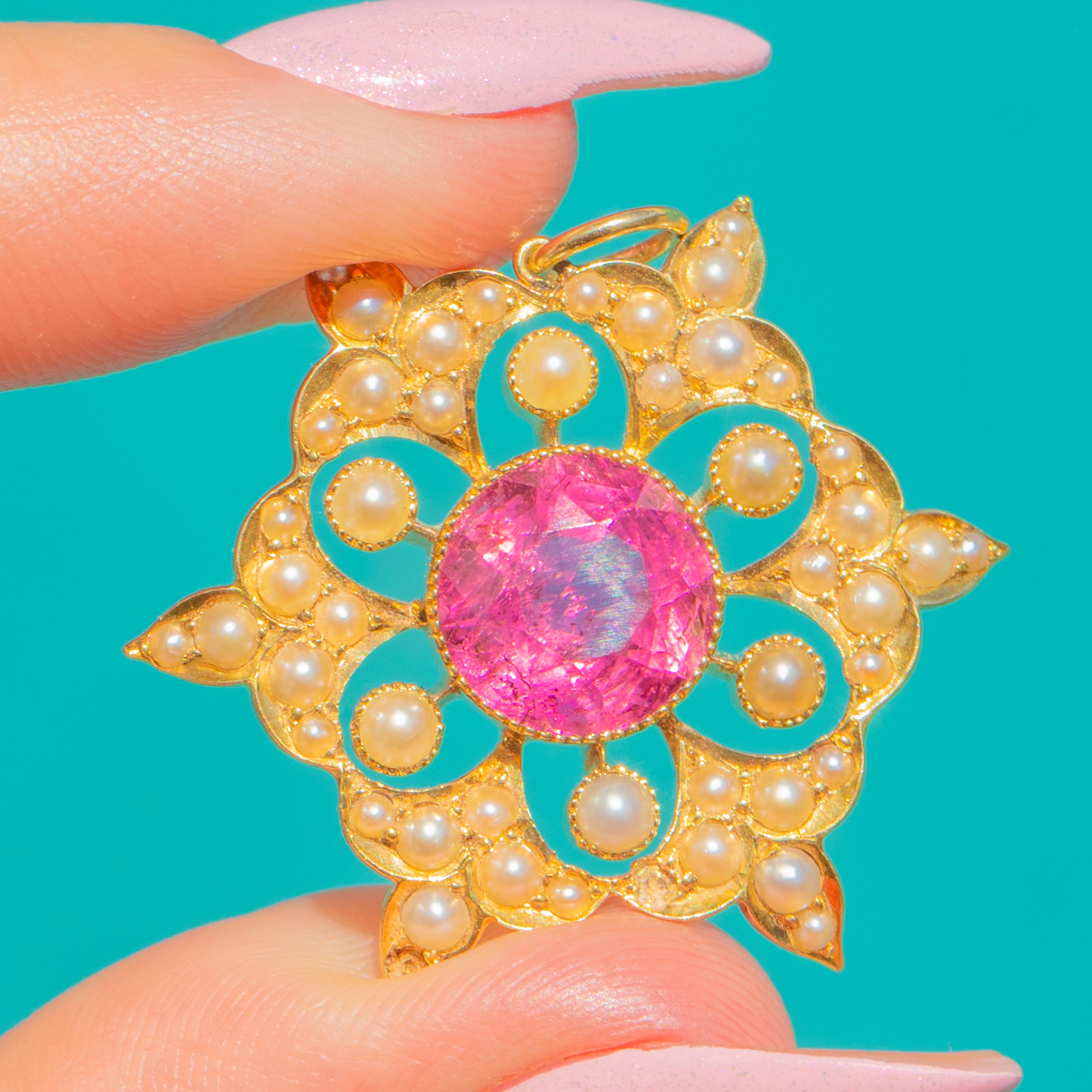 Edwardian Anhänger aus 18ct Gold mit 4,00ct Pink-Turmalin und Perle