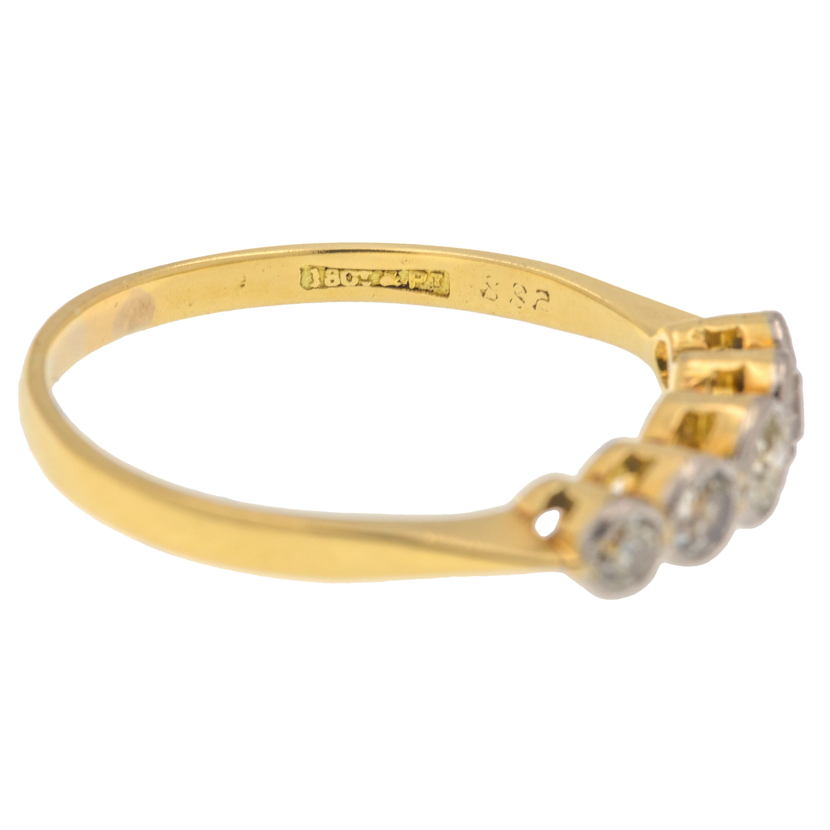 EXCELLENT. This Art Deco 18ct Gold Diamond five stone engagement ring is in excellent condition. The Diamonds are bright and free from any chips or fleabites, each one securely set within its Platinum bezel. The Gold band is robust allowing you to wear this antique Diamond ring all day and all night with confidence!