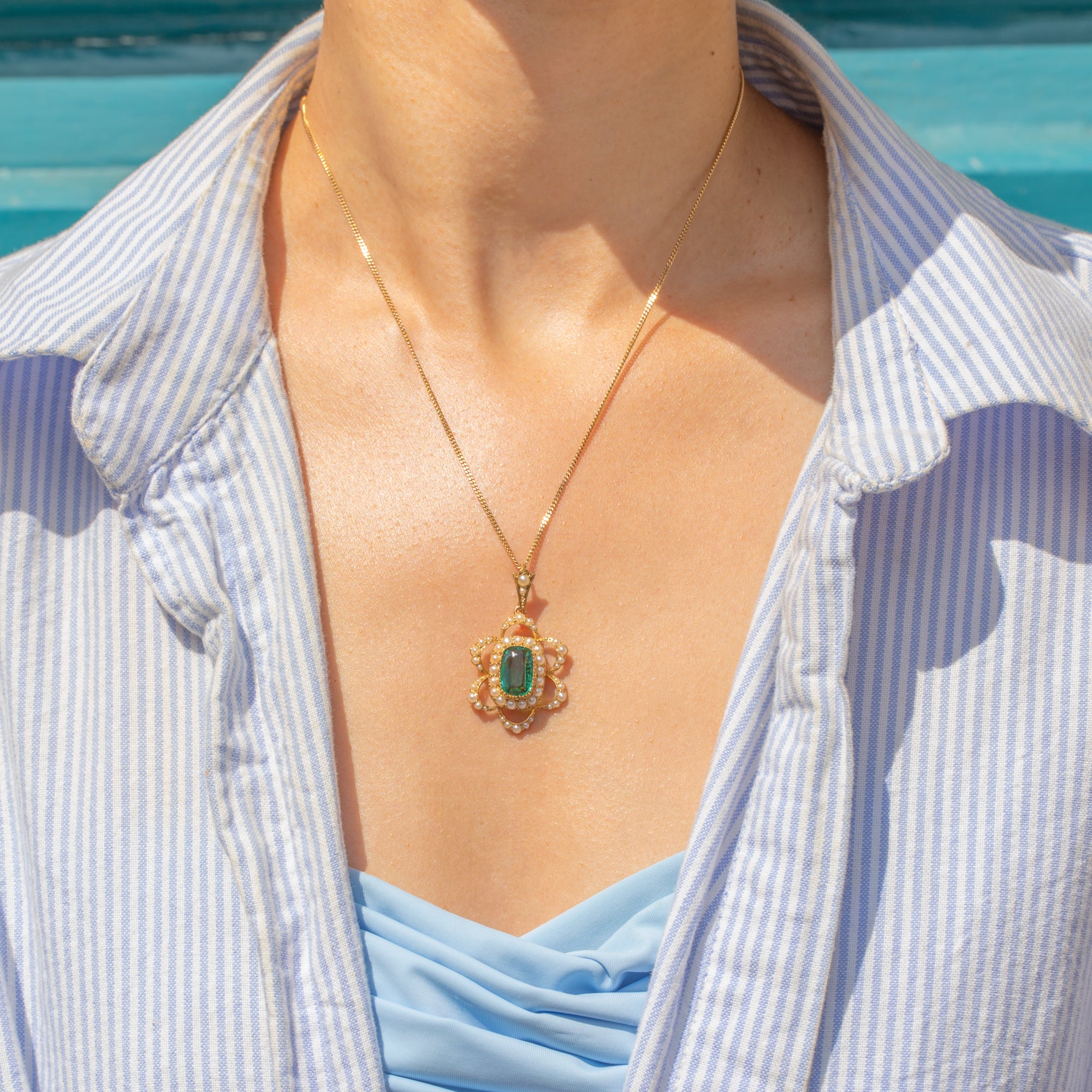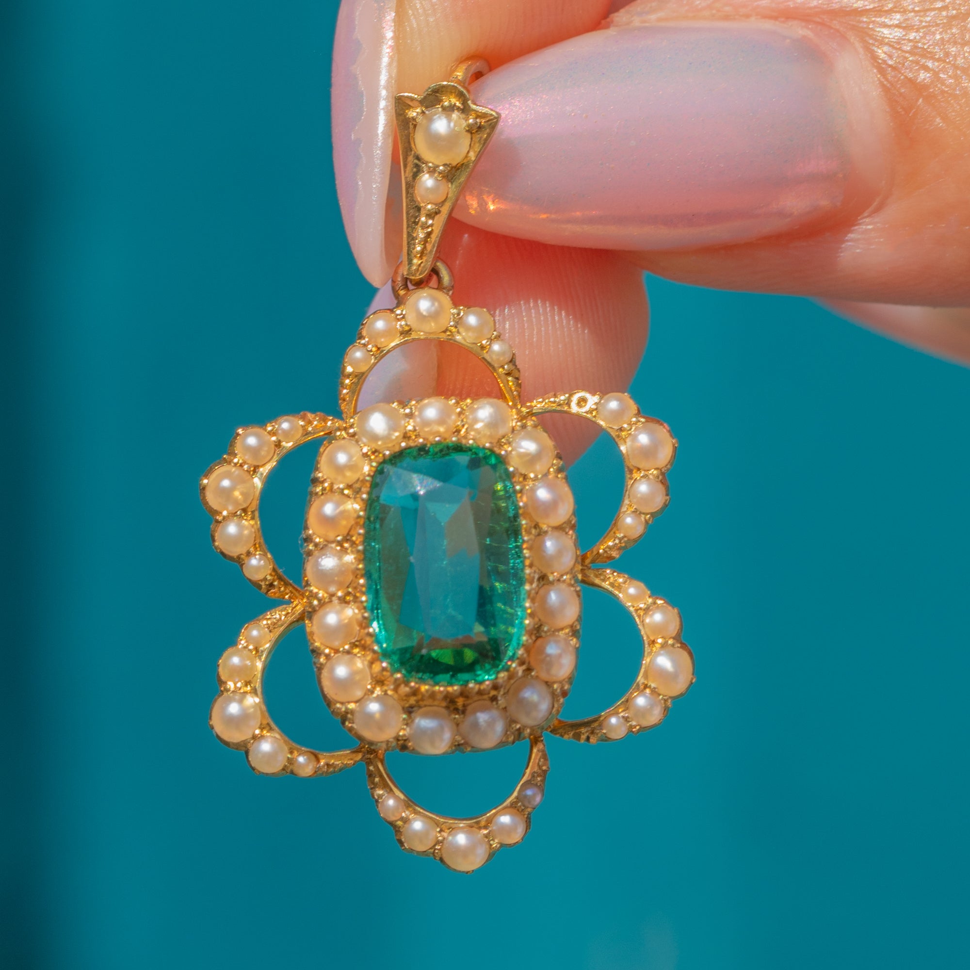 This antique pendant is an exquisite example of Edwardian craftsmanship! The pendant is crafted from brightly saturated 18ct Gold and displays a vibrant, emerald green Tourmaline, surrounded by a generous helping of iridescent Pearls formed into a striking floral design.