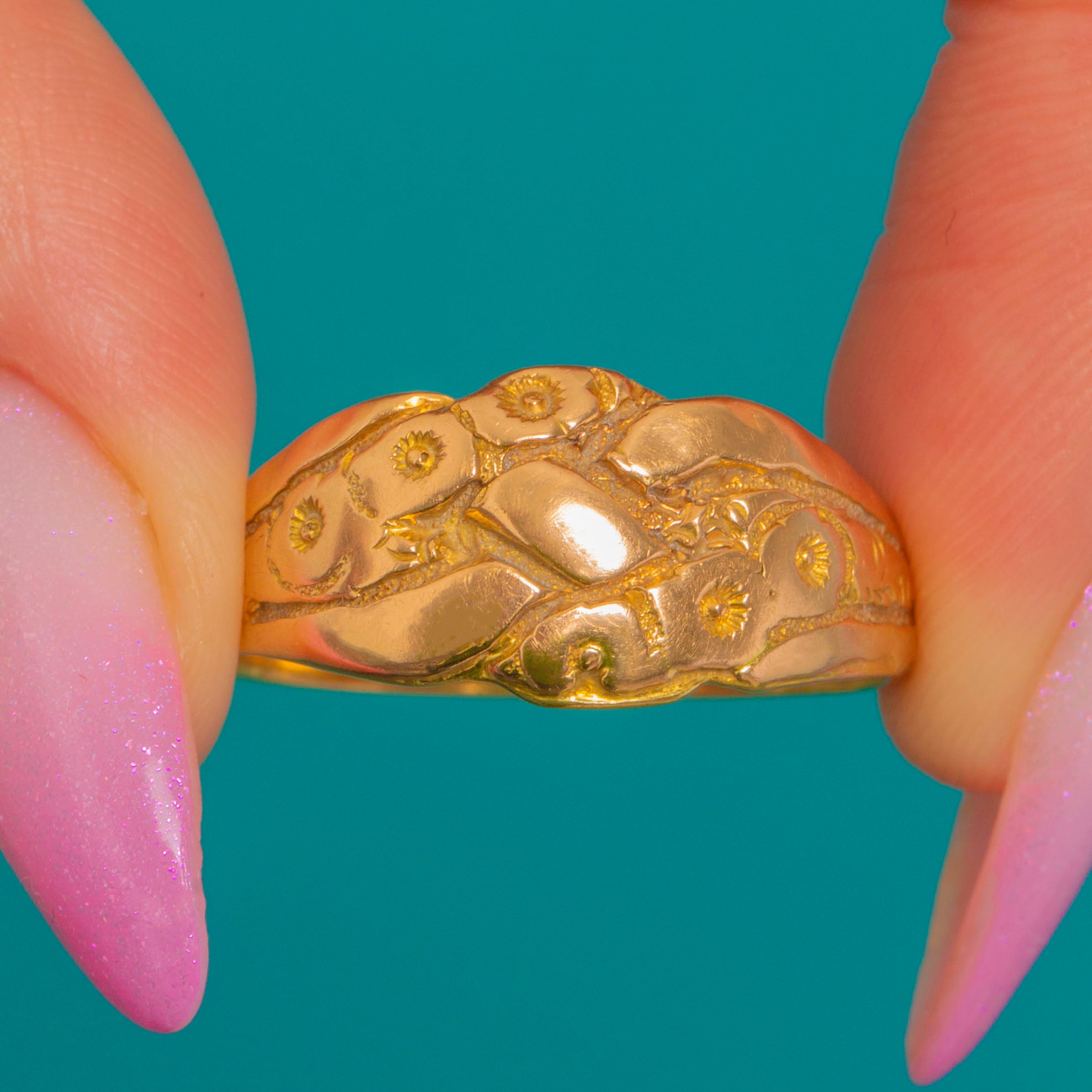 VERY GOOD: The Gold shows light surface wear and gentle softening to the raised details with a pleasing patina in the recesses, consistent with age. Evidence of a past resize to the shank; structurally sound with no obvious dents or repairs observed.