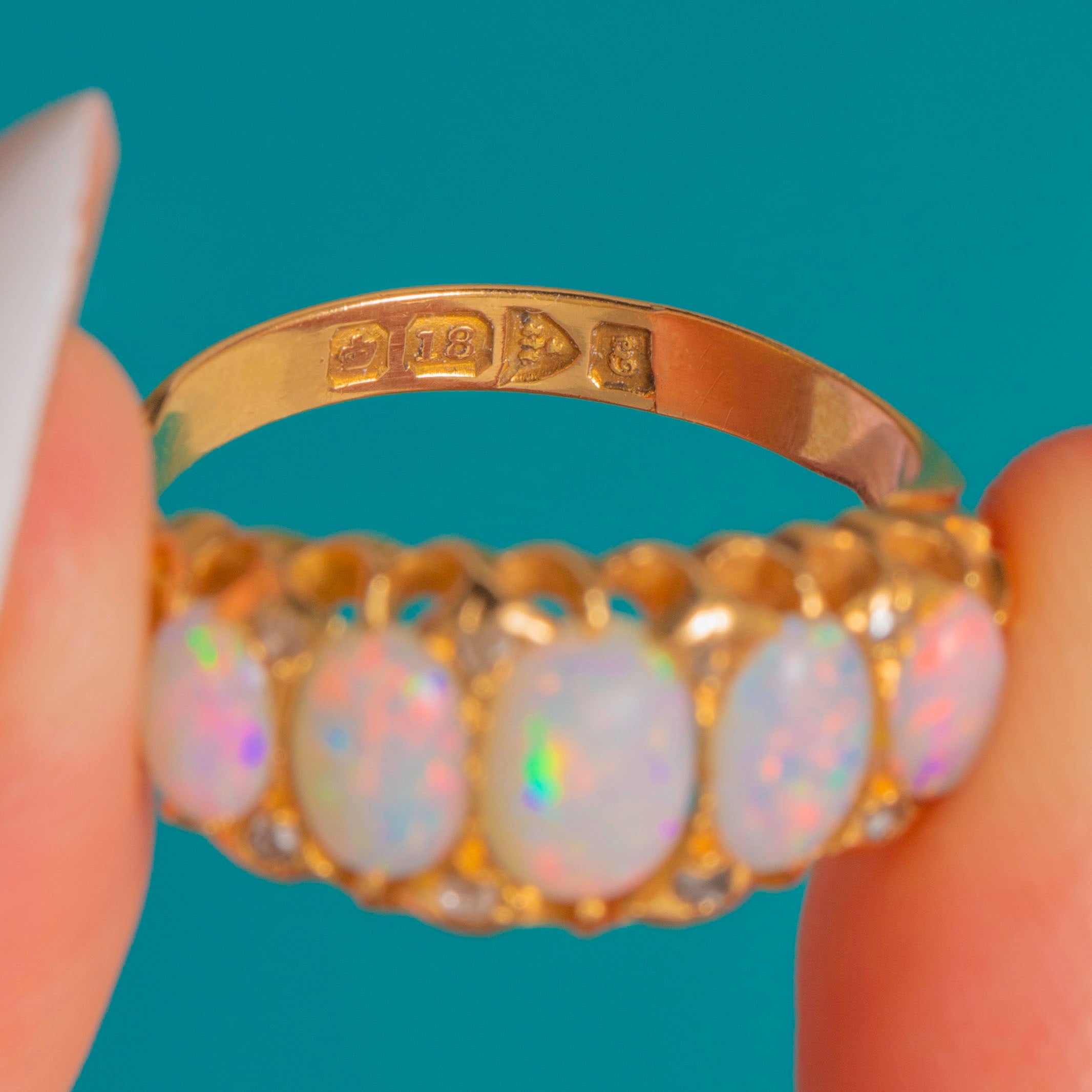 Edwardian 18ct Gold Opal Five Stone Ring, Diamond Spacers