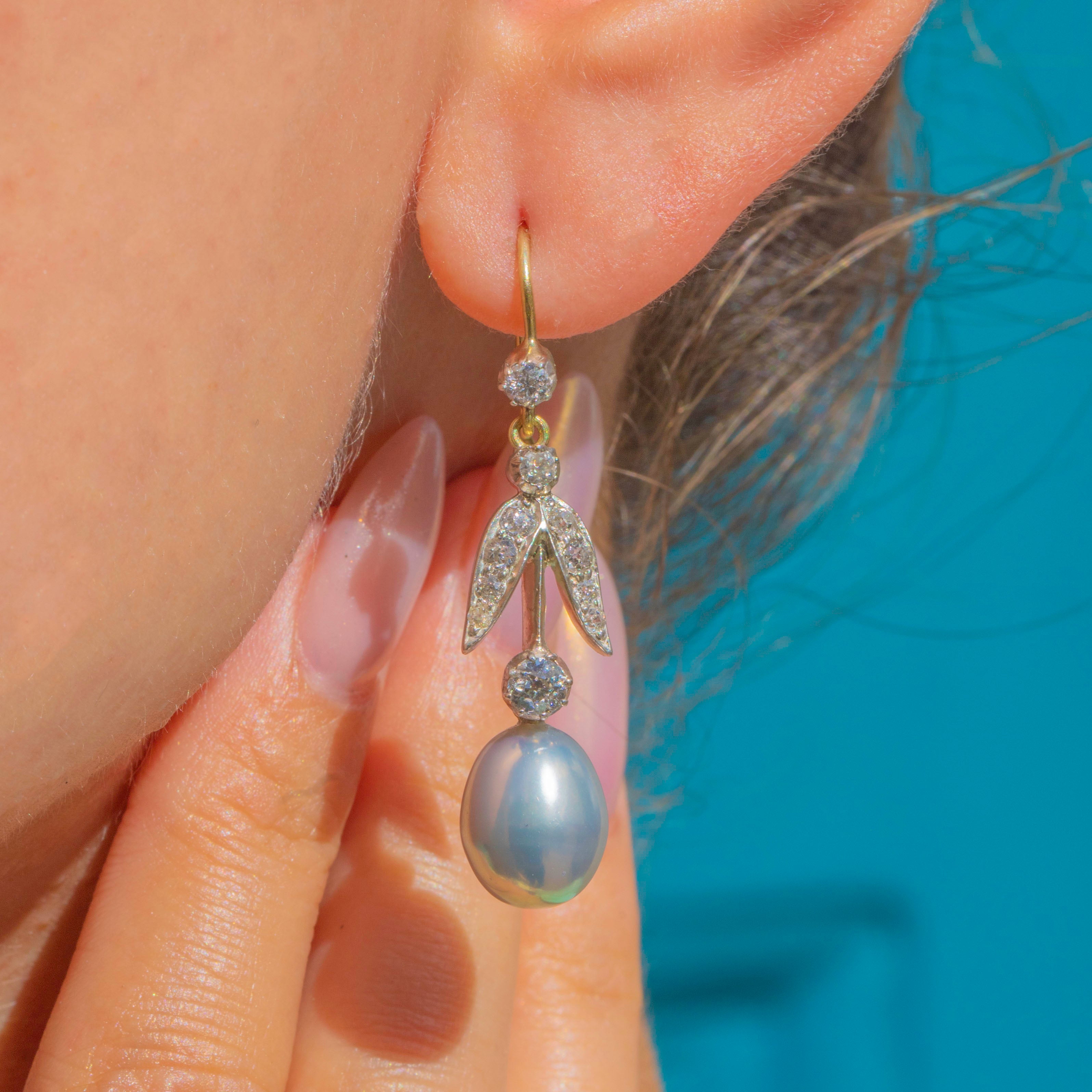 A stunning pair of Edwardian drop earrings, designed with natural elegance and refinement. Each earring suspends a lustrous Pearl from a delicate leafy motif set with Diamonds. The graceful leaves are crafted in Silver, pavé set with sparkling old-cut Diamonds, while the hooks are fashioned in 18ct Gold—a classic Edwardian combination of precious metals.