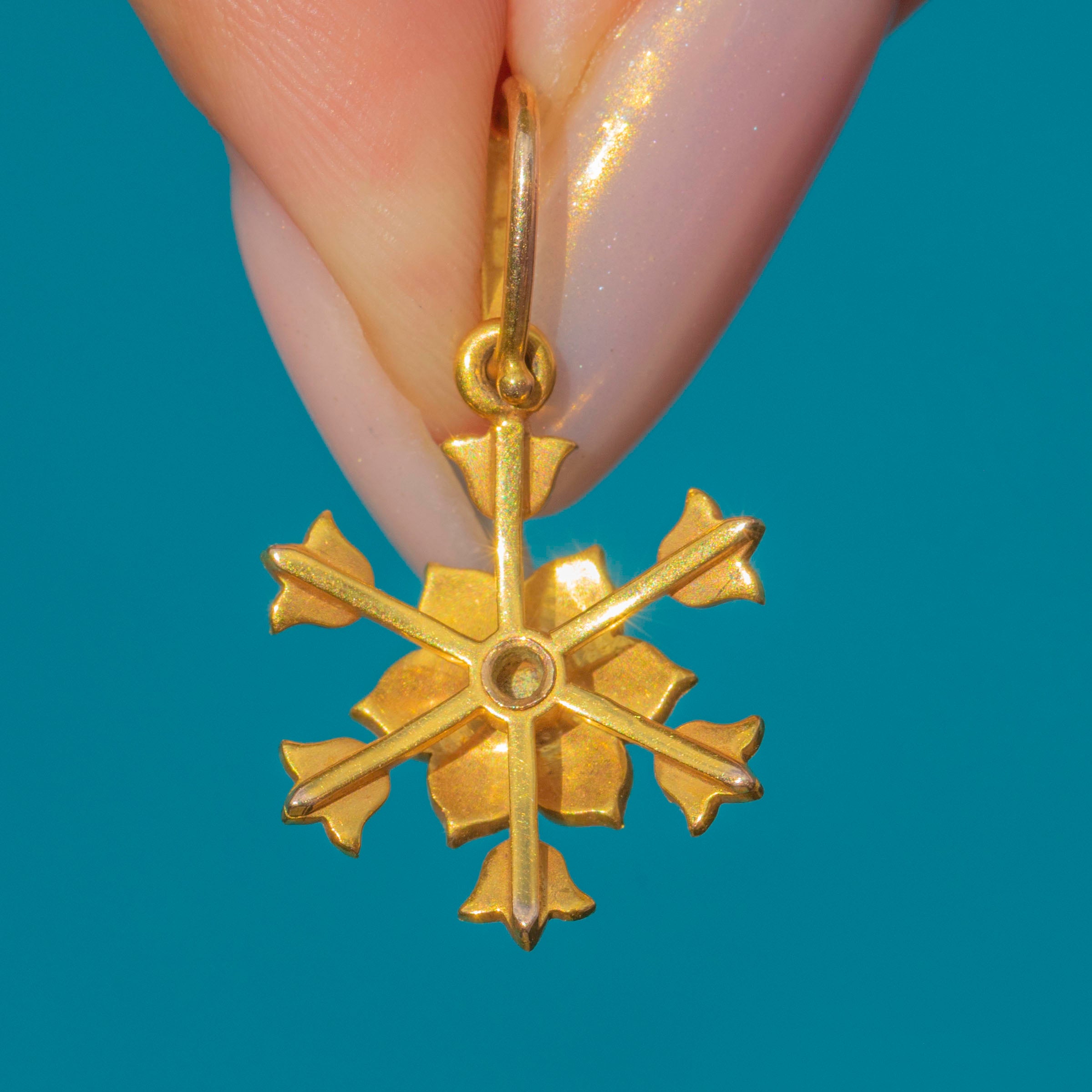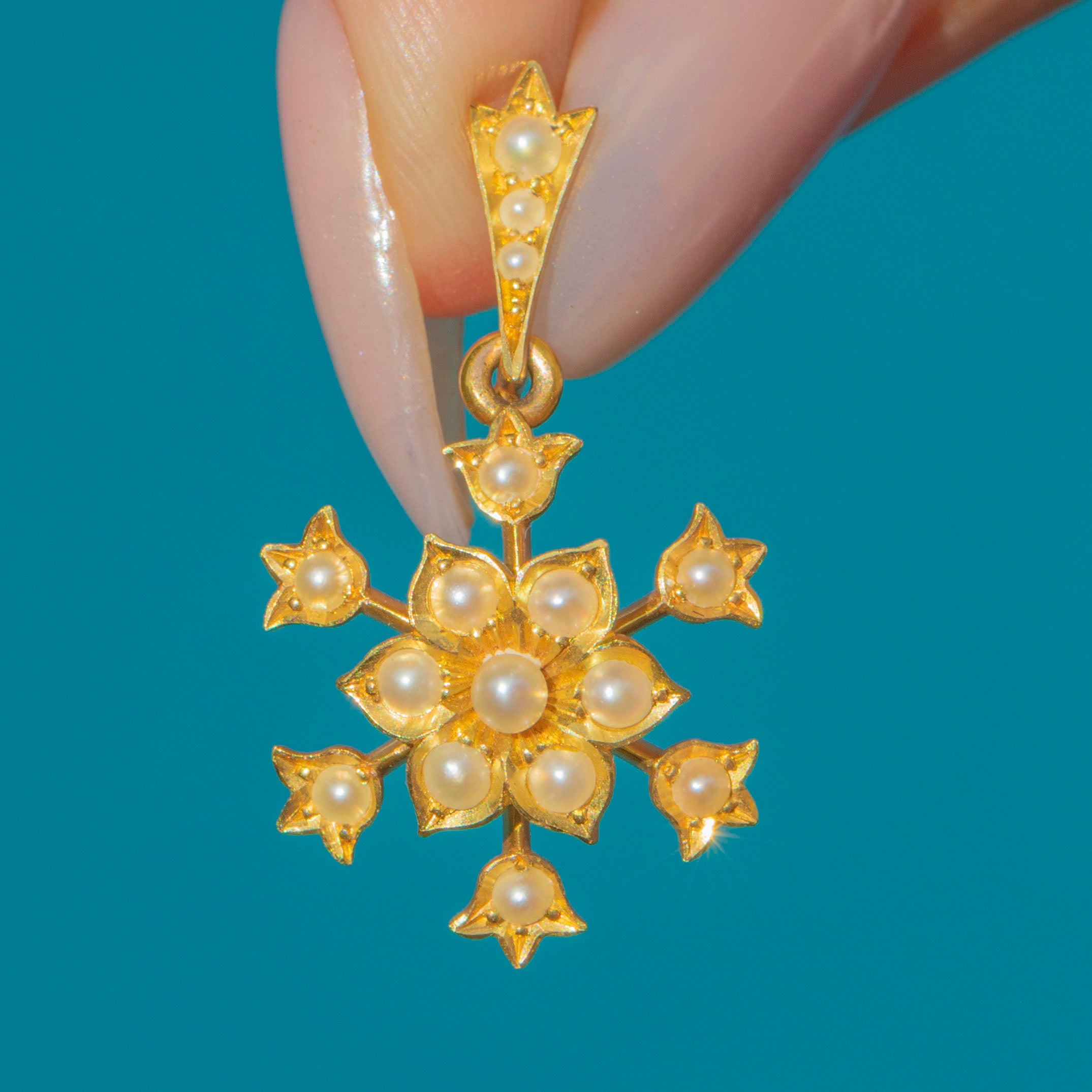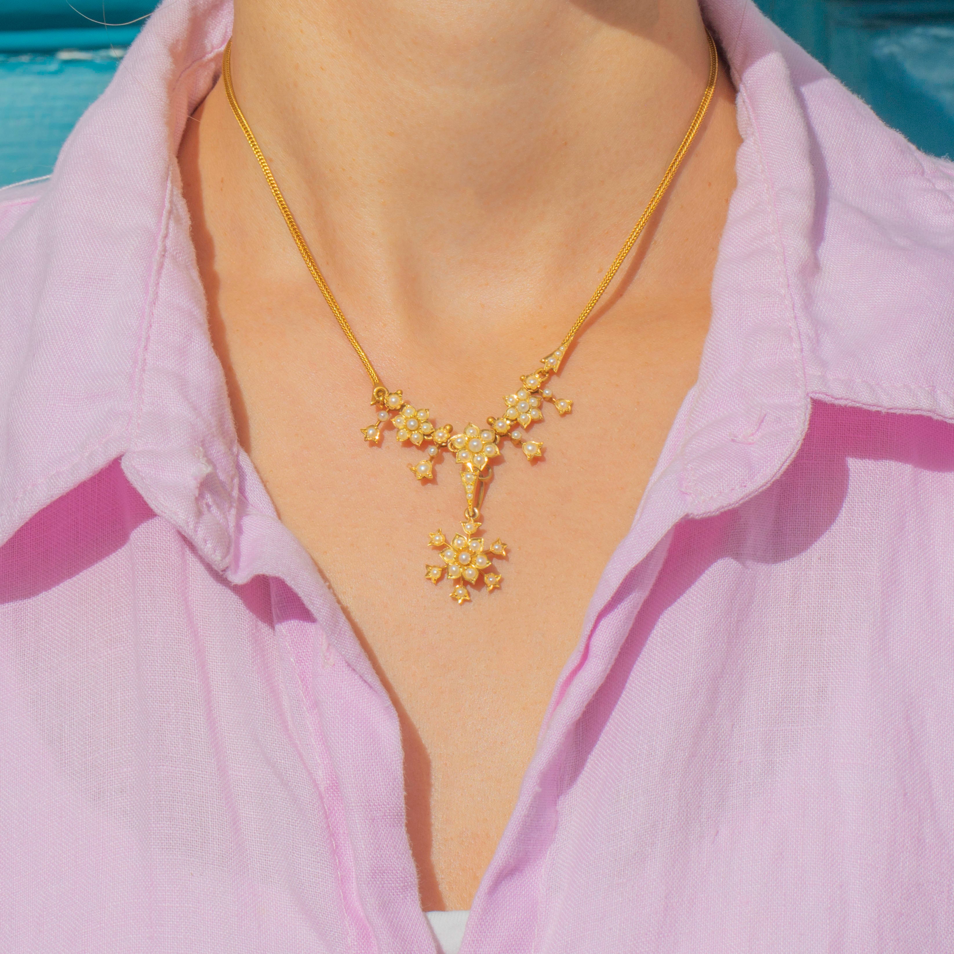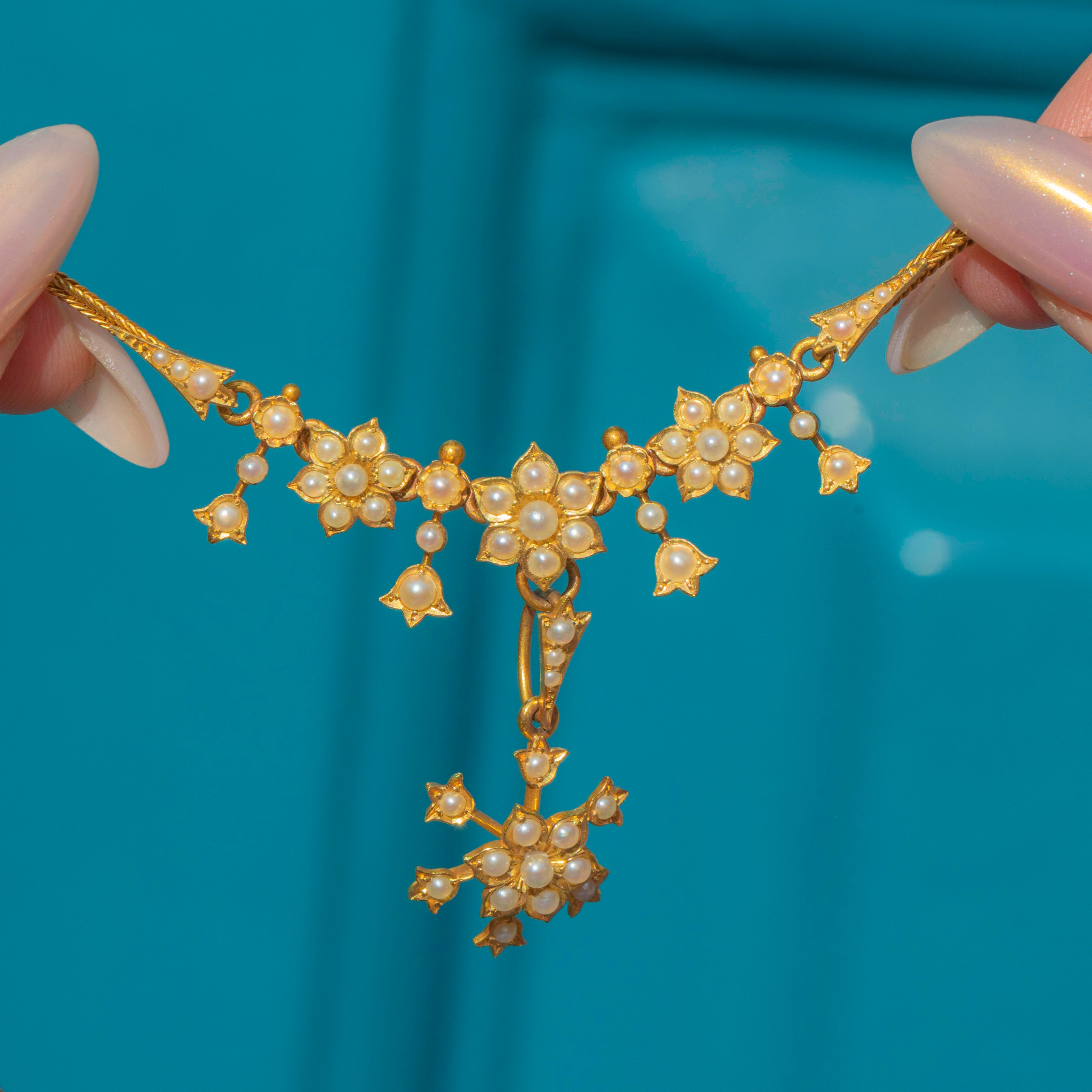 This exquisite Edwardian necklace is crafted in solid 18ct Gold and set with lustrous natural Pearls arranged in delicate floral motifs. The centrepiece features a detachable flower-shaped pendant that can be worn on or off the chain, adding versatility to the design. Each tiny Pearl is set with precision, creating a soft shimmer that captures the refined beauty of early 20th-century jewellery.
