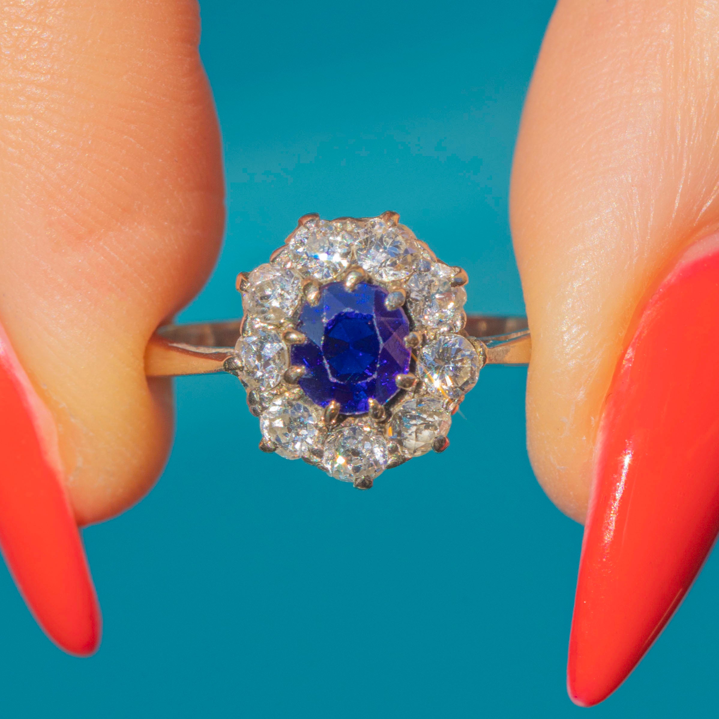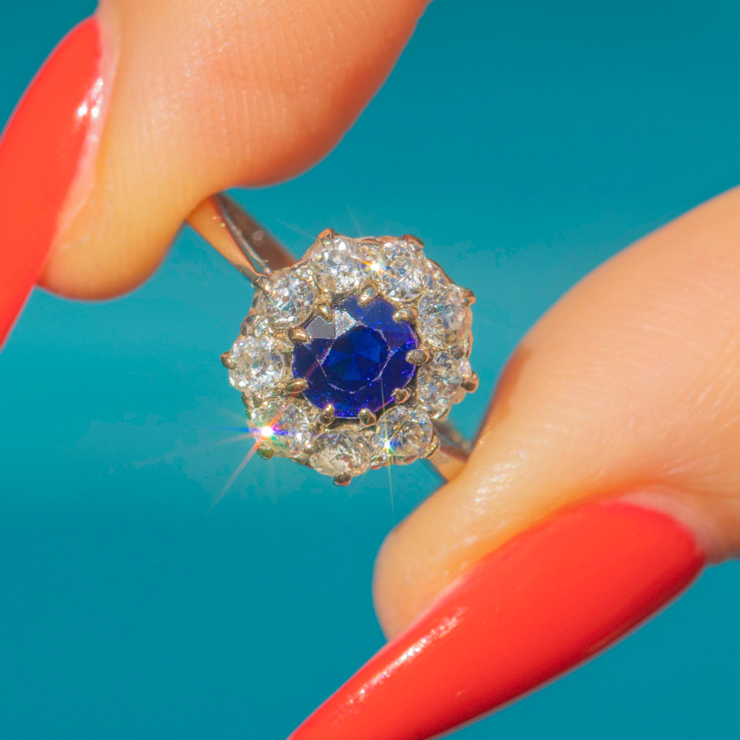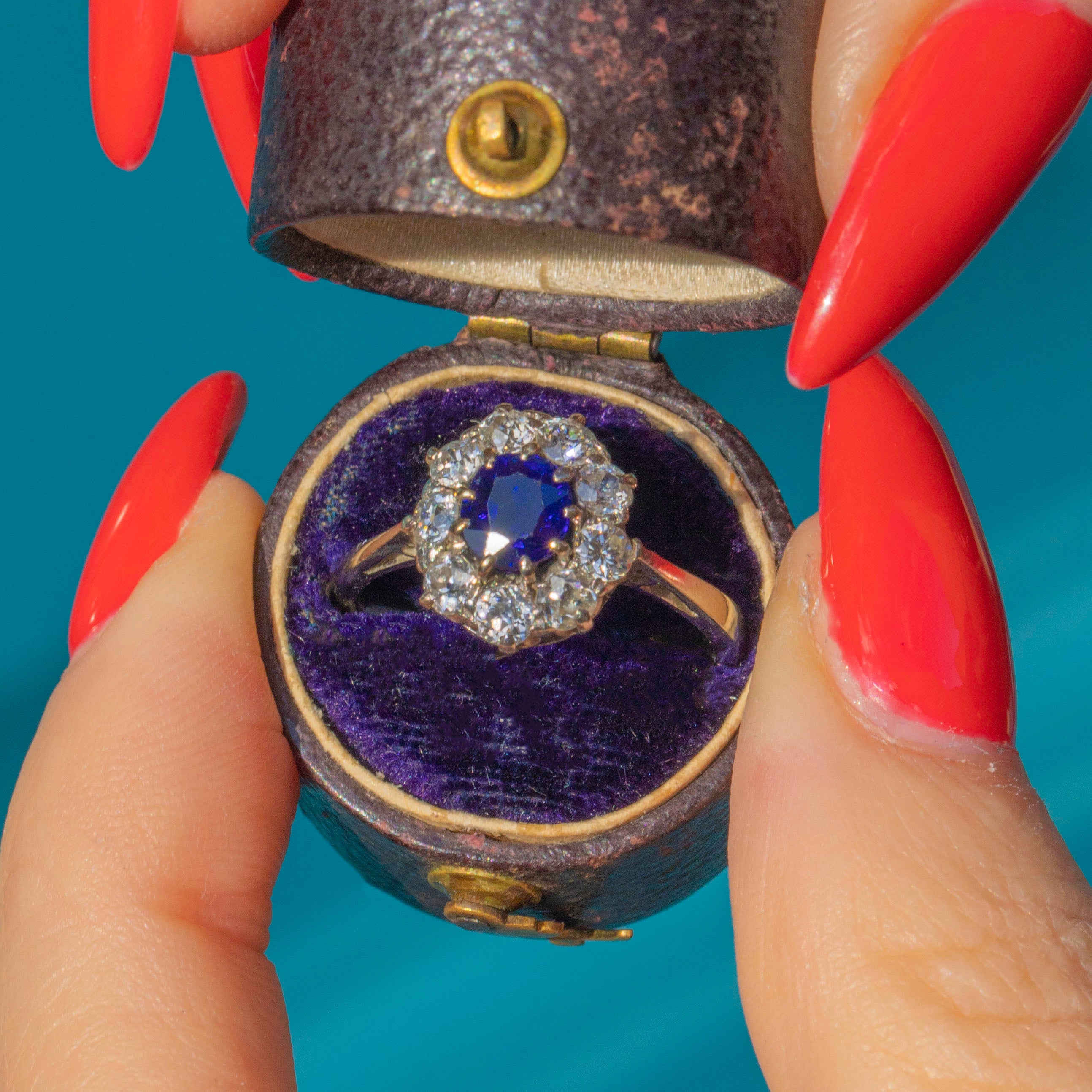 This is an exquisite antique Edwardian 18ct Gold Sapphire and Diamond cluster ring with a beautiful "pop" of colour! At its centre lies a stunning natural royal blue Sapphire, with exquisite saturation and colour... haloed by over half a carat of incredibly bright and sparkly natural old mine Diamonds!!