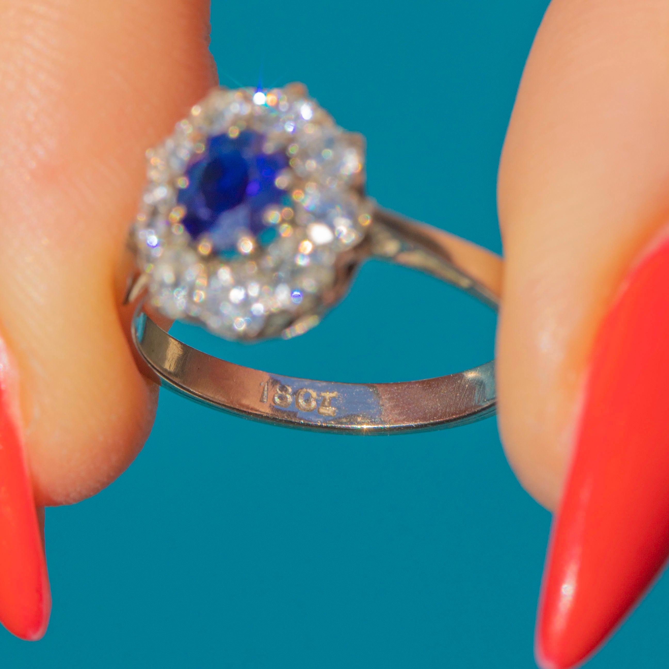 EXCELLENT. This Edwardian 18ct Gold Sapphire and Diamond cluster ring is absolutely delightful. The Sapphire is exquisite and boasts a richly saturated hue, free from chips or abrasions. The Diamonds are secure within their settings and sparkle brilliantly. The ring band is robust and her 18ct Gold has a lovely luster. The settings are in pristine condition holding all the gemstones securely in place. This timeless antique cluster ring would make a wonderful investment piece to pass down to generations to come!