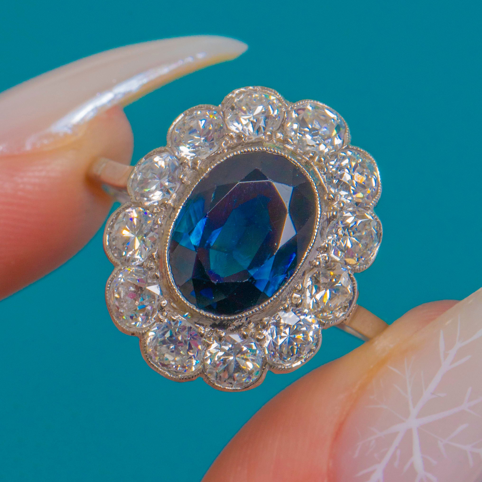Edwardian 18ct White Gold 2.30ct Natural Sapphire & Diamond Cluster Ring Item added