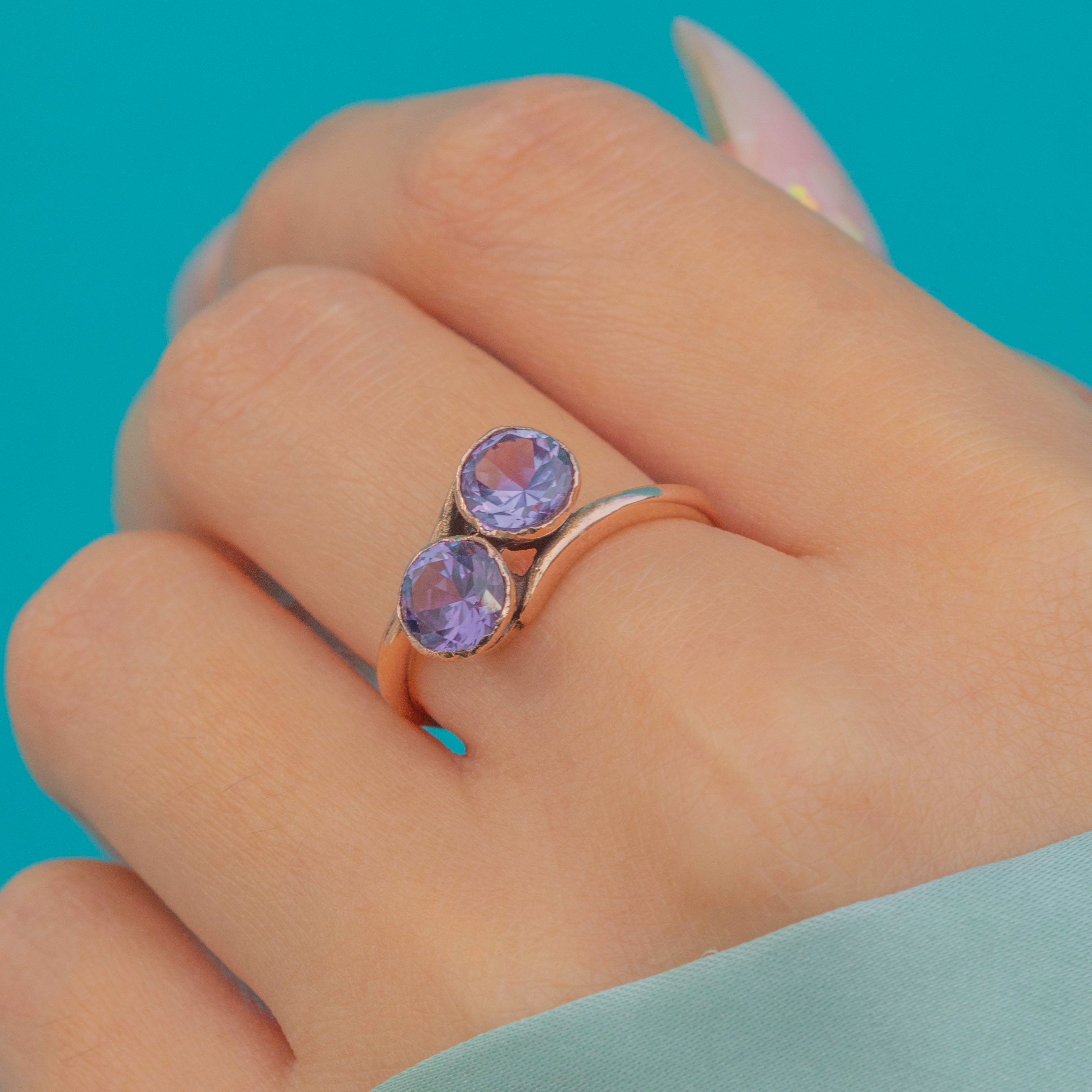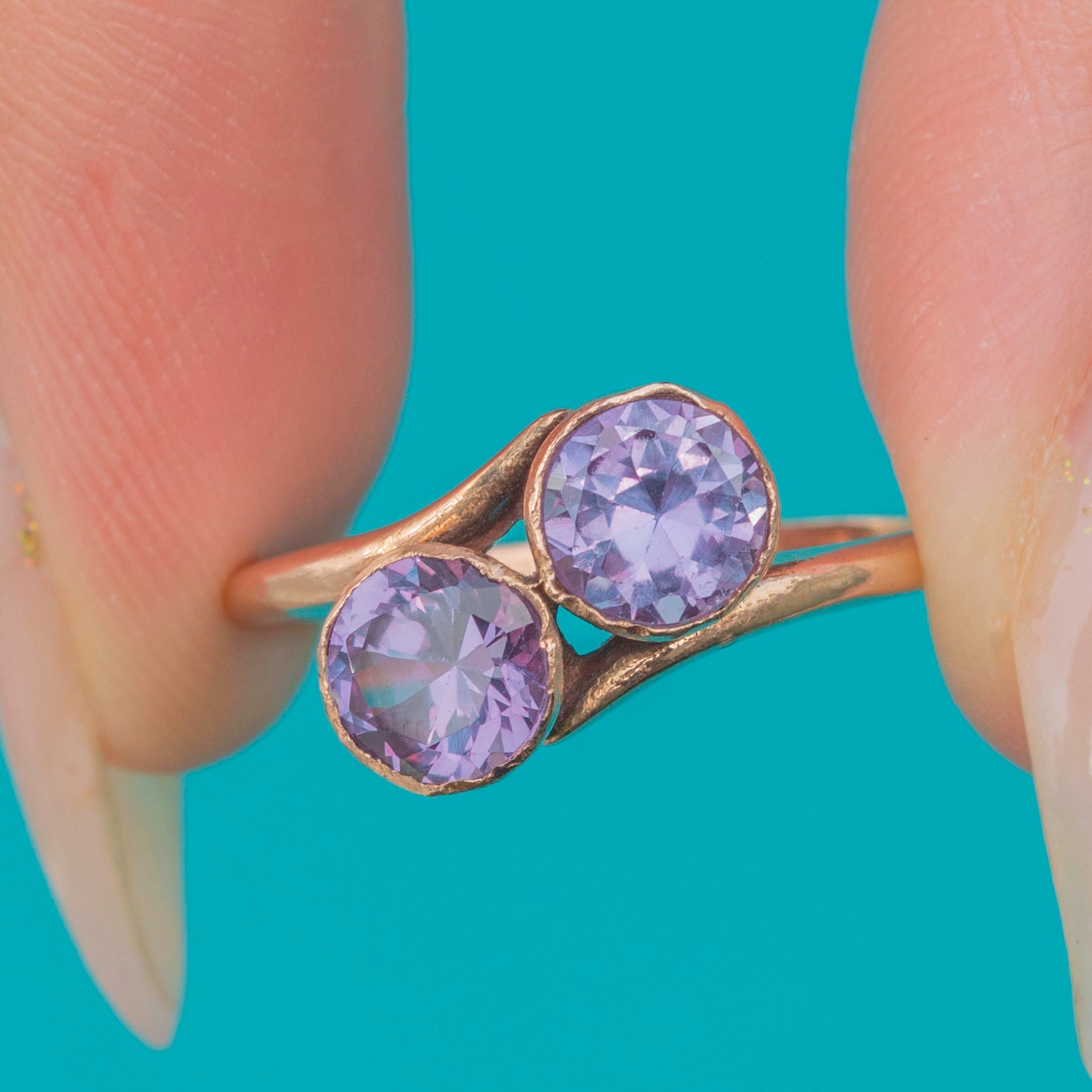 A romantic Edwardian “Toi et Moi” ring, symbolising two souls entwined, crafted in 9ct Gold and set with a pair of captivating lilac to purple colour-change Sapphires. Each round Sapphire is an antique lab-made or “synthetic “ Sapphire, just over 0.50ct each, and shifts in hue depending on the light, ranging from violet to bluish tones, adding a magical and ever-changing character to this antique jewel.