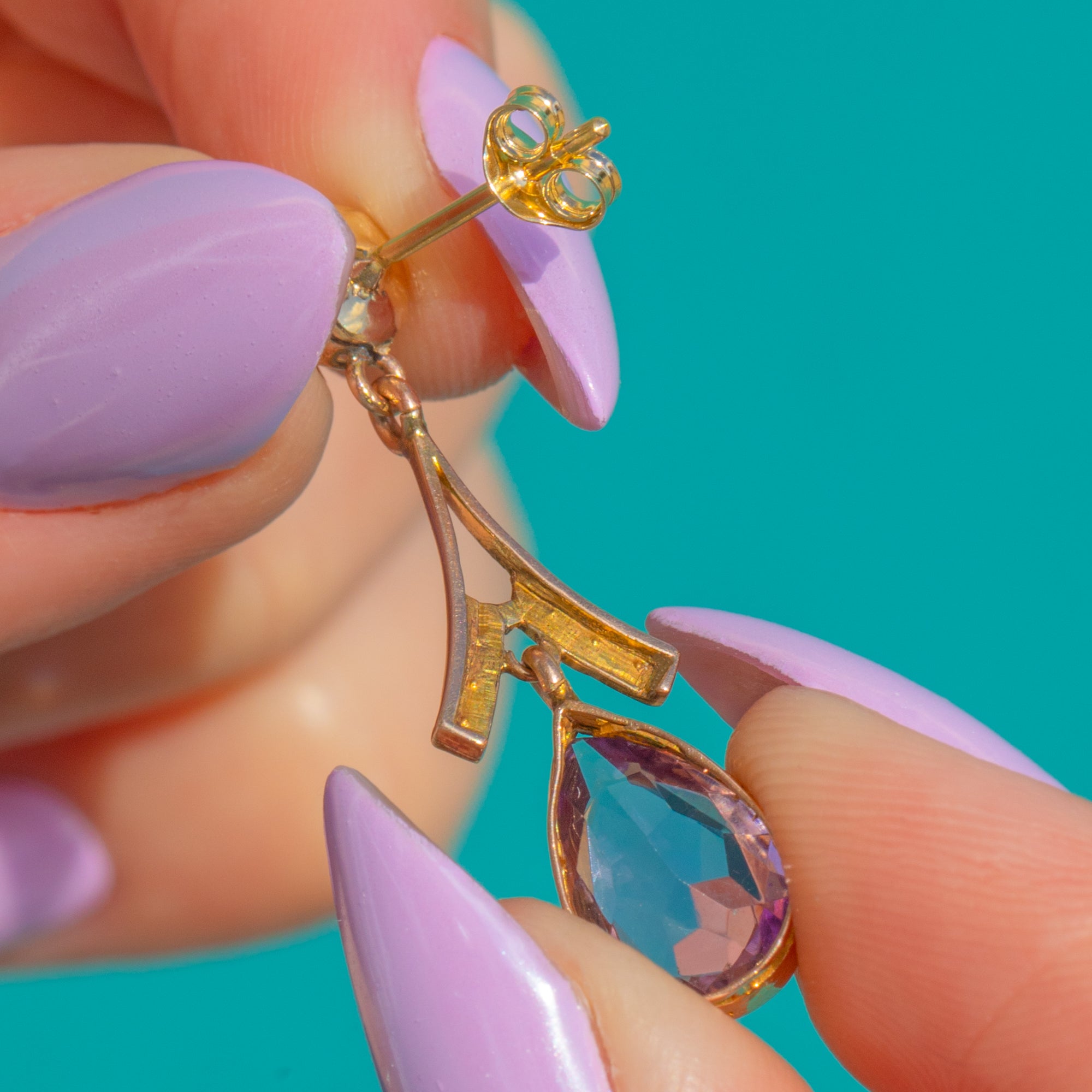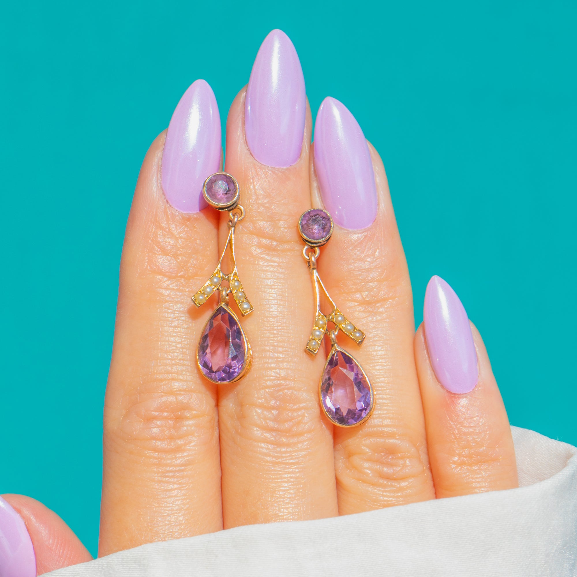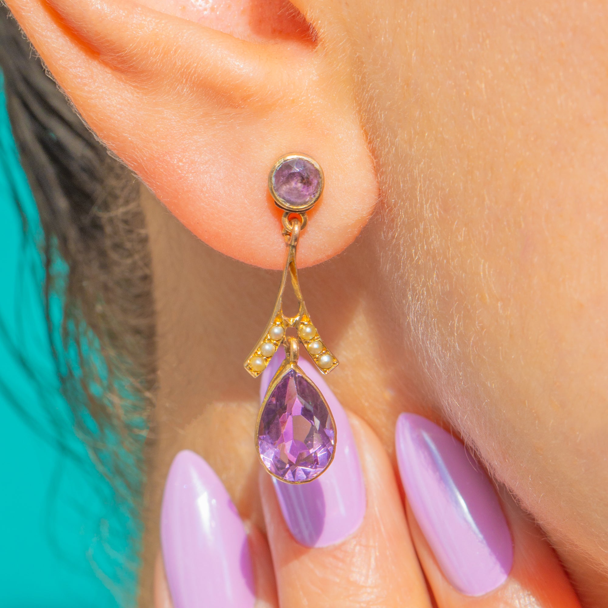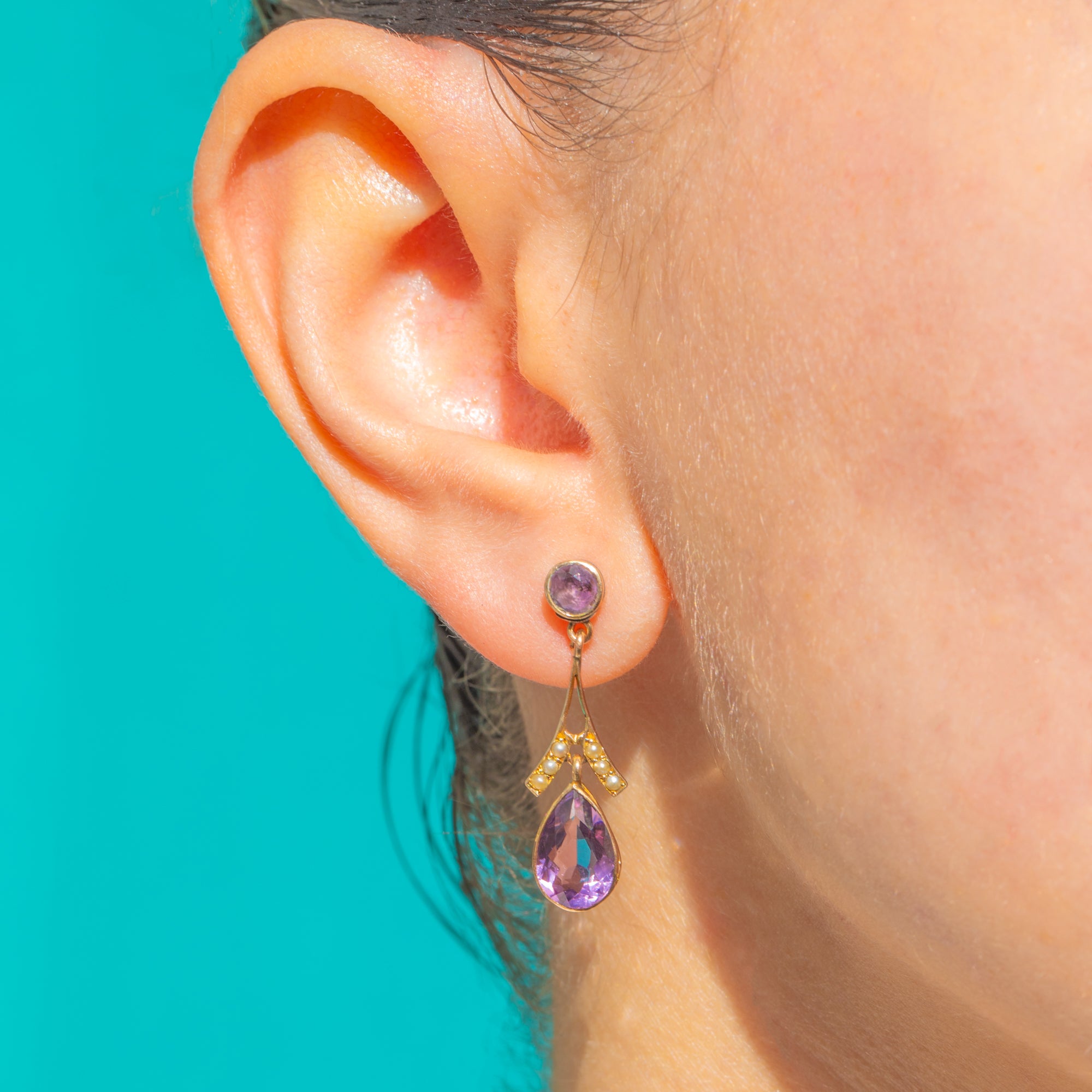 Mühelos elegant vereinen diese Edwardian 9ct Gold-Ohrringe zarte Saatperlen mit majestätischen Amethysten in einer raffinierten, femininen Silhouette. Ein 4 mm runder Amethyst bildet den oberen Abschluss und führt zu einem anmutigen, Y-förmigen Verbindungselement, das mit cremefarbenen Saatperlen verziert ist. Dieses mündet in einen im Zargenfass gefassten, tropfenförmigen Amethyst, der bei jeder Bewegung das Licht einfängt.