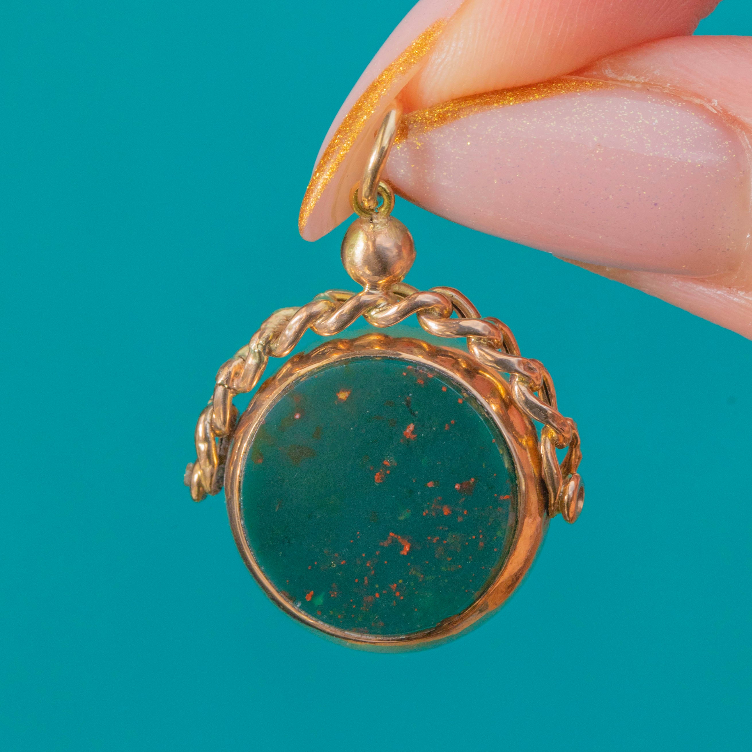 MATERIALS: Tests as 9ct Gold, Bloodstone, Carnelian.