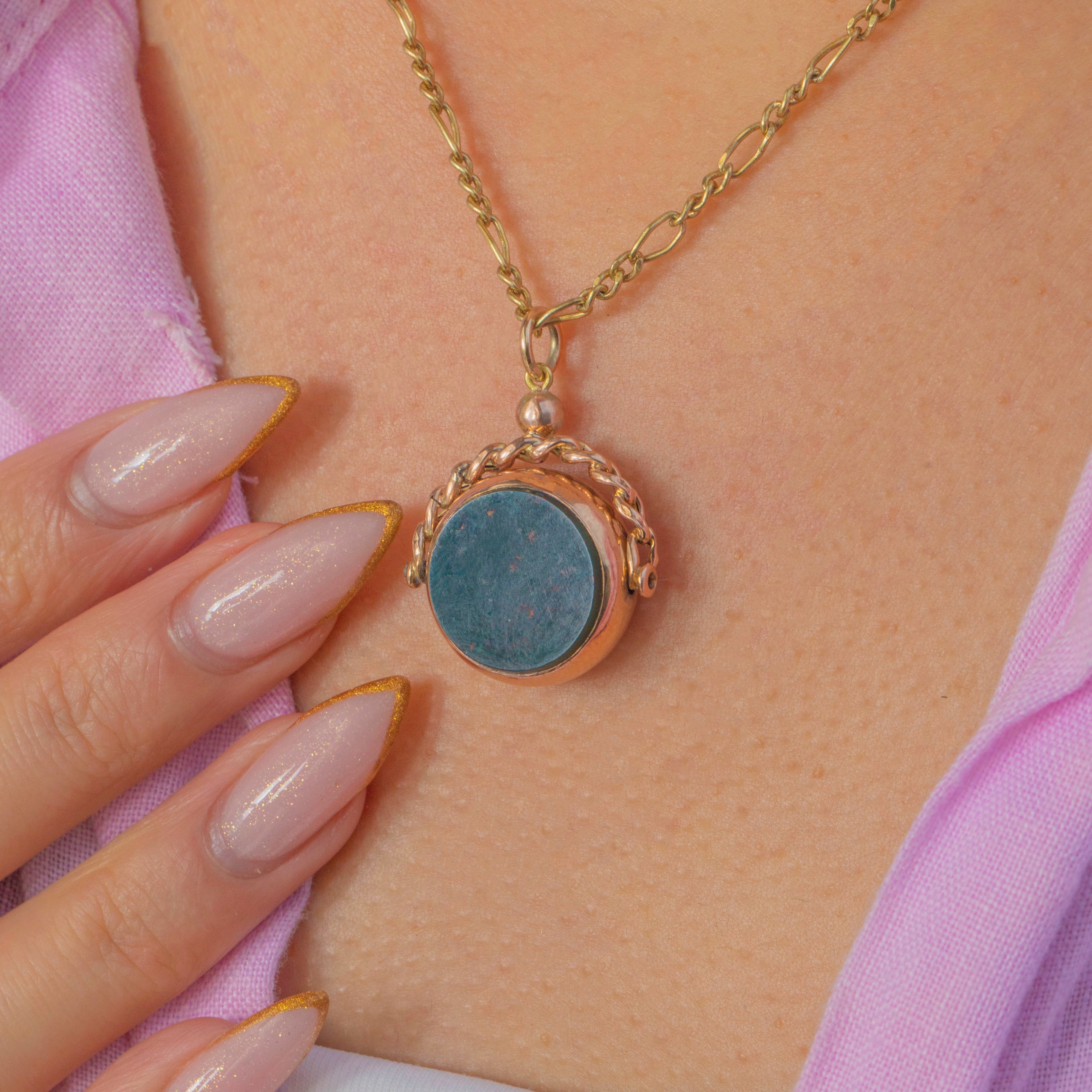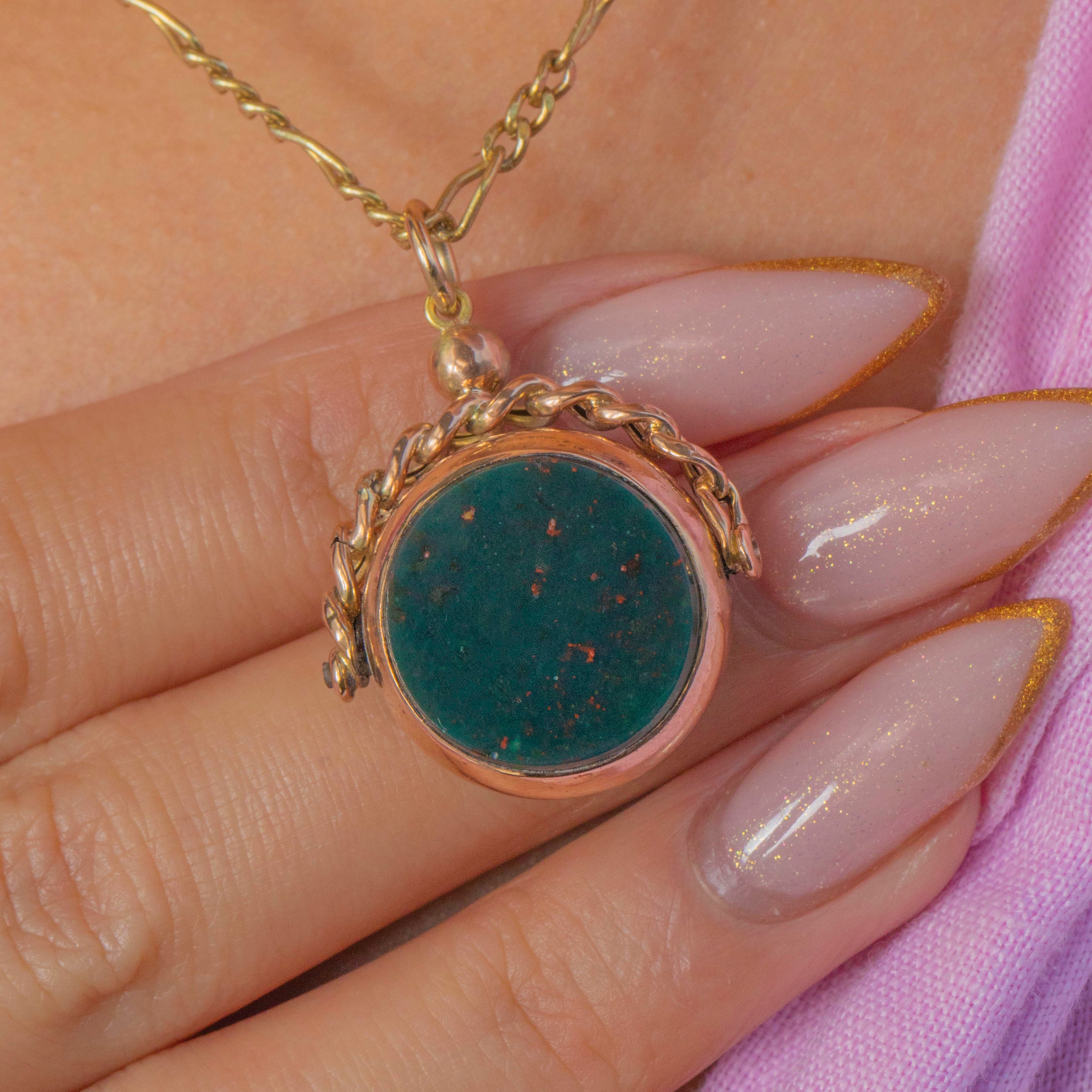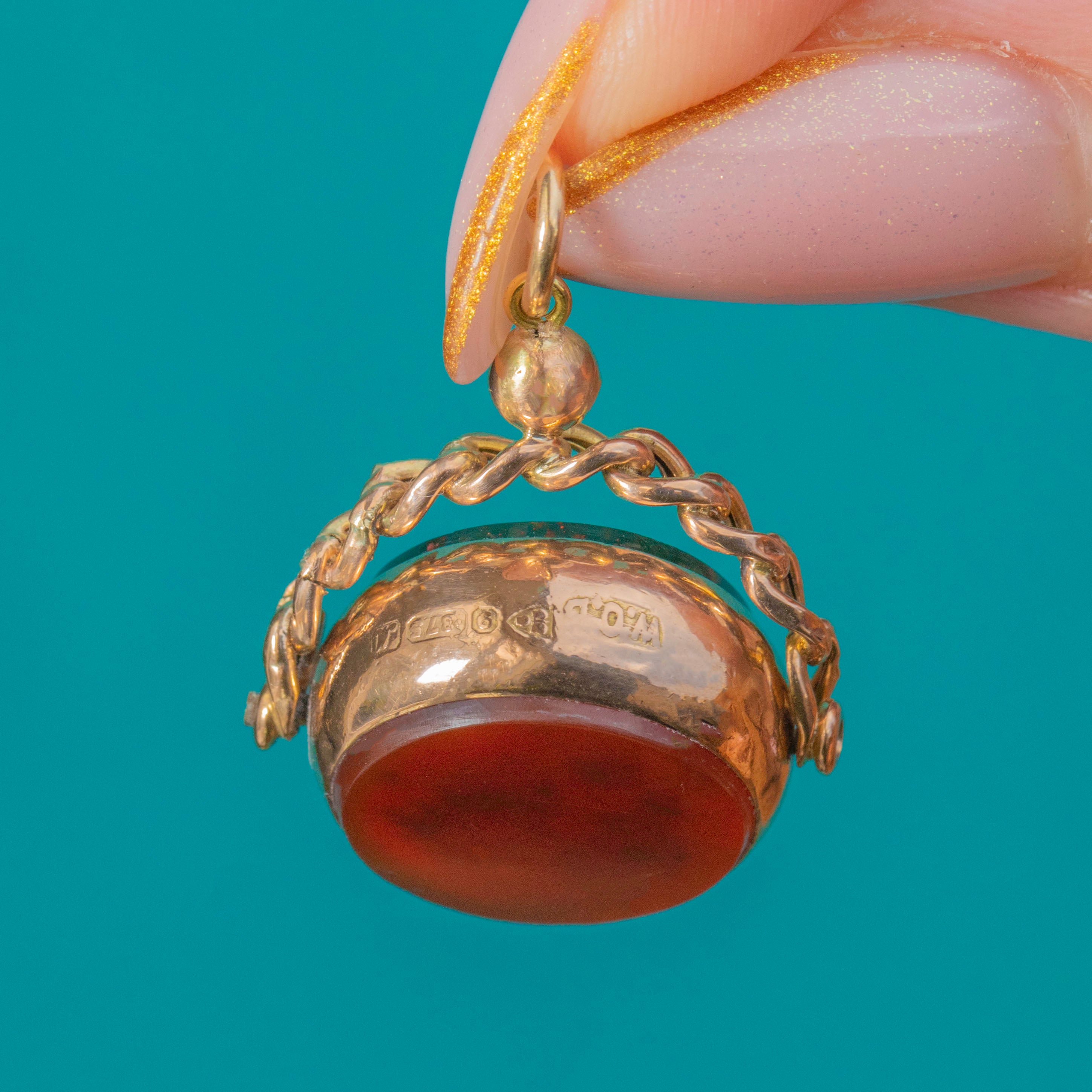 This Edwardian 9ct Gold spinner fob, dated 1912, features a classic combination of deep green Bloodstone on one side and warm orange Carnelian on the other. The rotating design allows it to be worn showing either gemstone, making it a versatile and timeless antique accessory.