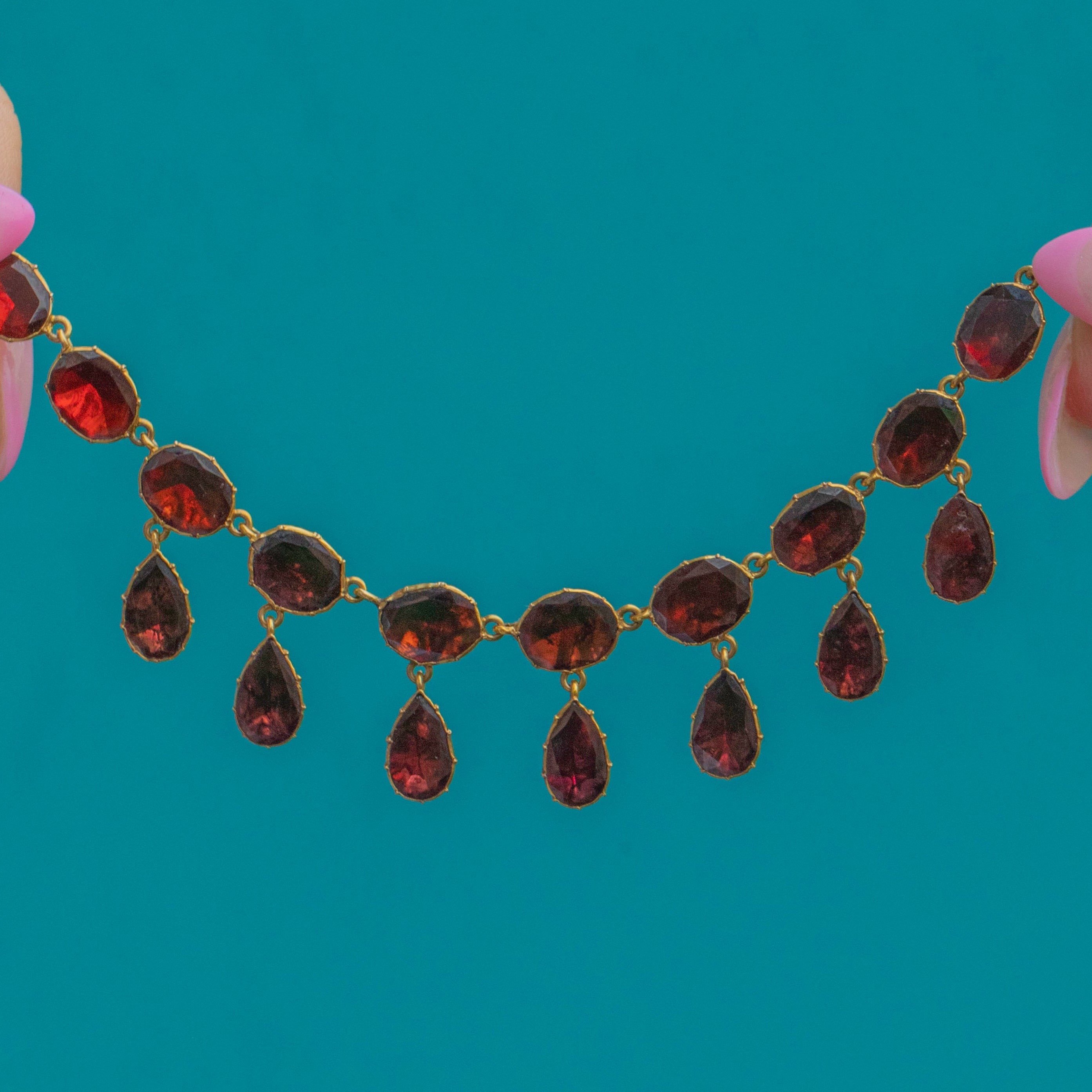 The necklace culminates in pear-shaped Garnets at the centre, adding graceful movement and refined symmetry, a true testament to Edwardian craftsmanship and timeless beauty.